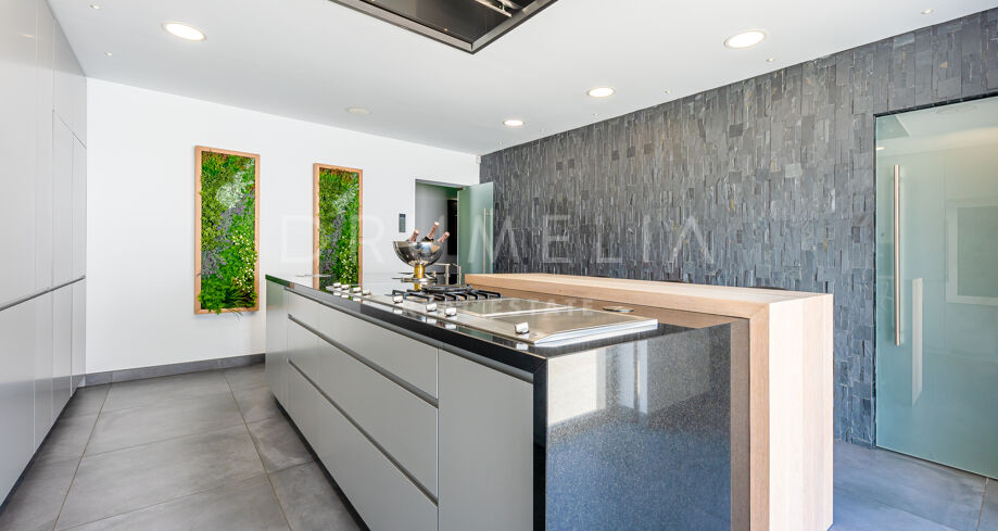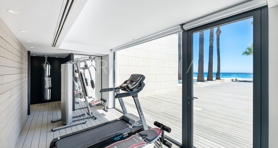 All 4 bedroom suites have their own luxurious bathrooms and independent Domotics; Master suite boasts a sauna and Jacuzzi. Waking up to the soothing sound of the waves, fountain water and whispering palms would be pure bliss! An inspiring ergonomic kitchen has sleek flat-panel cabinets, top-quality Miele appliances, an island with informal dining area, a wine cooler and a pantry. The tremendous house features an office with ethnic chic details, 3 guest toilets, laundry room and a storage. The garage has space for at least 3 cars; there is an ample outdoor parking for several cars, plus a marine vehicle garage conveniently located next to the beach gate.