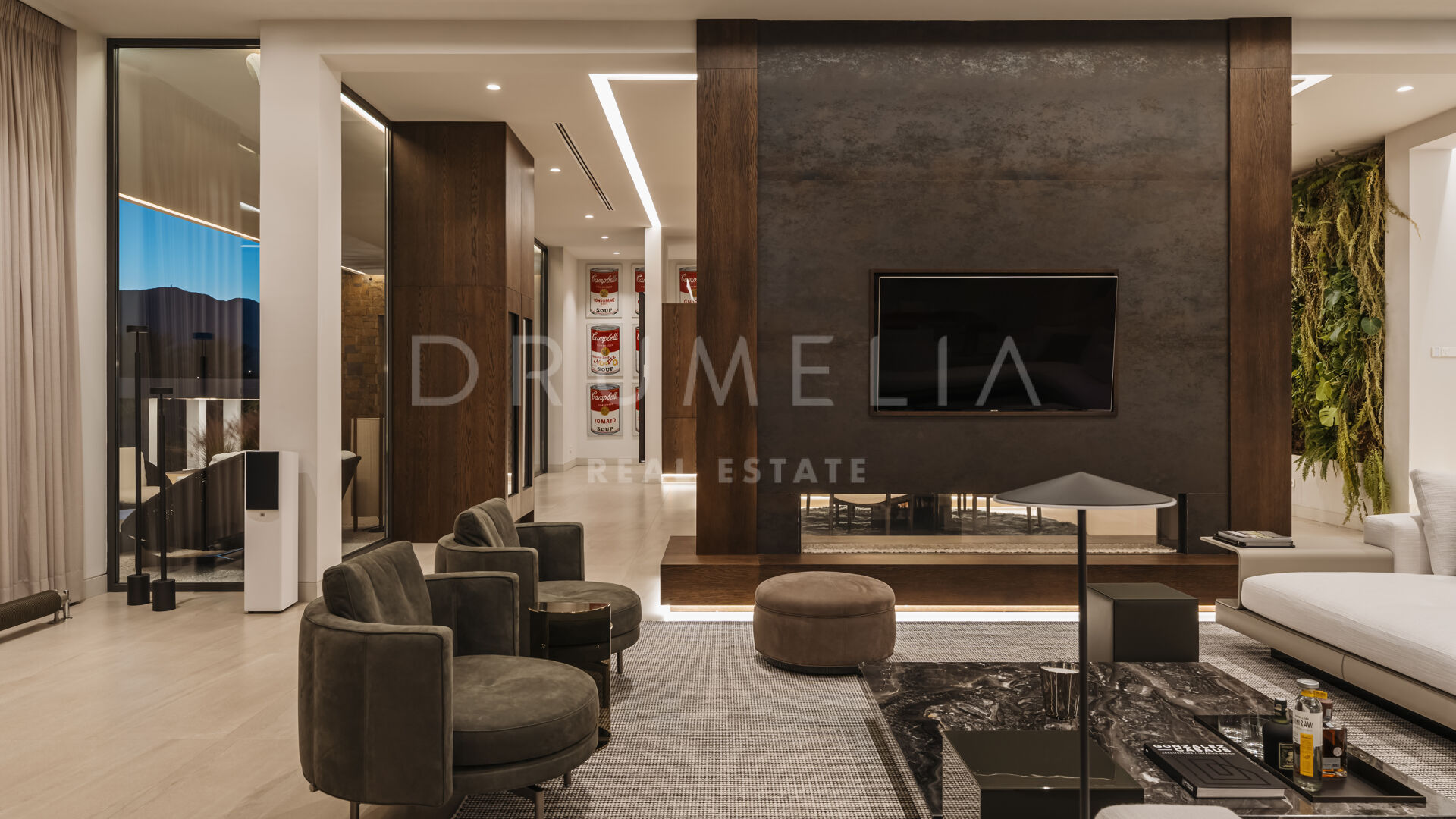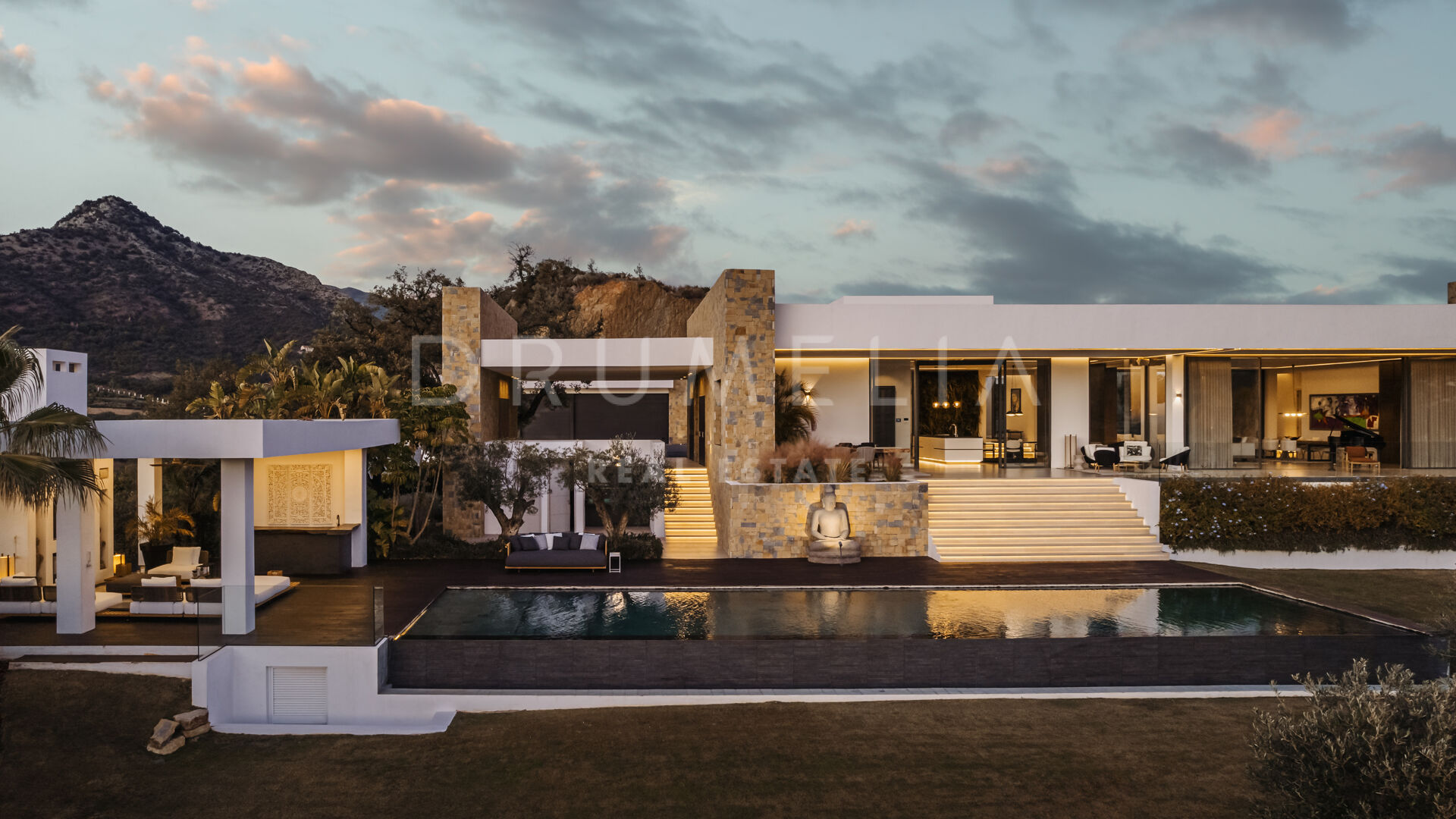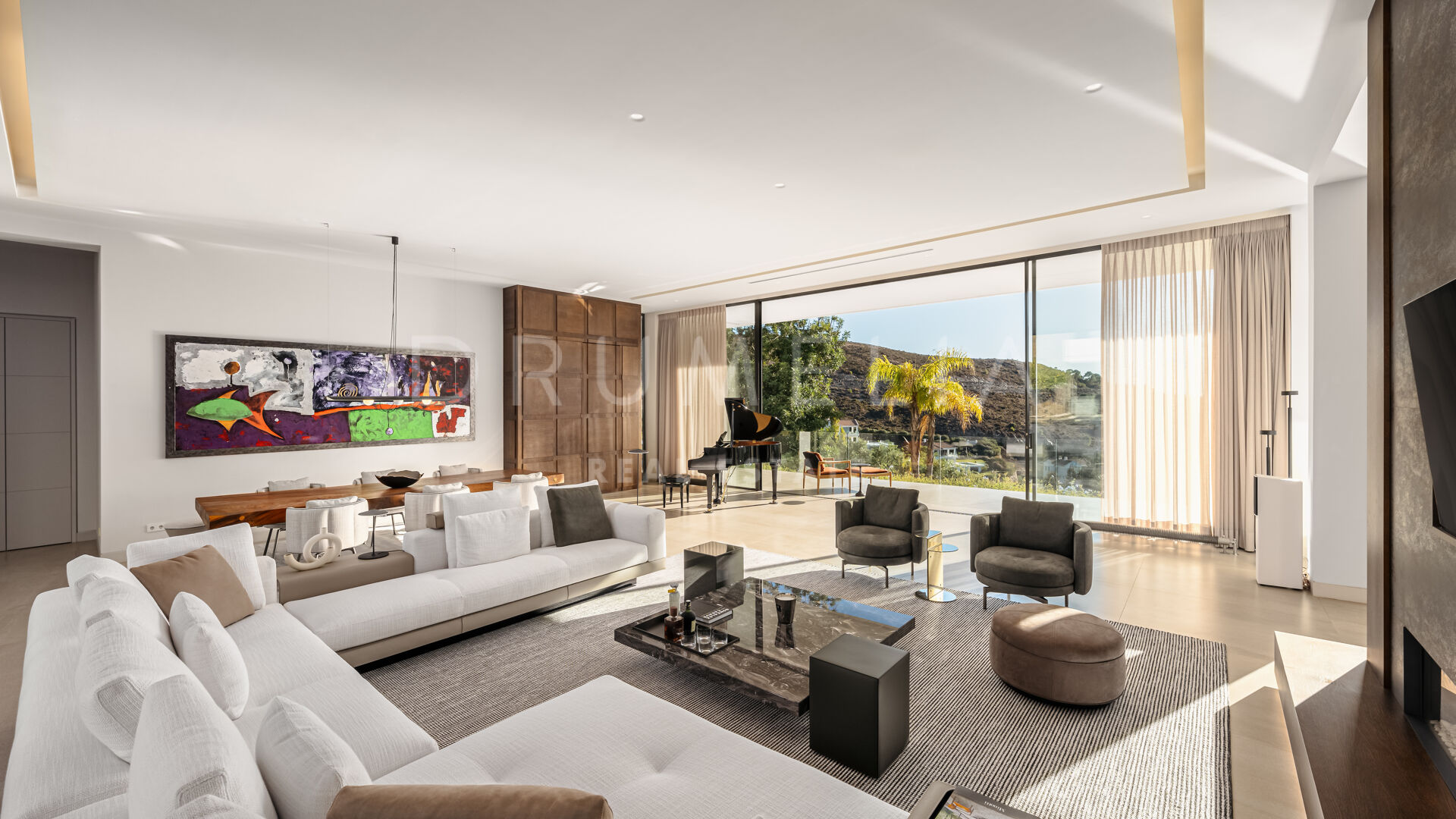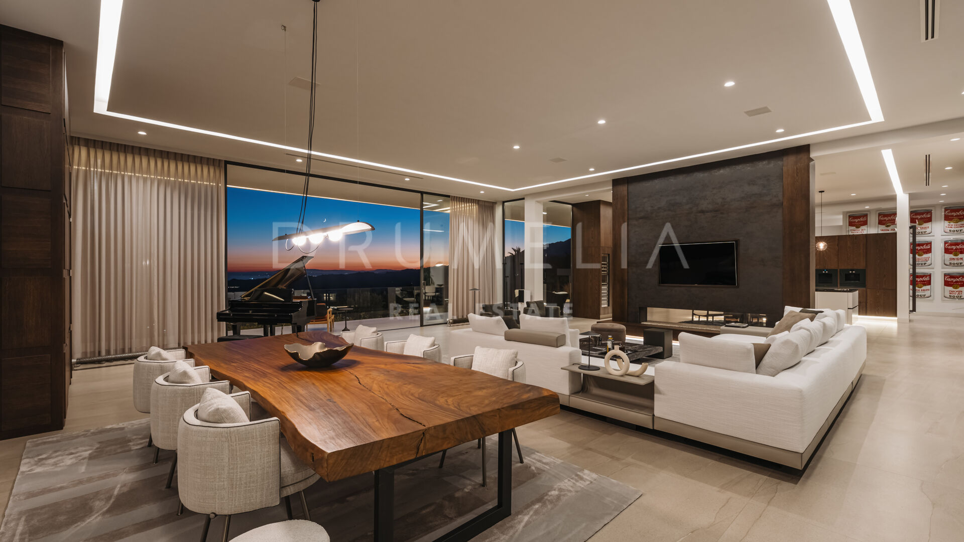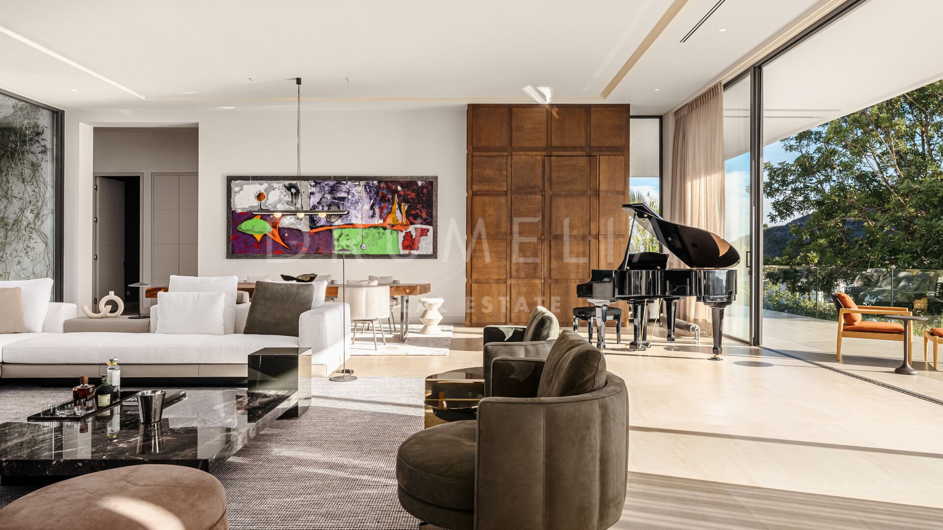 This truly unique property is situated across almost 6,000m2 plot within the prestigious and tranquil setting of the Marbella Club Golf Resort in Benahavis. Set across a single floor, this expansive 1,021m2 home offers incredible south-facing views of the Mediterranean and Gibraltar from its floor-to-ceiling windows and discreet rear terrace.