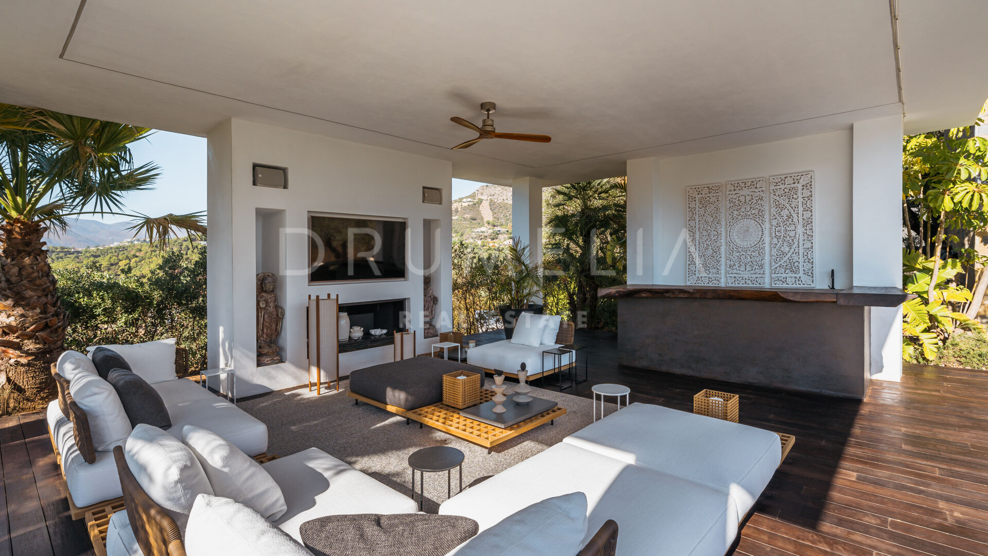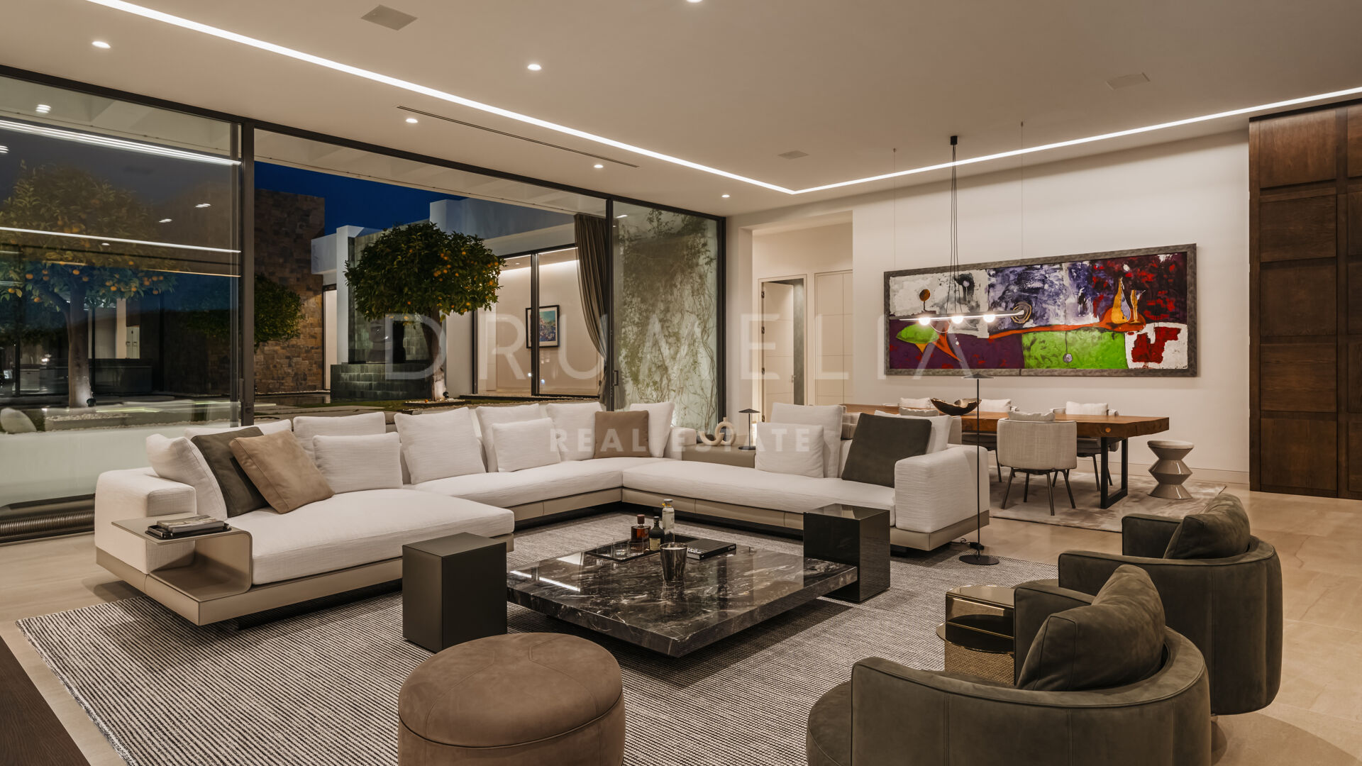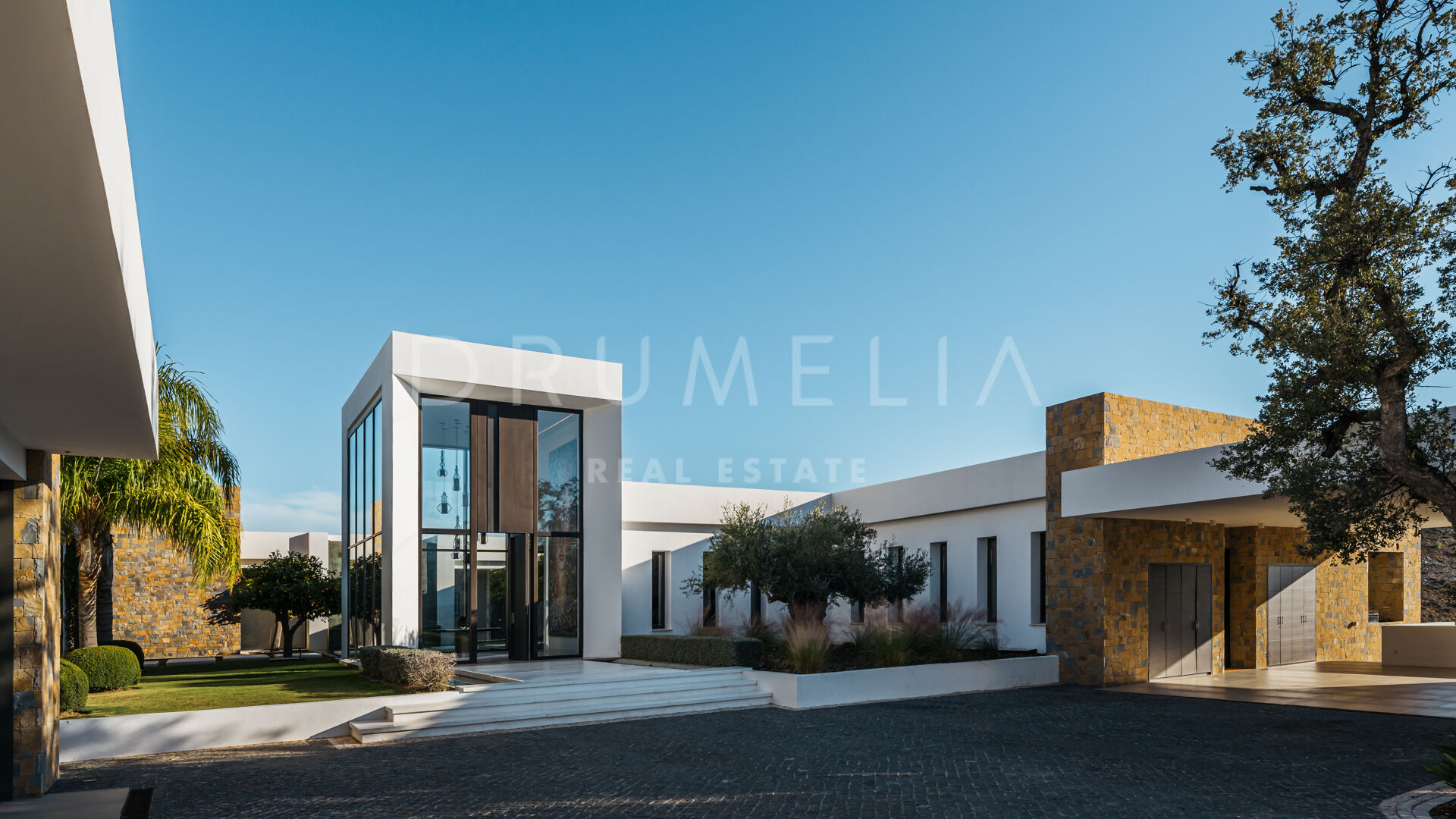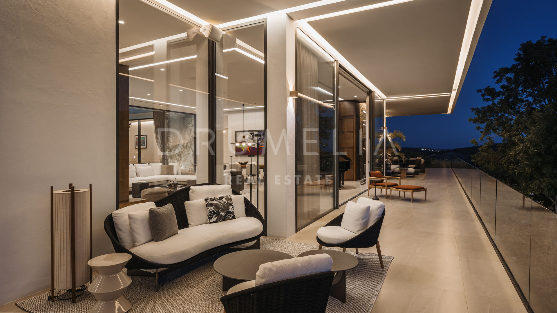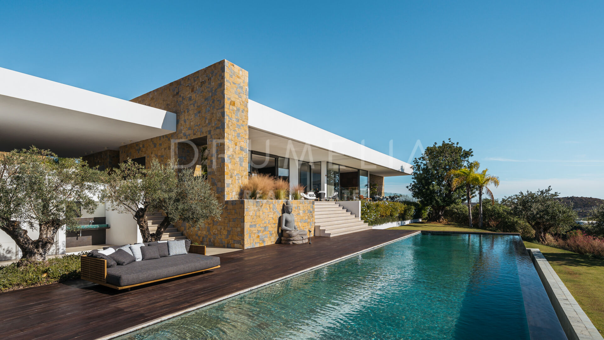 This truly unique property is situated across almost 6,000m2 plot within the prestigious and tranquil setting of the Marbella Club Golf Resort in Benahavis. Set across a single floor, this expansive 1,021m2 home offers incredible south-facing views of the Mediterranean and Gibraltar from its floor-to-ceiling windows and discreet rear terrace.