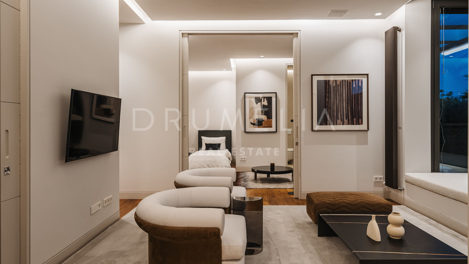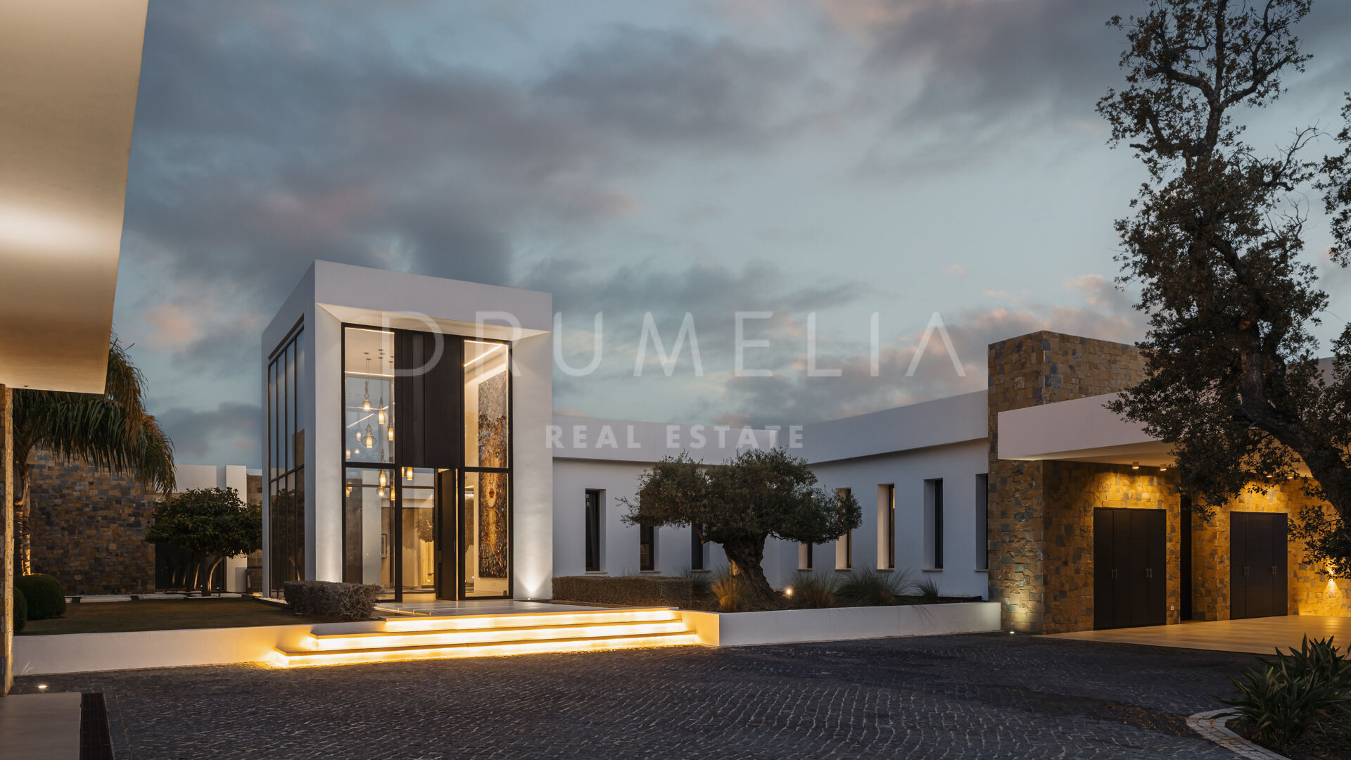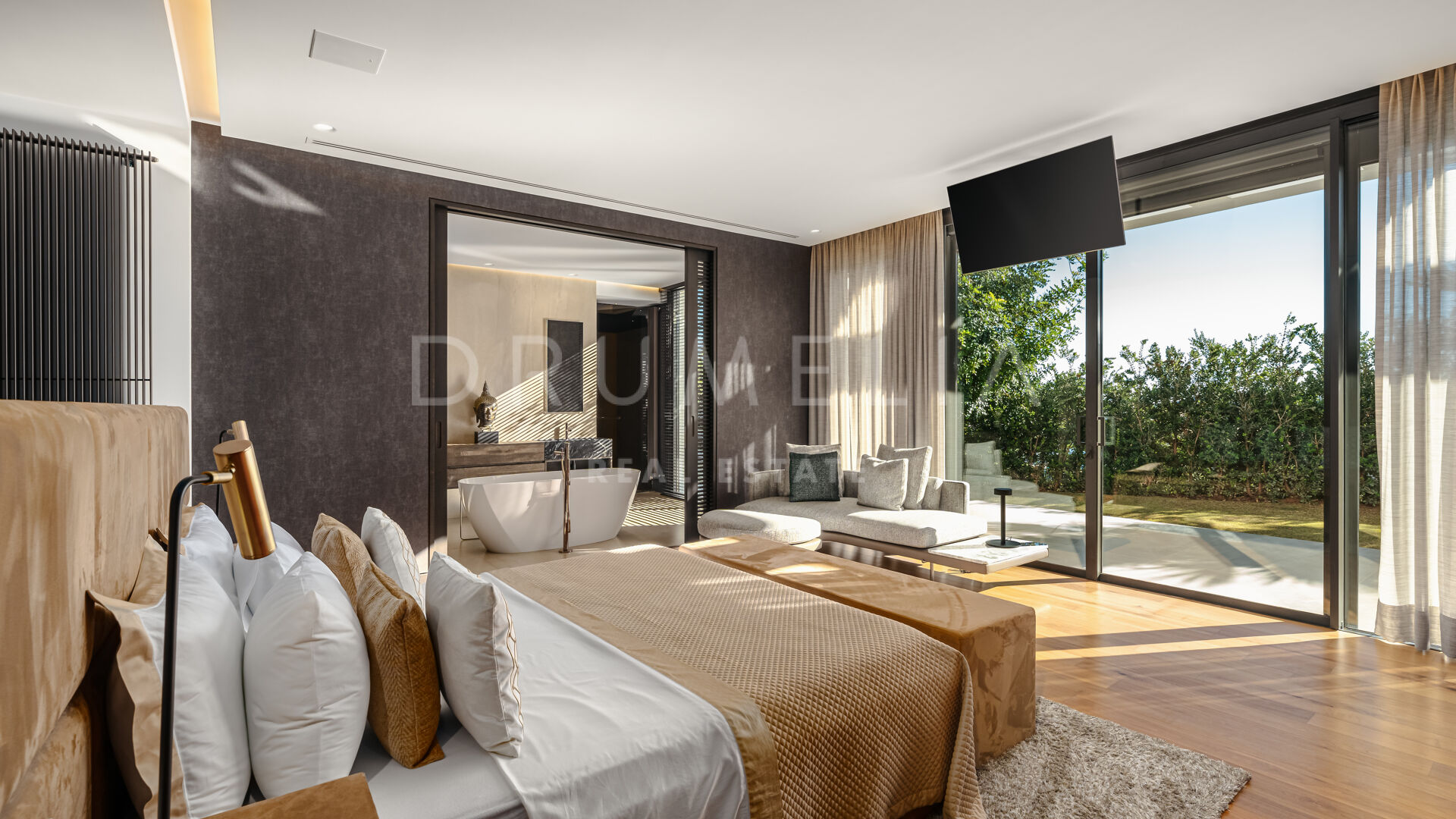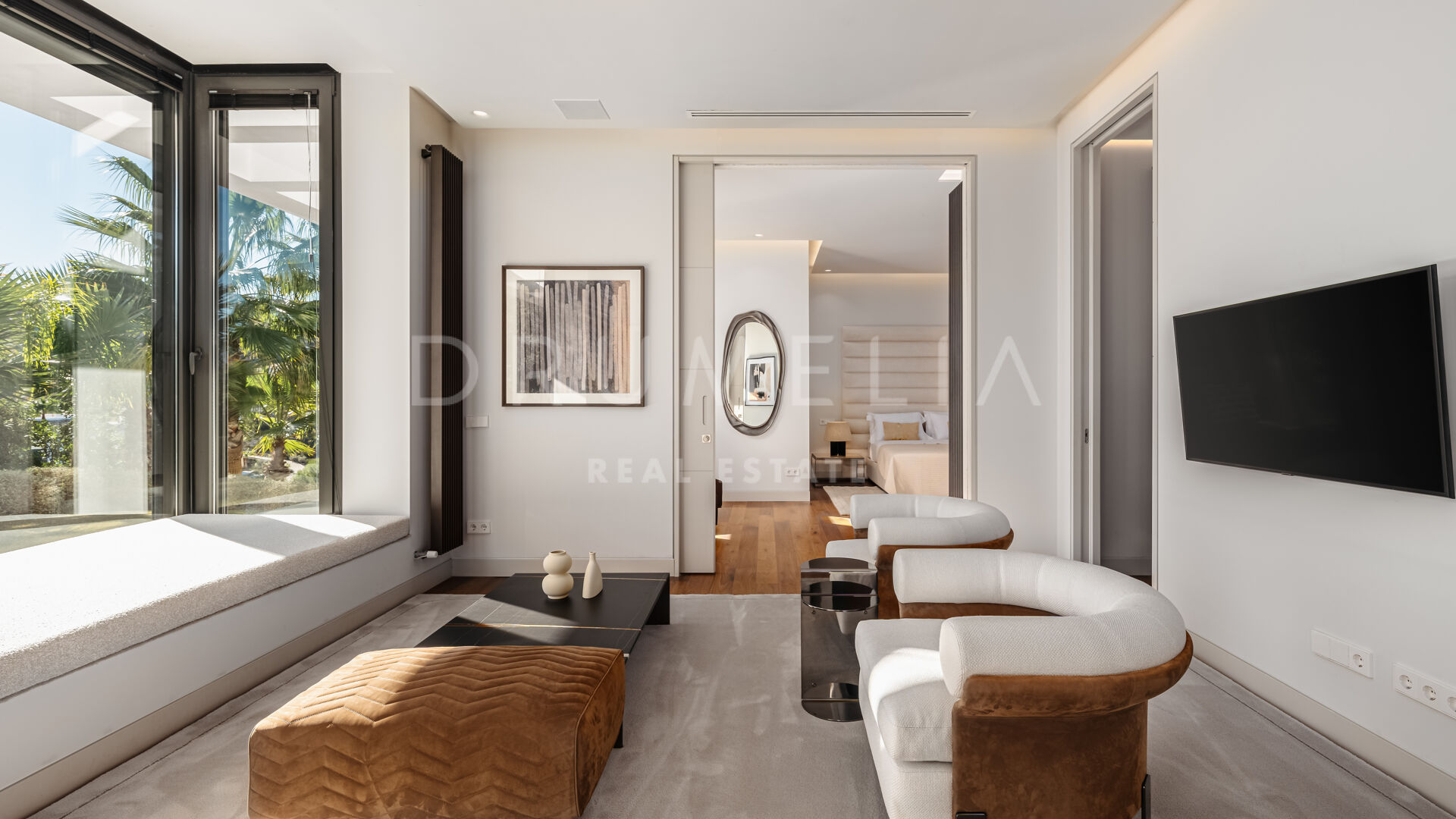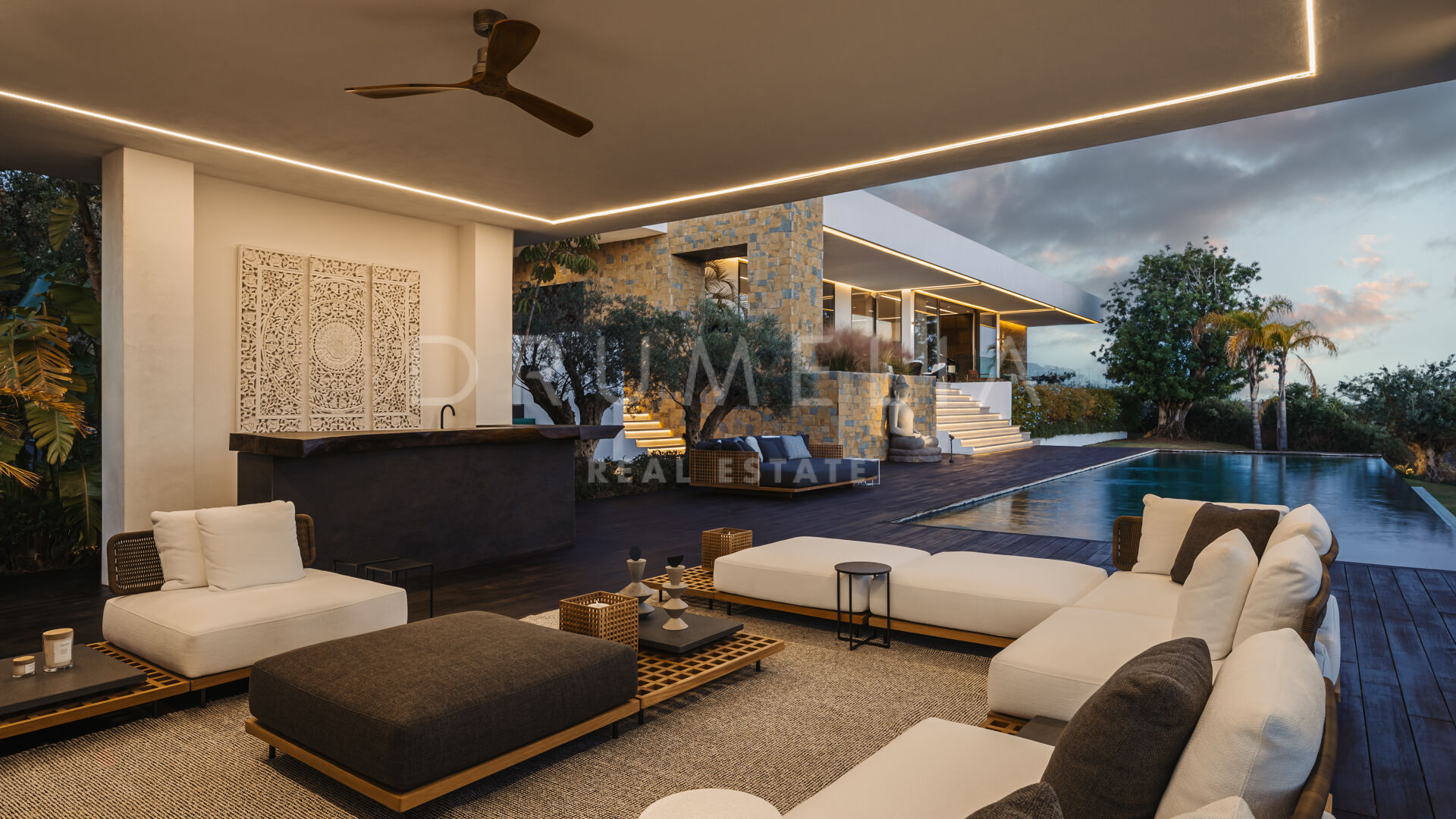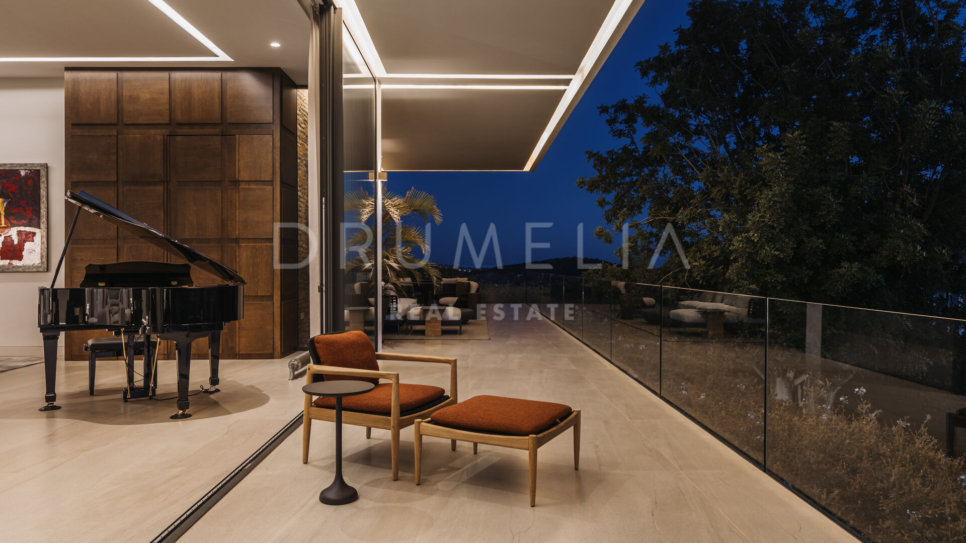This truly unique property is situated across almost 6,000m2 plot within the prestigious and tranquil setting of the Marbella Club Golf Resort in Benahavis. Set across a single floor, this expansive 1,021m2 home offers incredible south-facing views of the Mediterranean and Gibraltar from its floor-to-ceiling windows and discreet rear terrace.