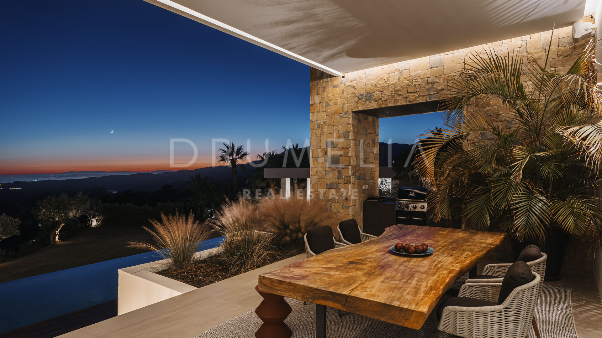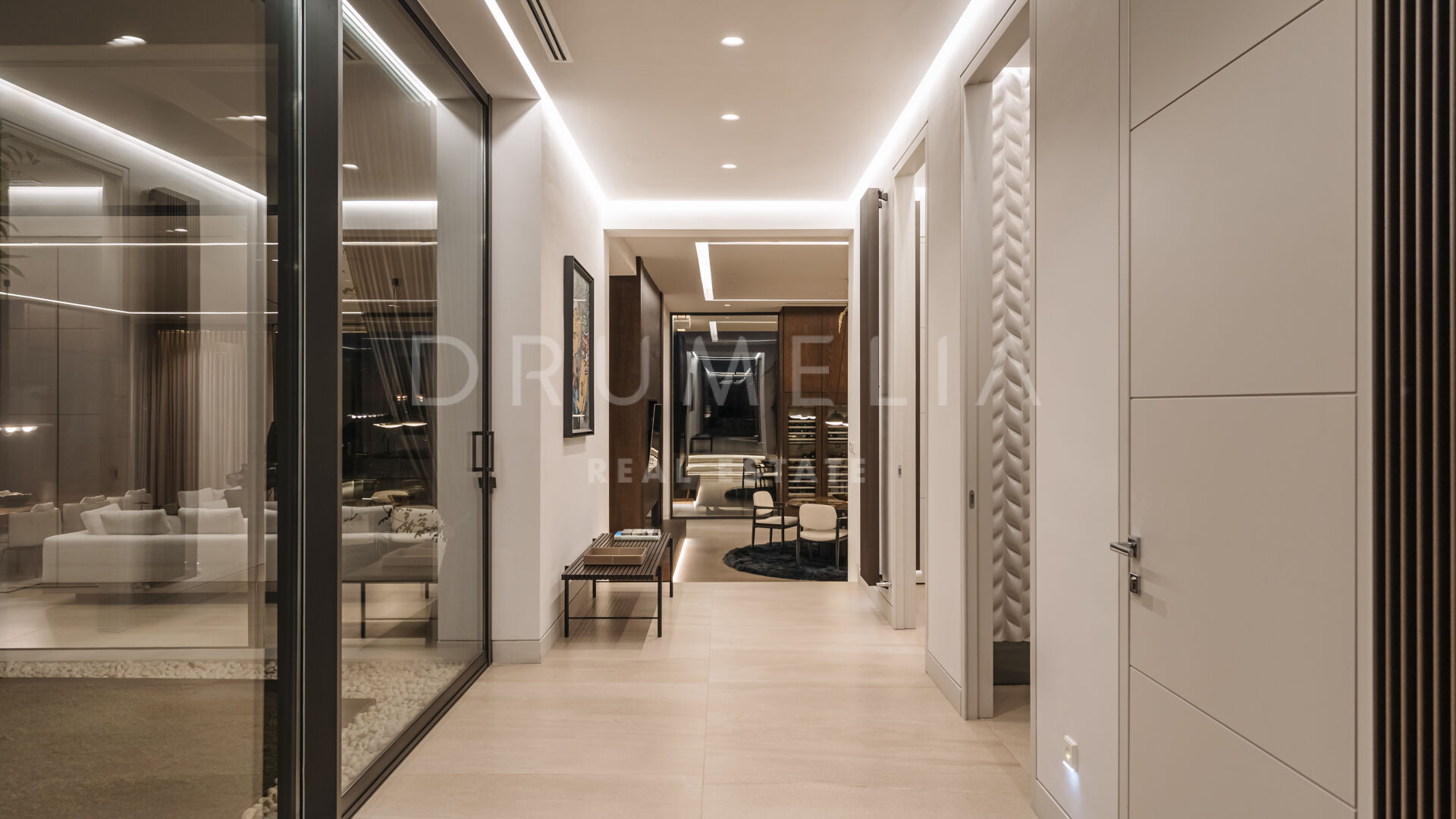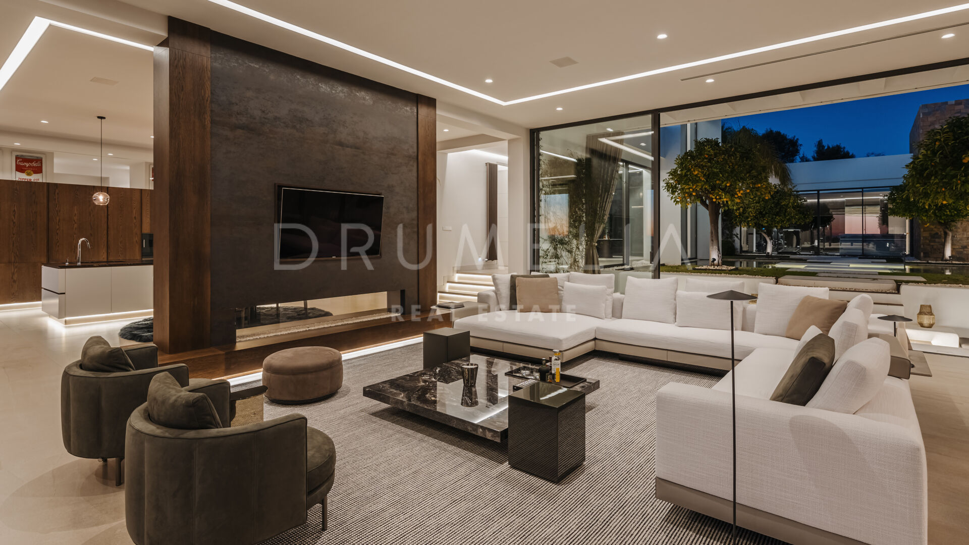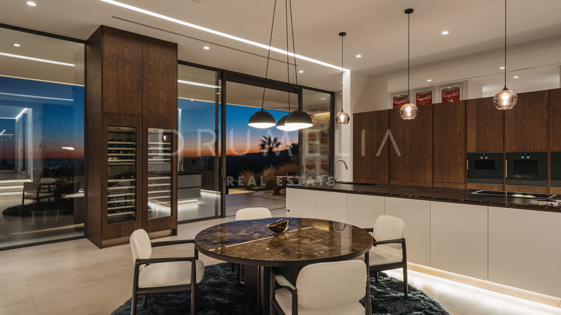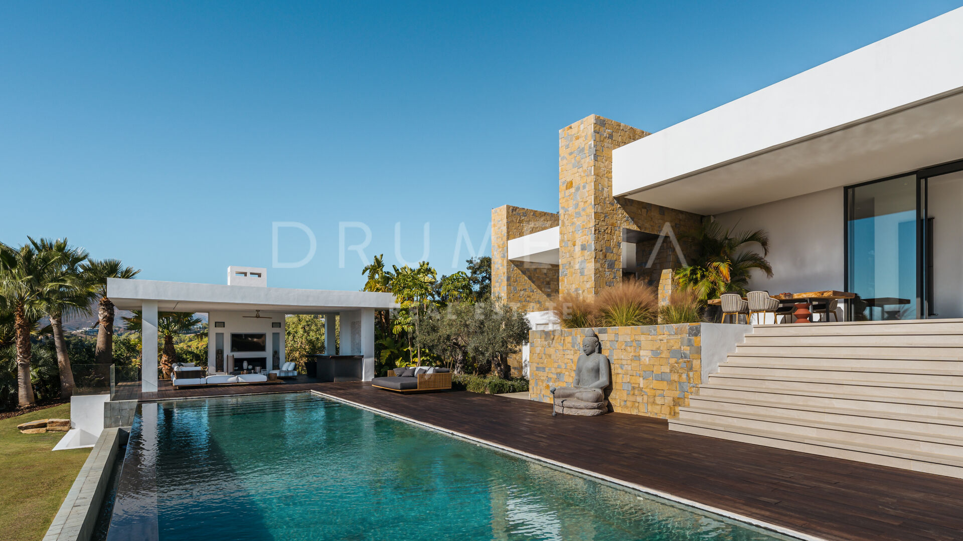This truly unique property is situated across almost 6,000m2 plot within the prestigious and tranquil setting of the Marbella Club Golf Resort in Benahavis. Set across a single floor, this expansive 1,021m2 home offers incredible south-facing views of the Mediterranean and Gibraltar from its floor-to-ceiling windows and discreet rear terrace.