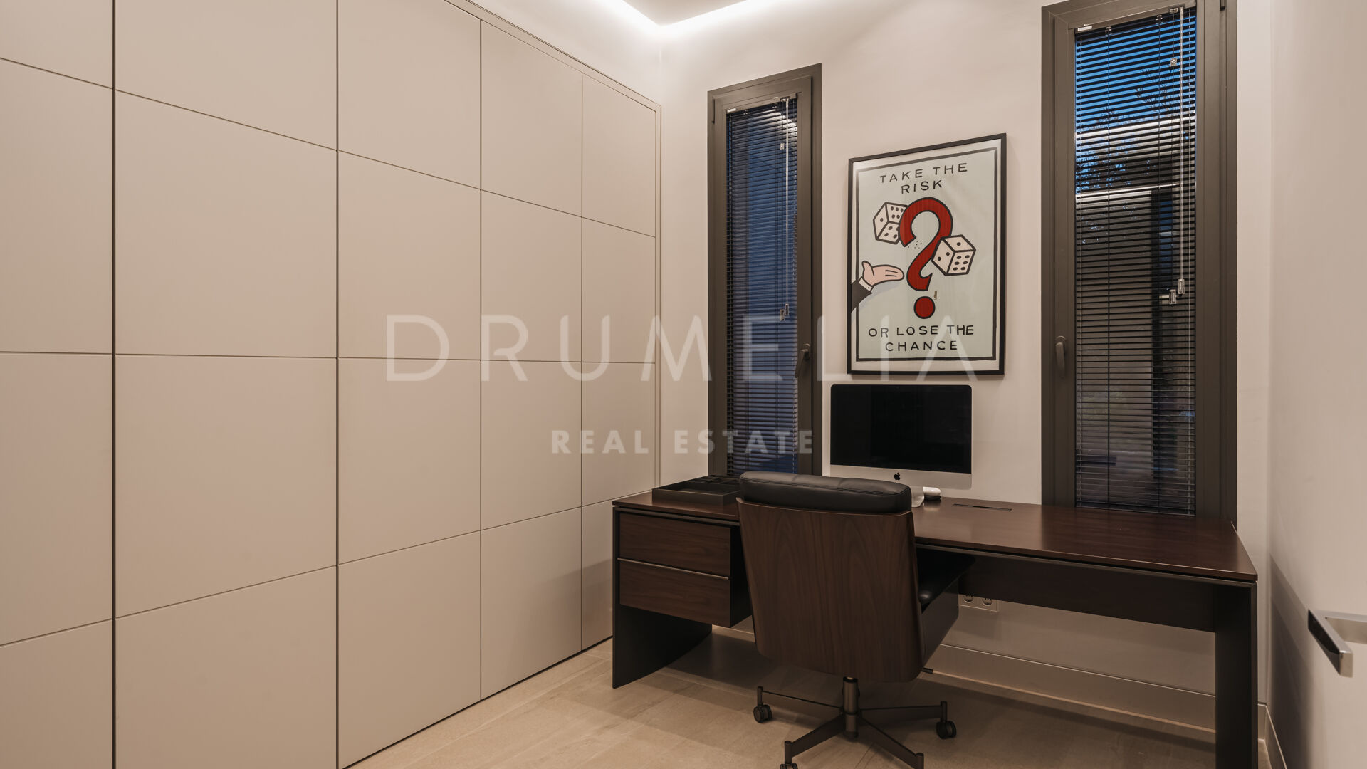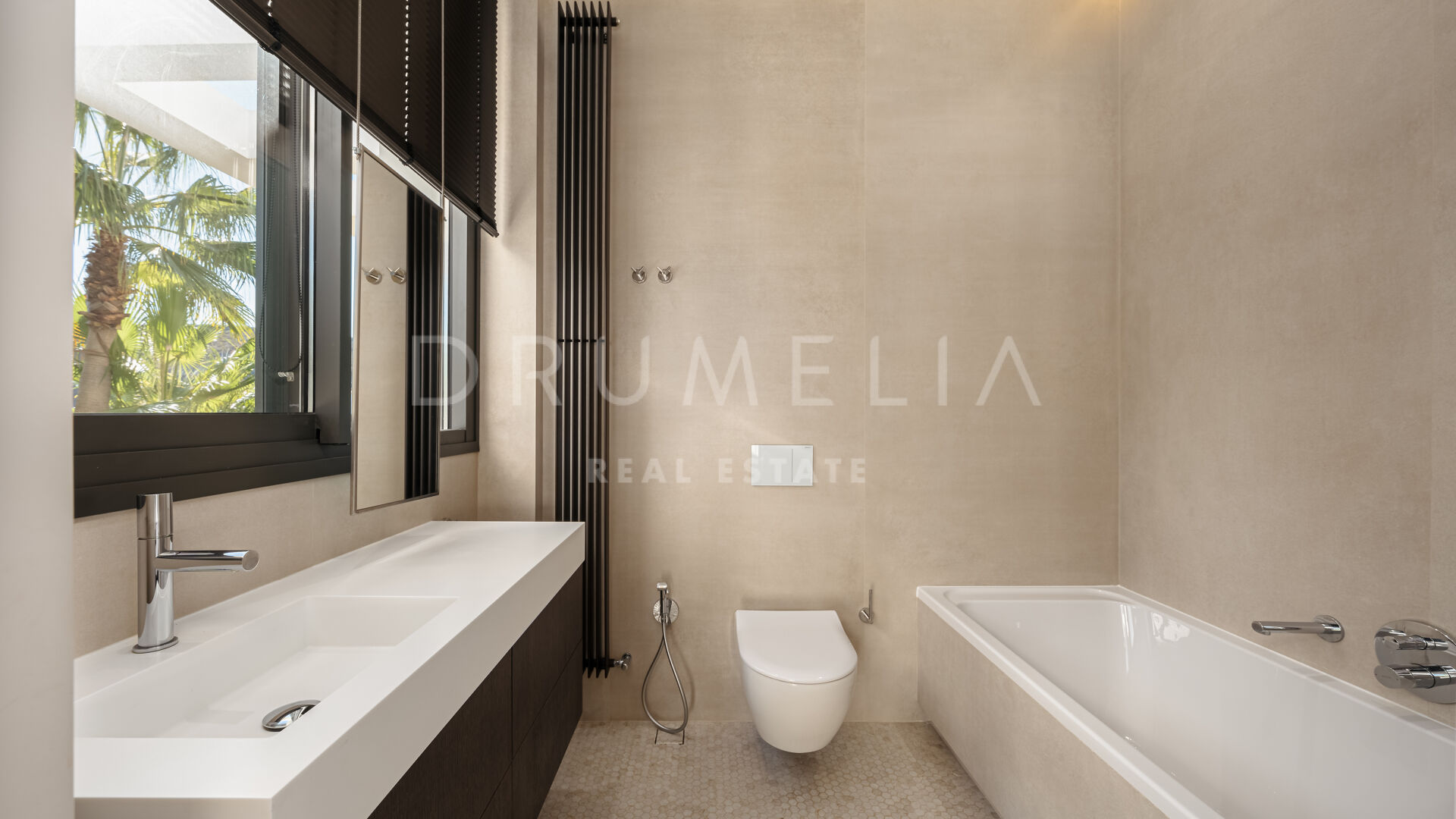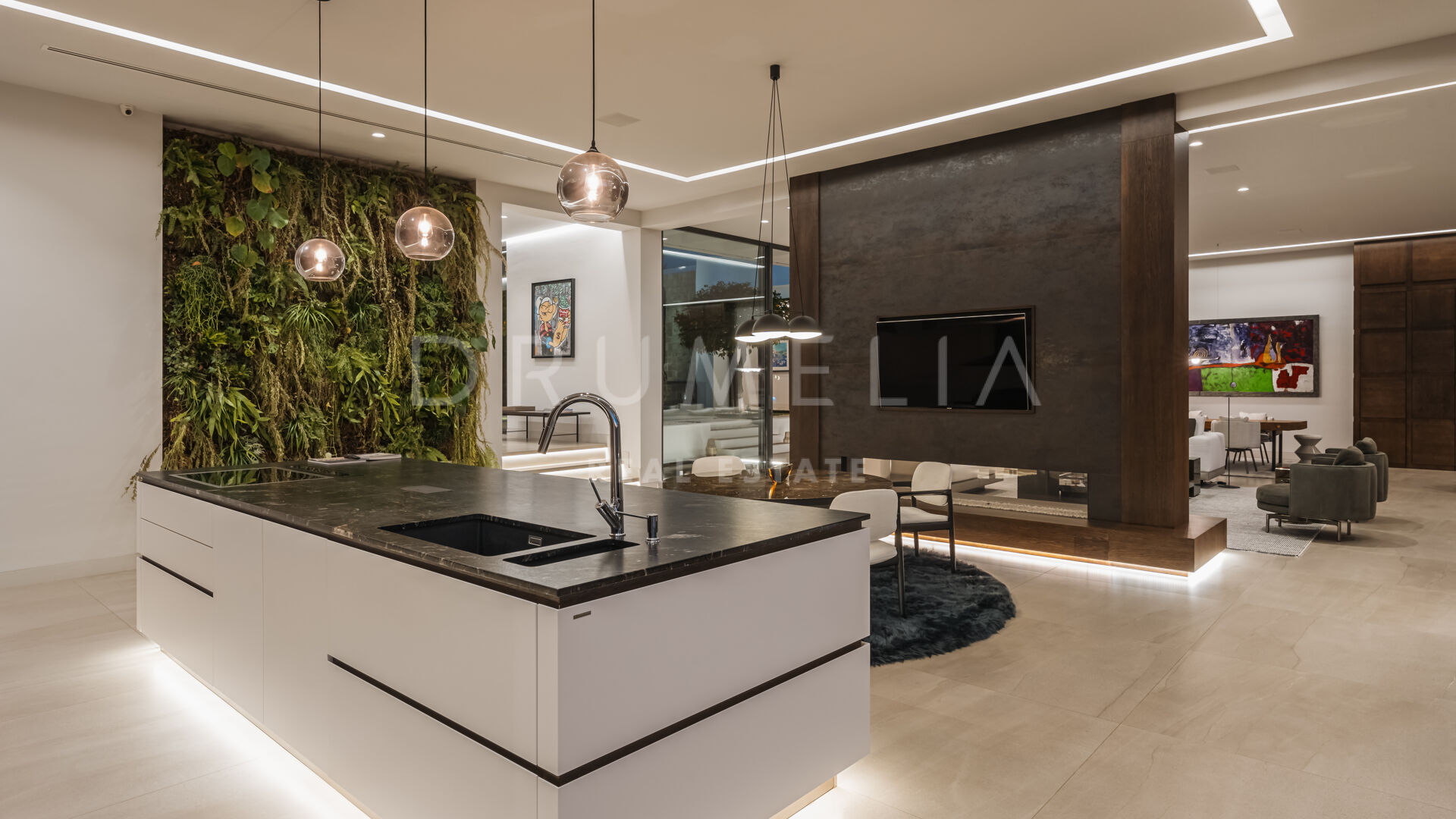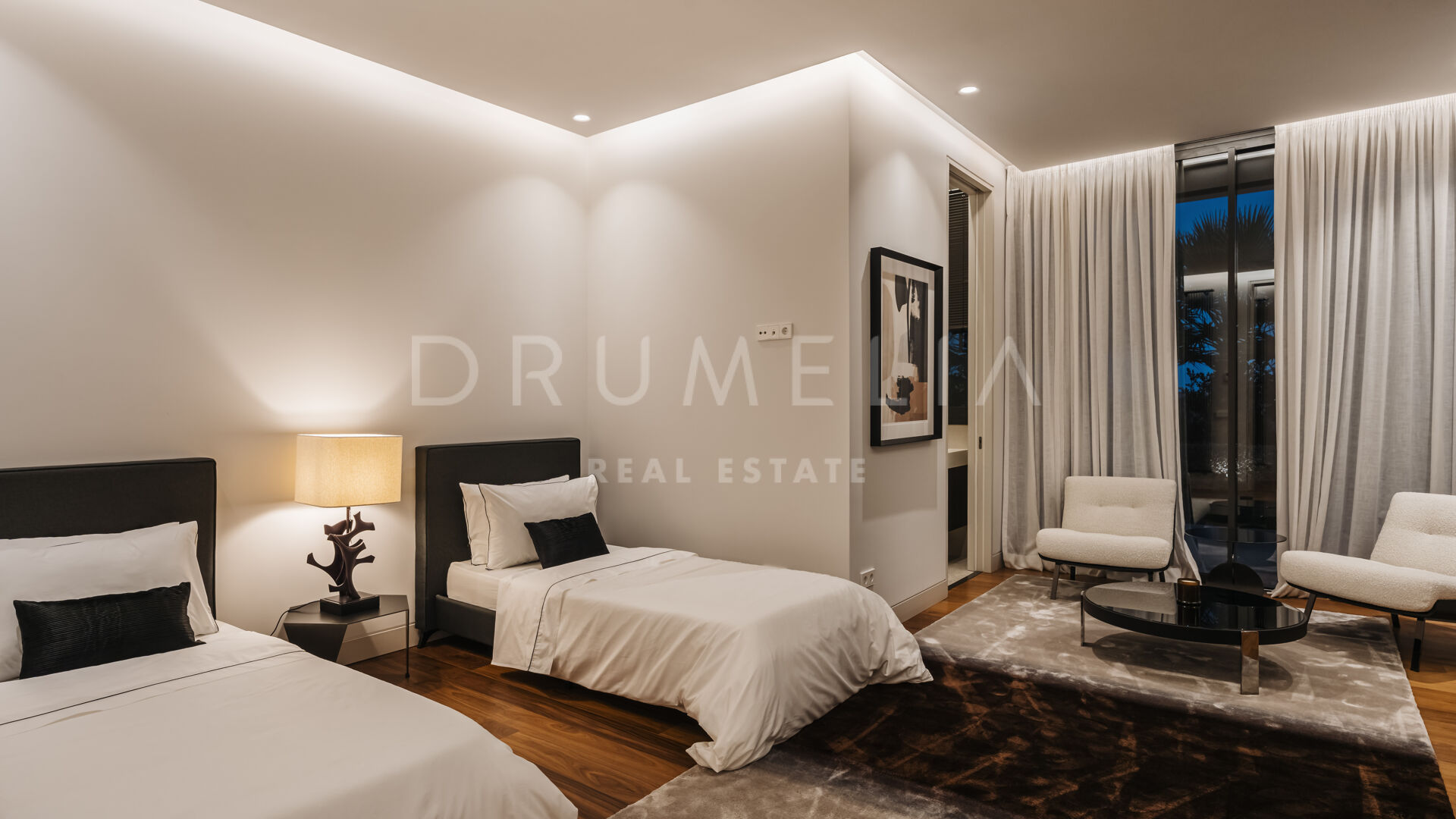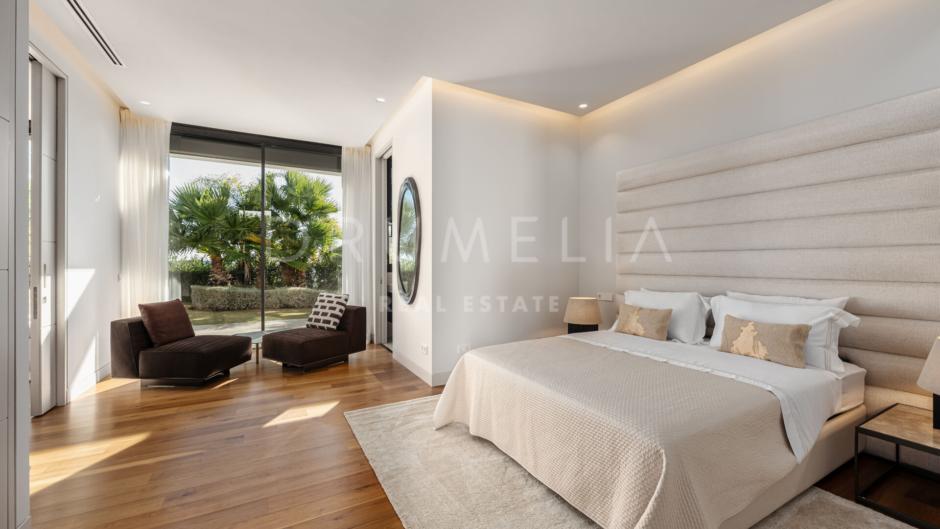 This truly unique property is situated across almost 6,000m2 plot within the prestigious and tranquil setting of the Marbella Club Golf Resort in Benahavis. Set across a single floor, this expansive 1,021m2 home offers incredible south-facing views of the Mediterranean and Gibraltar from its floor-to-ceiling windows and discreet rear terrace.