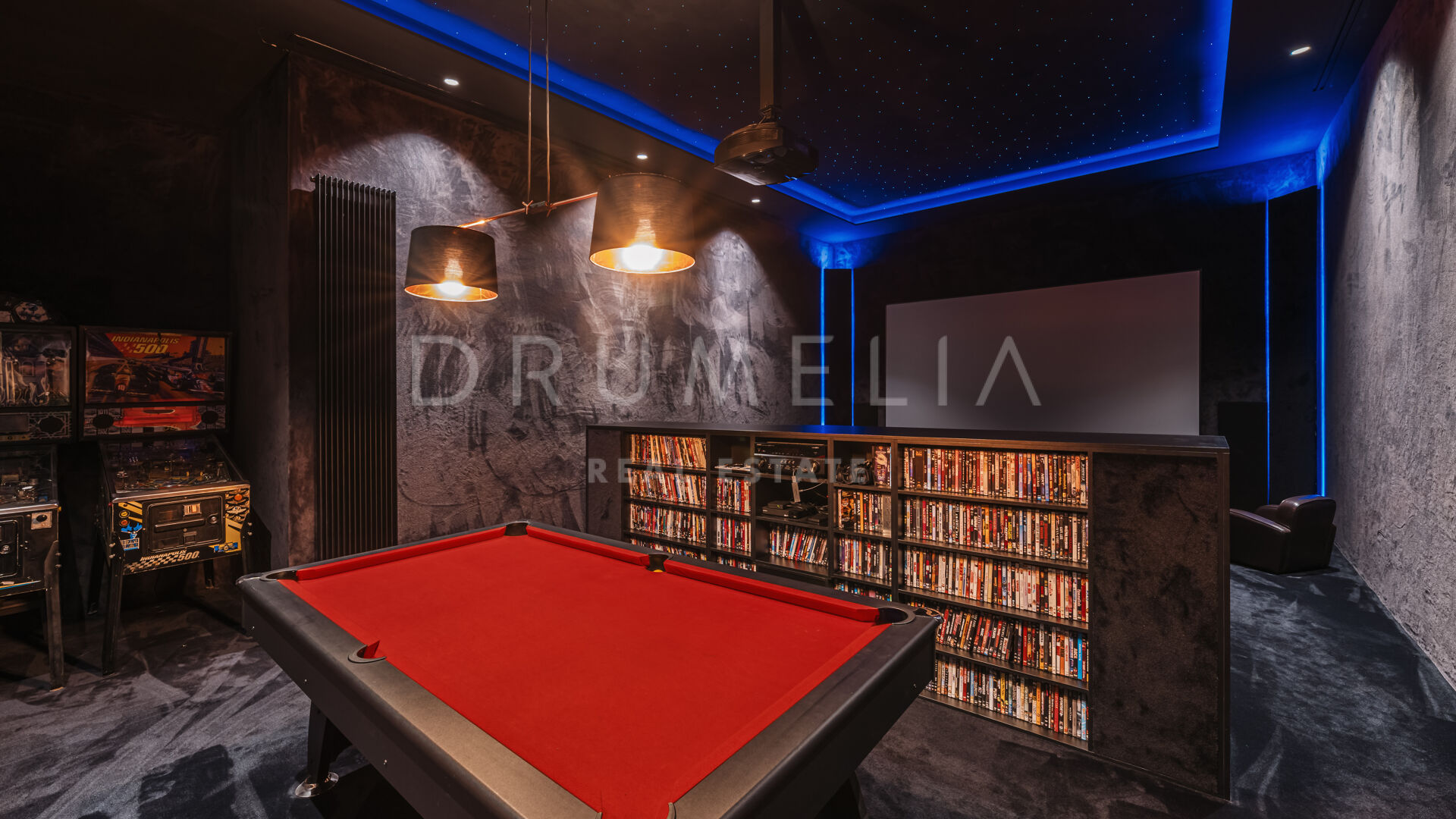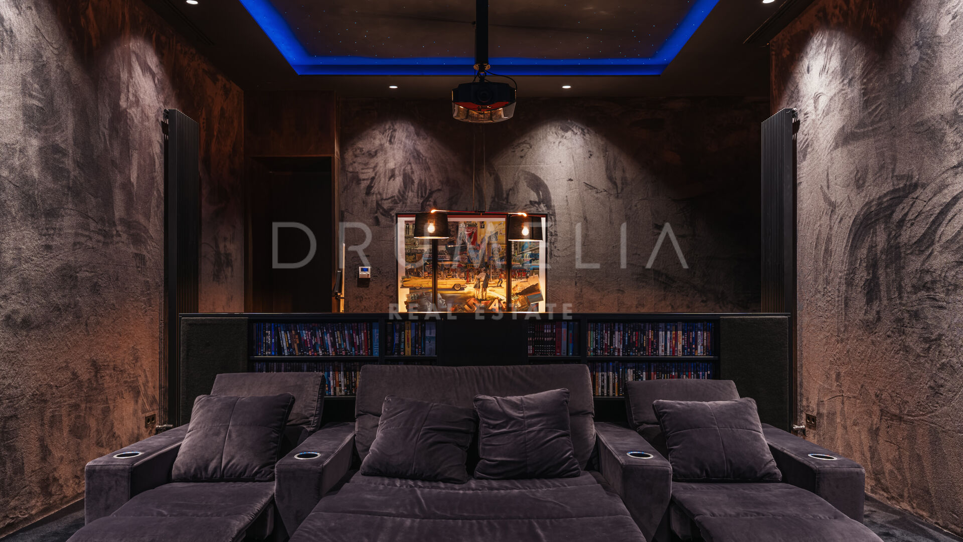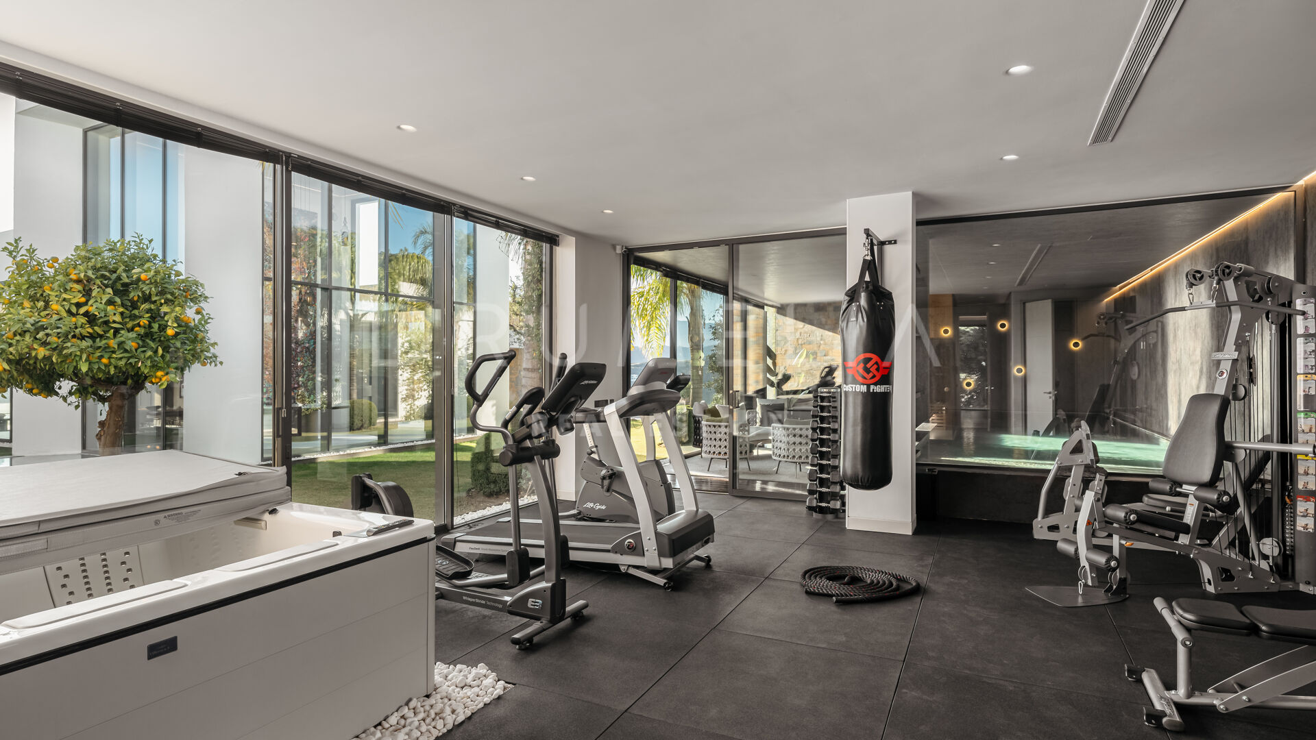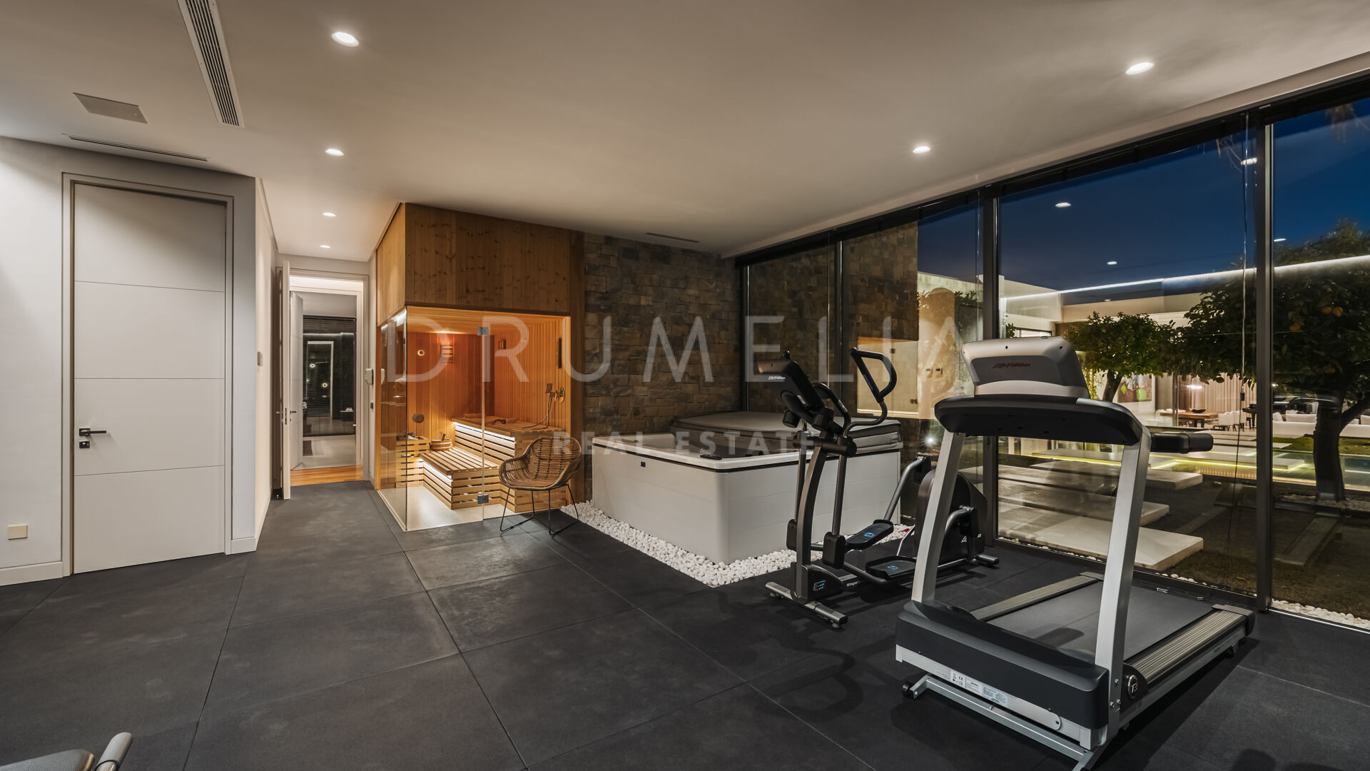 The forward view as you open the front door rewards you with one of the true standout features of the property – the lavish central atrium, housing grass, trees and a walkway – flanked by the rest of the single-floor living areas. As well as the six bedrooms and nine bathrooms on offer, this modern Marbella mansion features luxury comforts, including a cinema room, gym and spa facilities, indoor and outdoor swimming pools, a spacious seven-car garage and separate staff quarters.