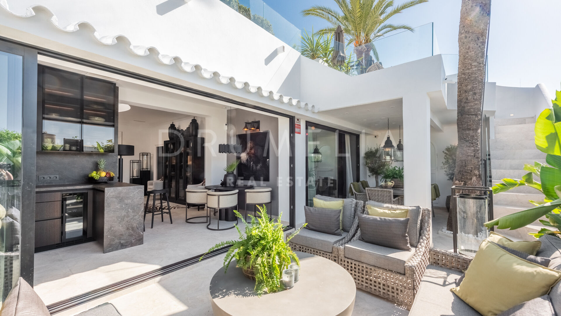 This exclusive luxury bungalow is located in Oasis Club, a prestigious beachfront community situated on the sought-after Golden Mile of Marbella. The property, with a total built area of 189 m², offers all main living areas on one floor, ensuring comfort and functionality. From the living room, there is direct access to a large private terrace, ideal for enjoying the Mediterranean climate, as well as another terrace on the upper level with stunning sea views.