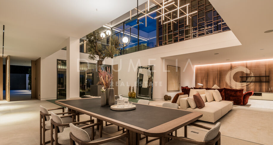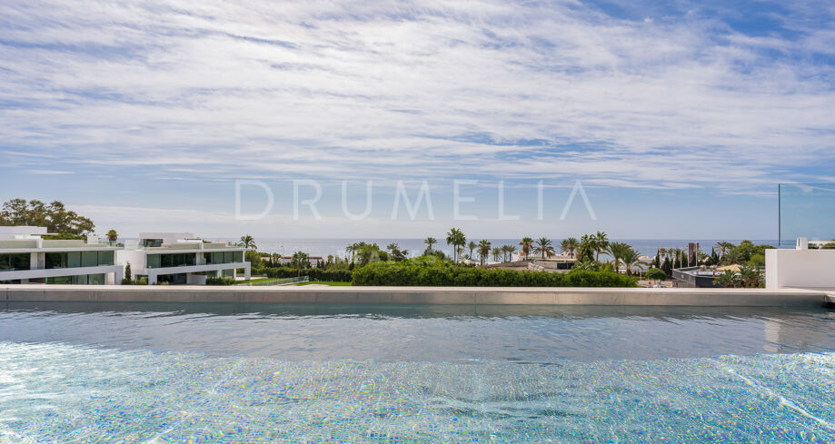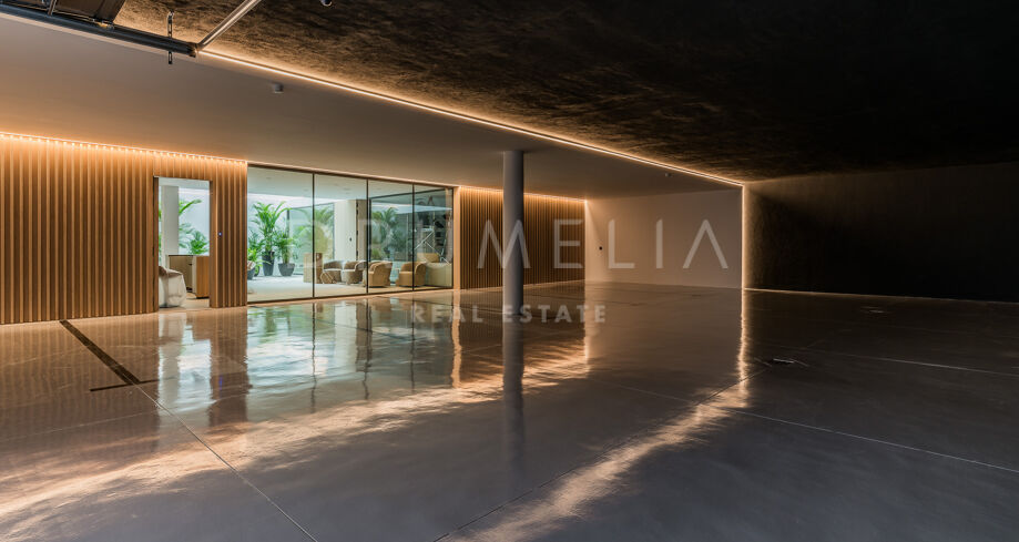 Surrounded with luxury properties of the super prestigious area of Marbella, the spectacular 4-floor property of 1.200 m² sits on a private plot of 1.400 m². This is a perfect example of stylish modern design and state-of-art technology. It features 6 bedrooms, 7 bathrooms, 2 swimming pools and 6 parking spaces. An exquisite entrance with water features leads to the main floor with an amazing internal patio. An open plan concept unites a fully fitted and equipped with top of the line appliances kitchen, a chic dining area and a stylish lounge with floor-to-ceiling sliding glass doors/walls. A serene guest bedroom and a bathroom complete this floor. The first floor includes the large Master suite with a sublime walk-in closet and a large terrace with fantastic views over the sea and Puerto Banus, an office area and 2 spacious bedroom suites.A roof top terrace, which is iconic for sophisticated Marbella, is equipped with all luxury features including a TV area, al fresco dining zone and heated swimming pool. An impressive basement level includes plenty of entertaining features and a 6-car garage. Take advantage of designated entertainment and chill-out areas outdoors and celebrate Mediterranean life in all its glory. Lovely covered and sunny terraces are perfect for morning espresso and evening cocktails, entertaining on a grand scale, enjoying sunsets, al fresco family dinners or get-together parties. A large pool with sunbathing area is a fantastic place to throw a pool party.