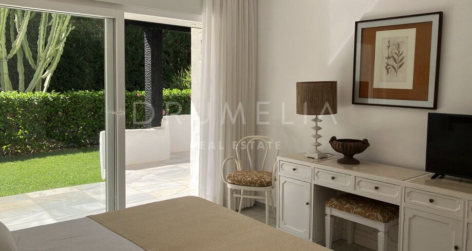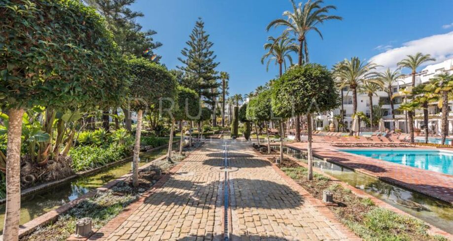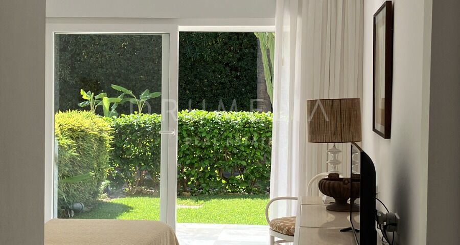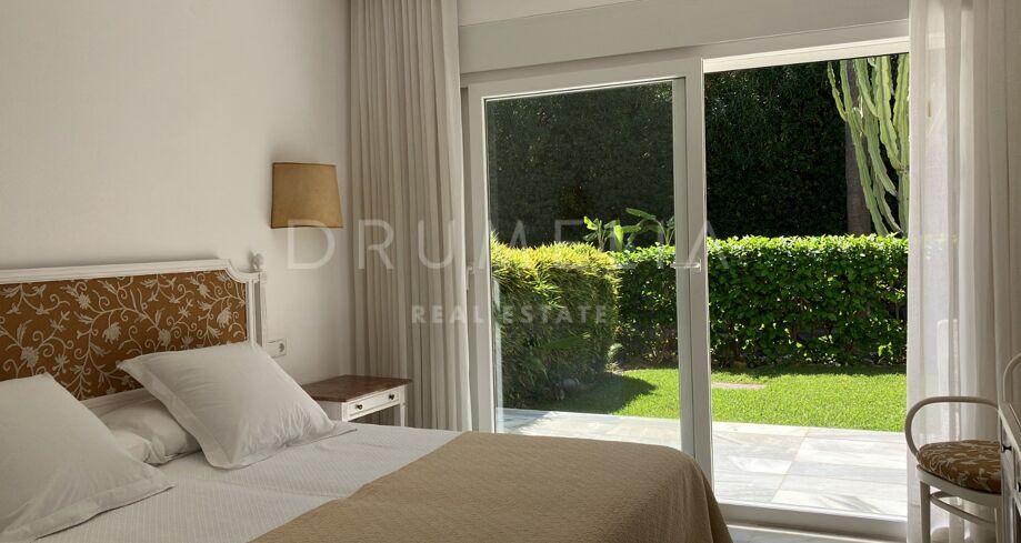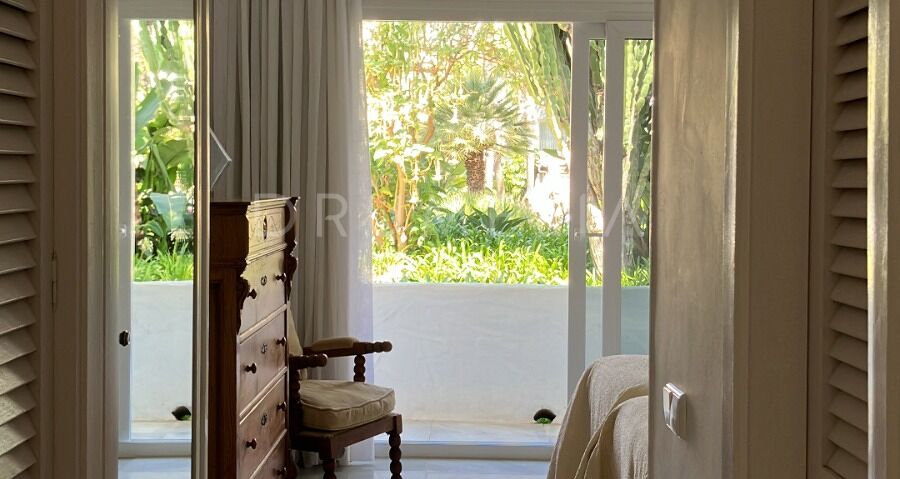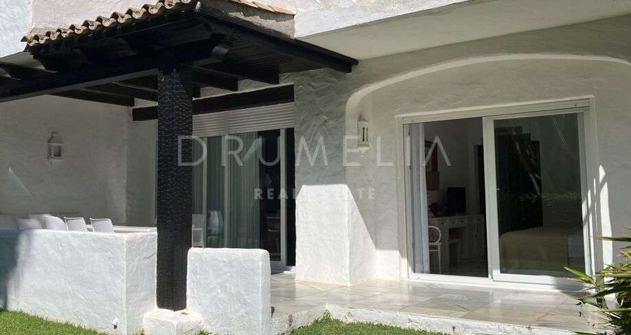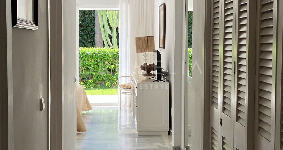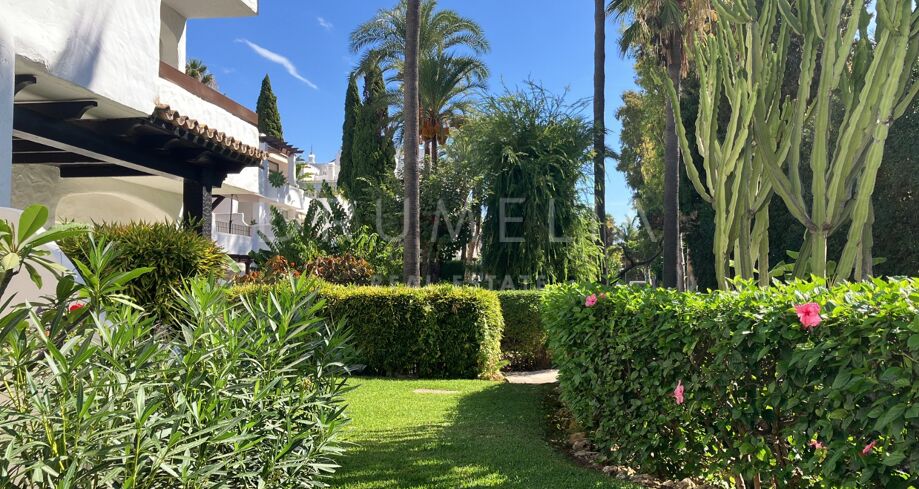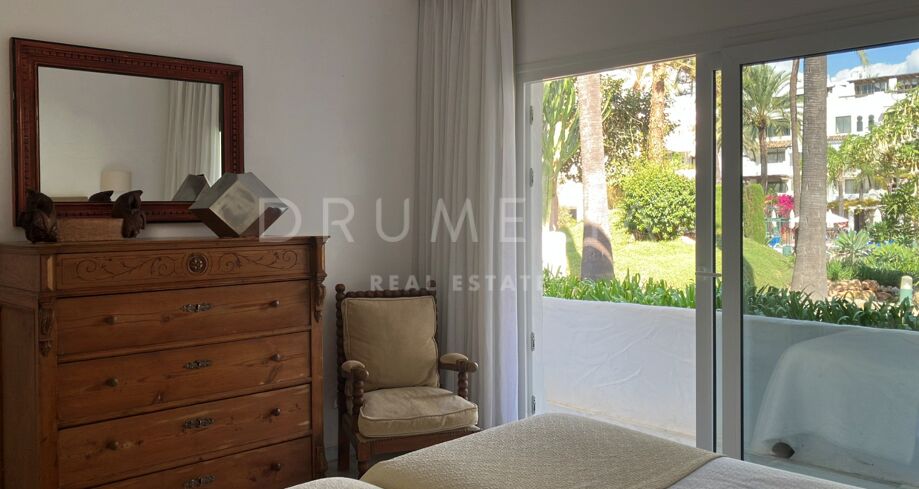This ground-floor exterior apartment enjoys a privileged position within a well-established residential complex, just steps from the beach and Puerto Banús marina.