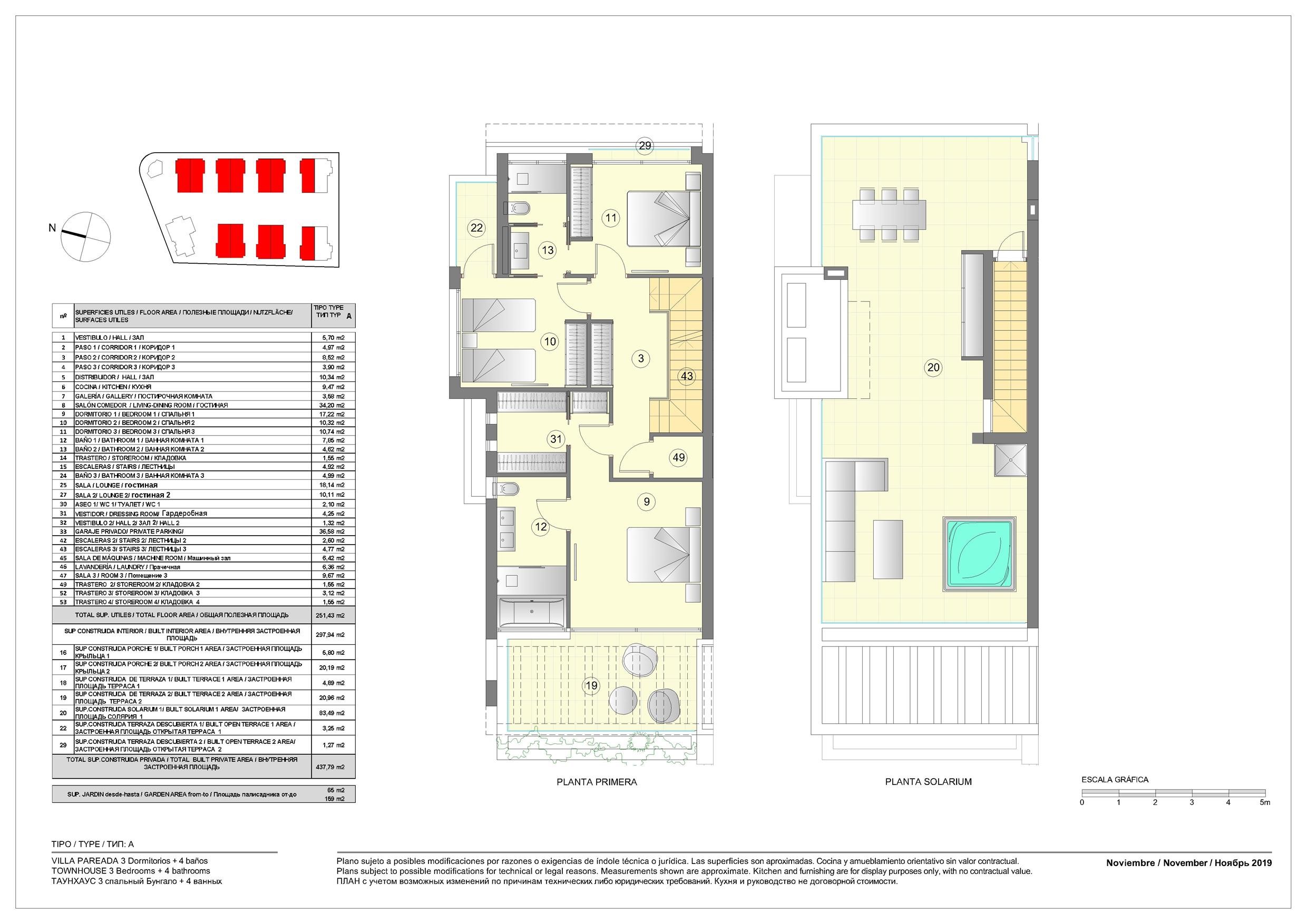 Let’s have a closer look at one of the offered houses with orientation South/West, 437 m² built and 148 m² terraces. It features 3 bedrooms and 2 bathrooms, 1 guest toilets, a fully fitted kitchen, a laundry room, a storage room. The basement comes with garage for 2 cars, and the sun deck includes barbecue area and pre-installation of Jacuzzi. It has been designed with large windows that offer great views over the residential complex’s beautiful landscape scenery. It comes with air conditioning, underfloor heating in the bathrooms, electric blinds and many other features that will make your living comfortable and safe.