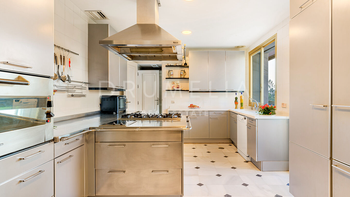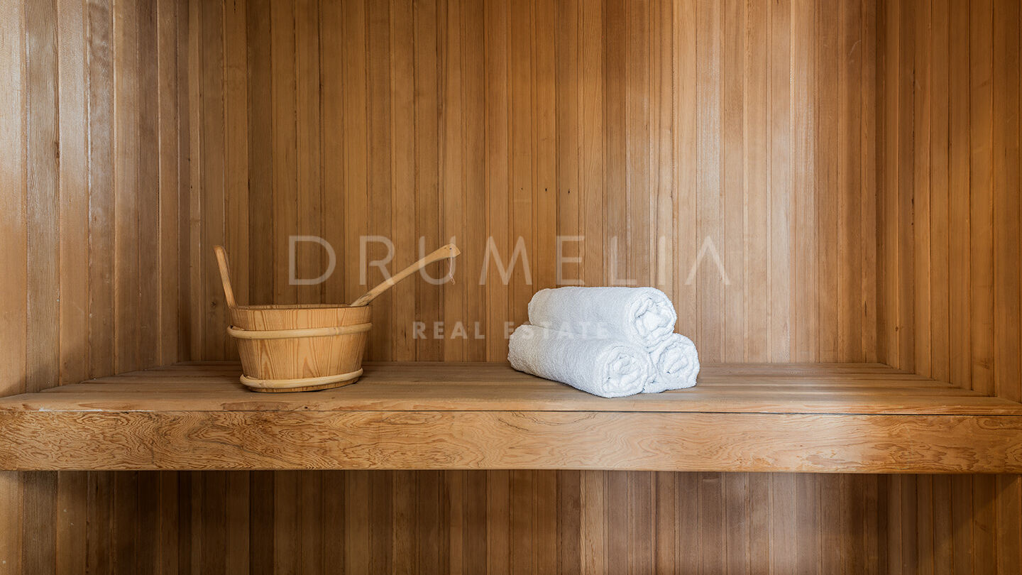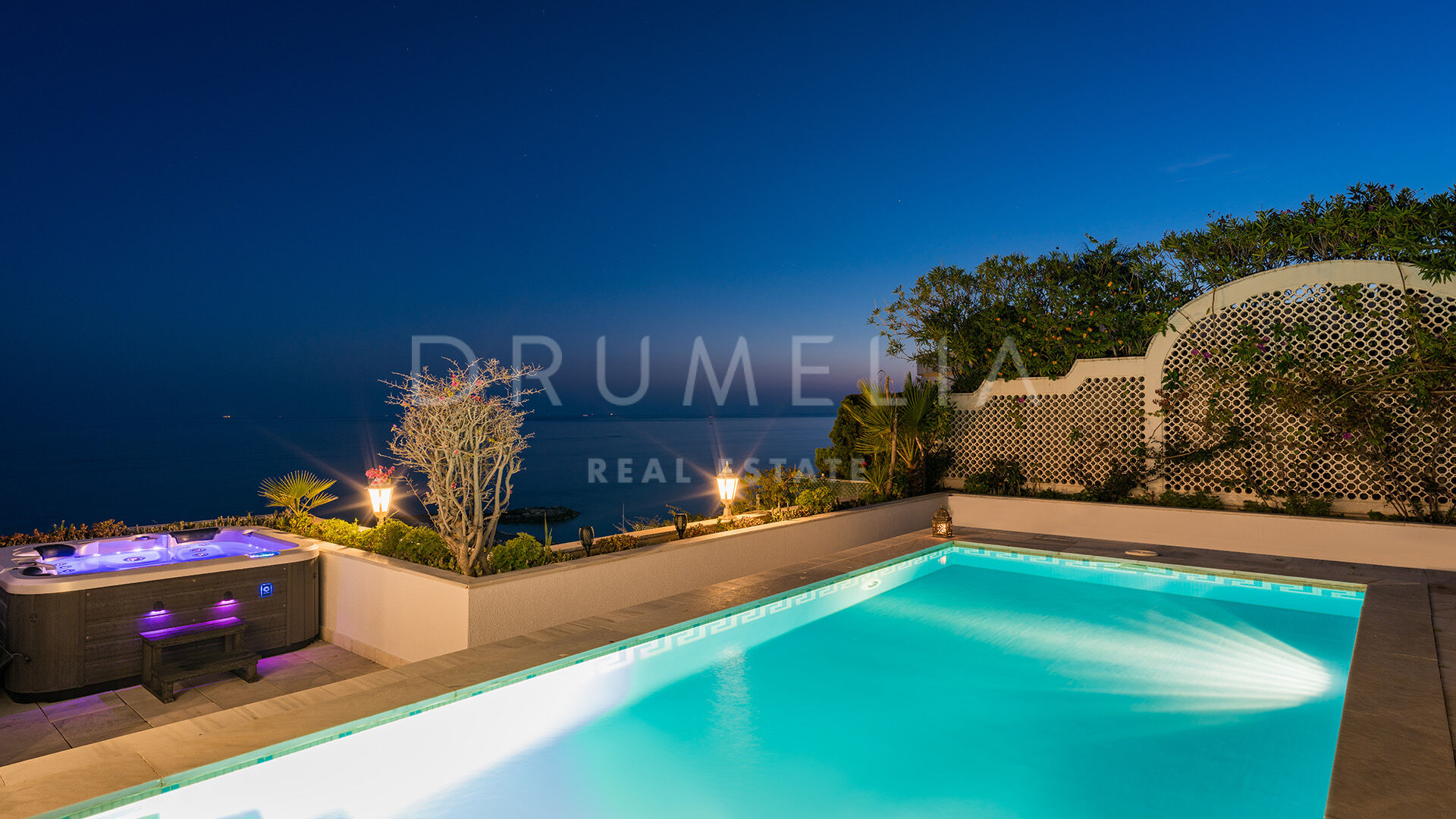 On the top floor, there is a private pool, jacuzzi, sauna, kitchenette and another bedroom in suite, from where you can enjoy unobstructed panoramic views of the Mediterranean.