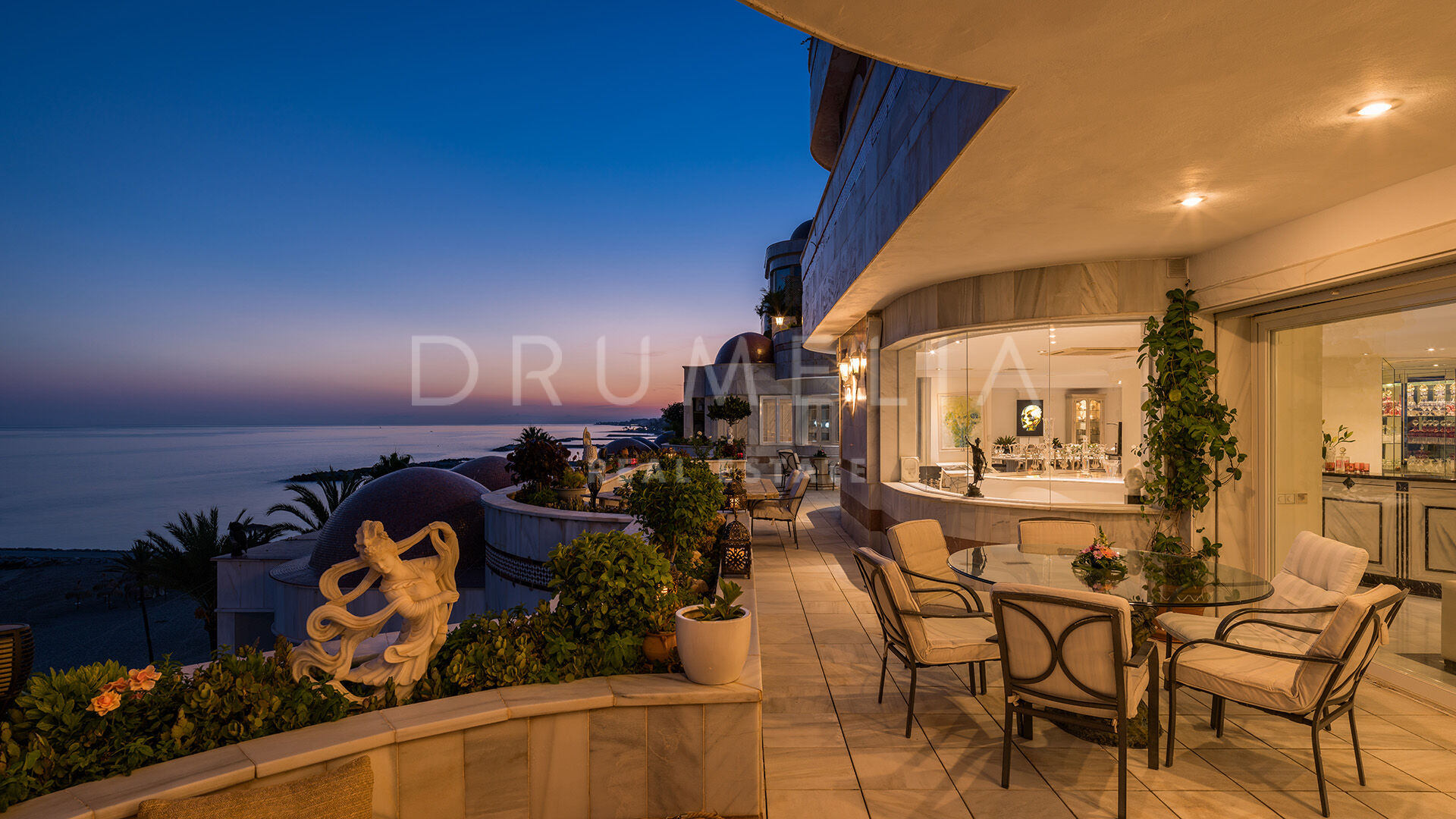 This exceptional and impressive triplex penthouse is located right on the beach in the emblematic Gray D’Albion building, close to Marbella’s famous marina Puerto Banús in Nueva Andalucía. This luxurious property occupies the top three floors of the building and offers incredible panoramic views of the Mediterranean Sea, Gibraltar and Africa, as well as the glamorous port and mountains of Marbella.