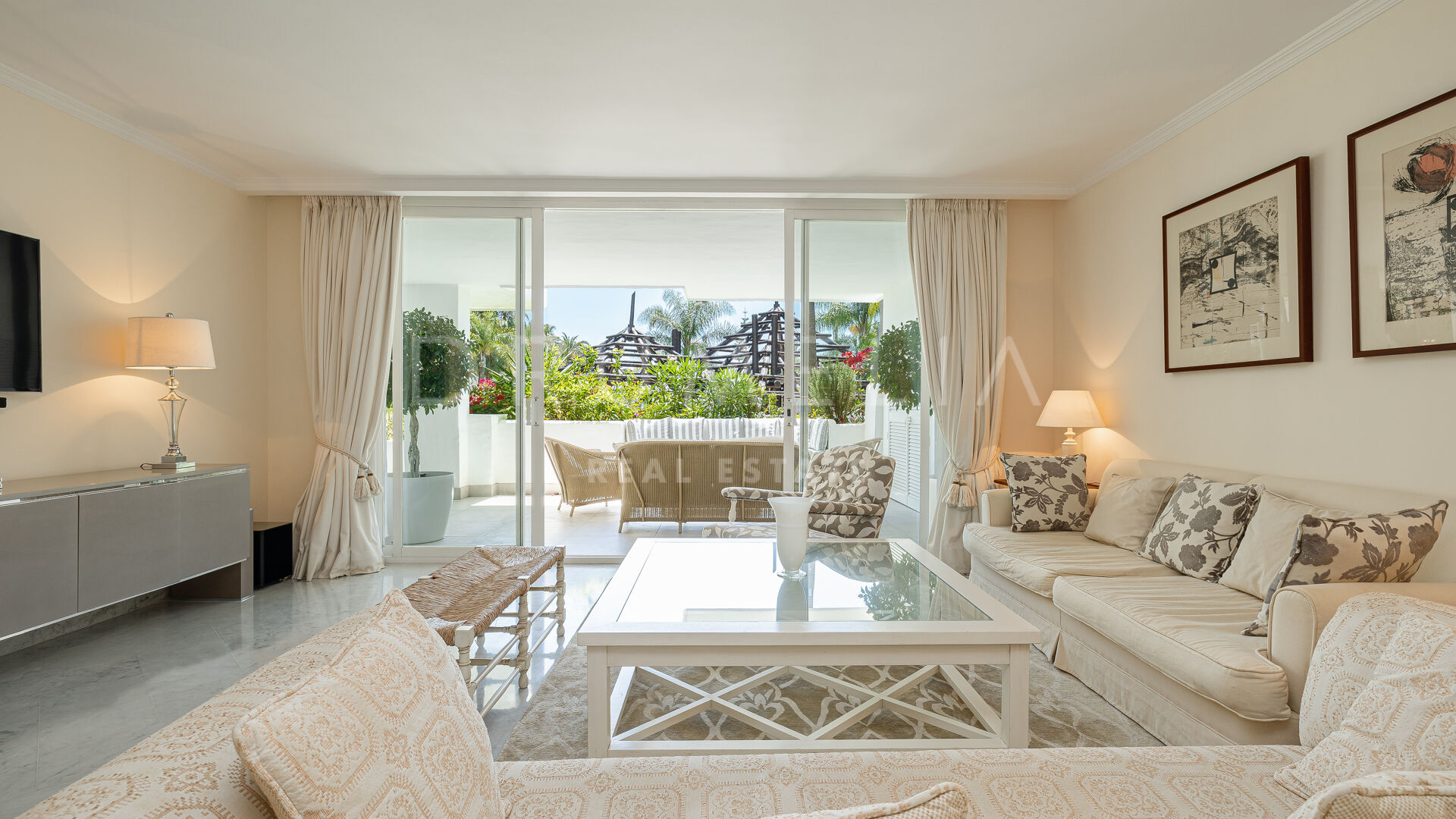 Located within one of the most prestigious gated communities on Marbella’s Golden Mile, this refined ground-floor apartment combines timeless elegance with modern comfort. Nestled among serene landscaped gardens just steps from the sea, it offers an exceptional lifestyle in a secure and private setting.