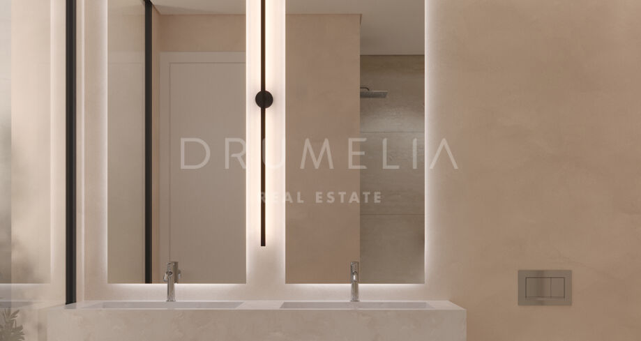 Upstairs, the principal bedroom opens onto a covered mirador terrace of 28,80 m², oriented west to catch the afternoon sun. Two further bedrooms have balcony access. All bathrooms are fitted with floor-to-ceiling glass shower screens, backlit mirrors, and built-in niches.