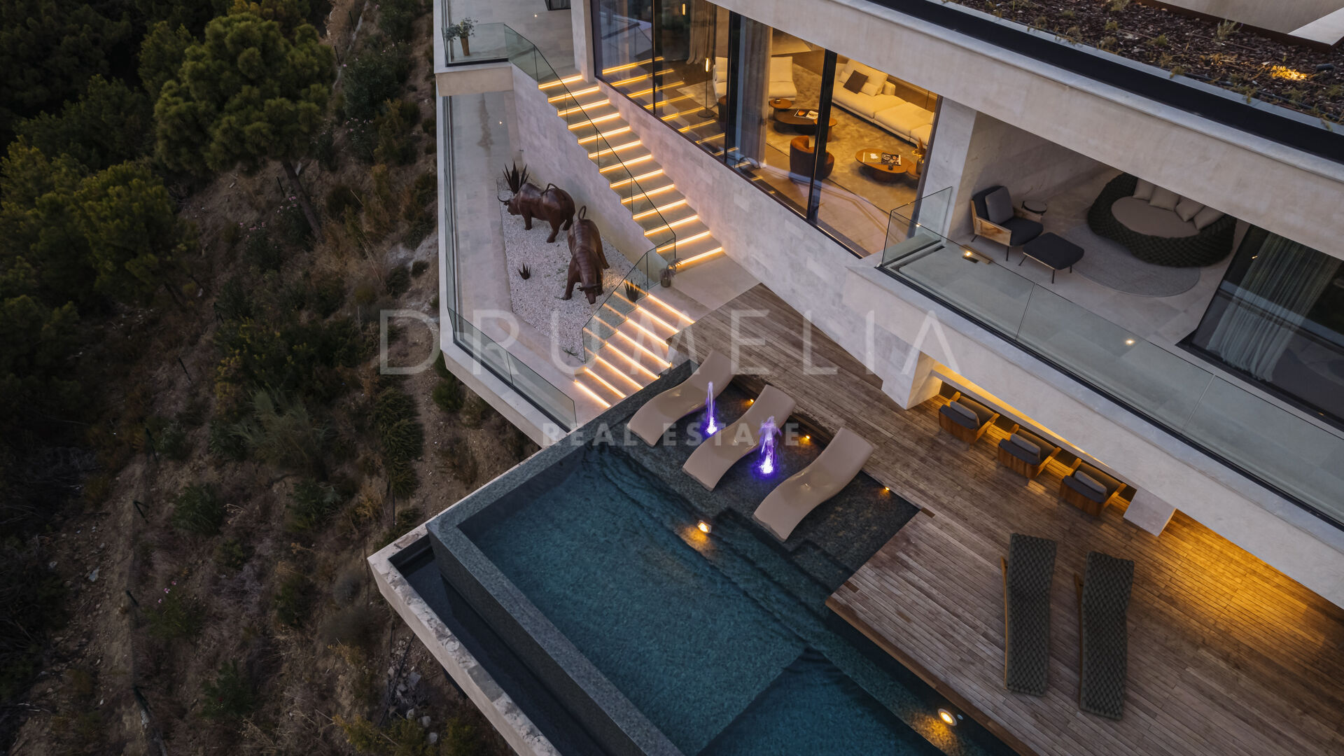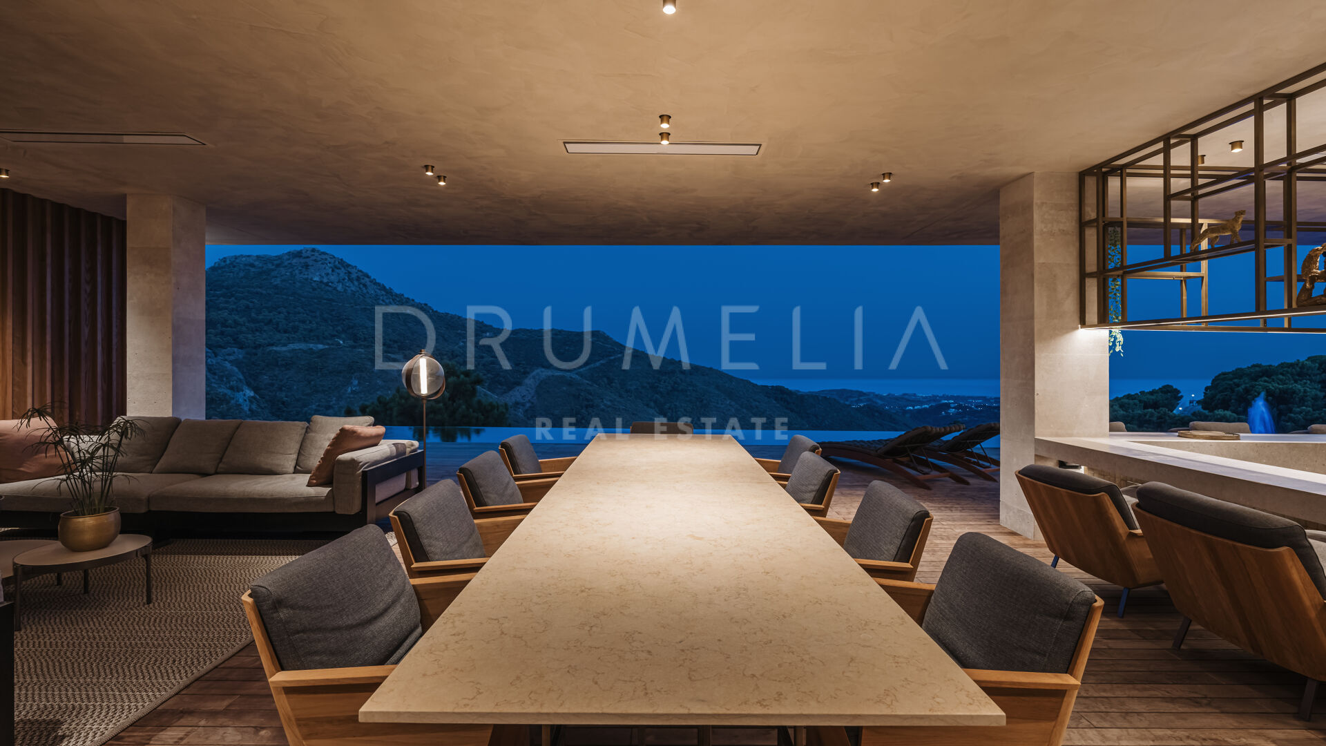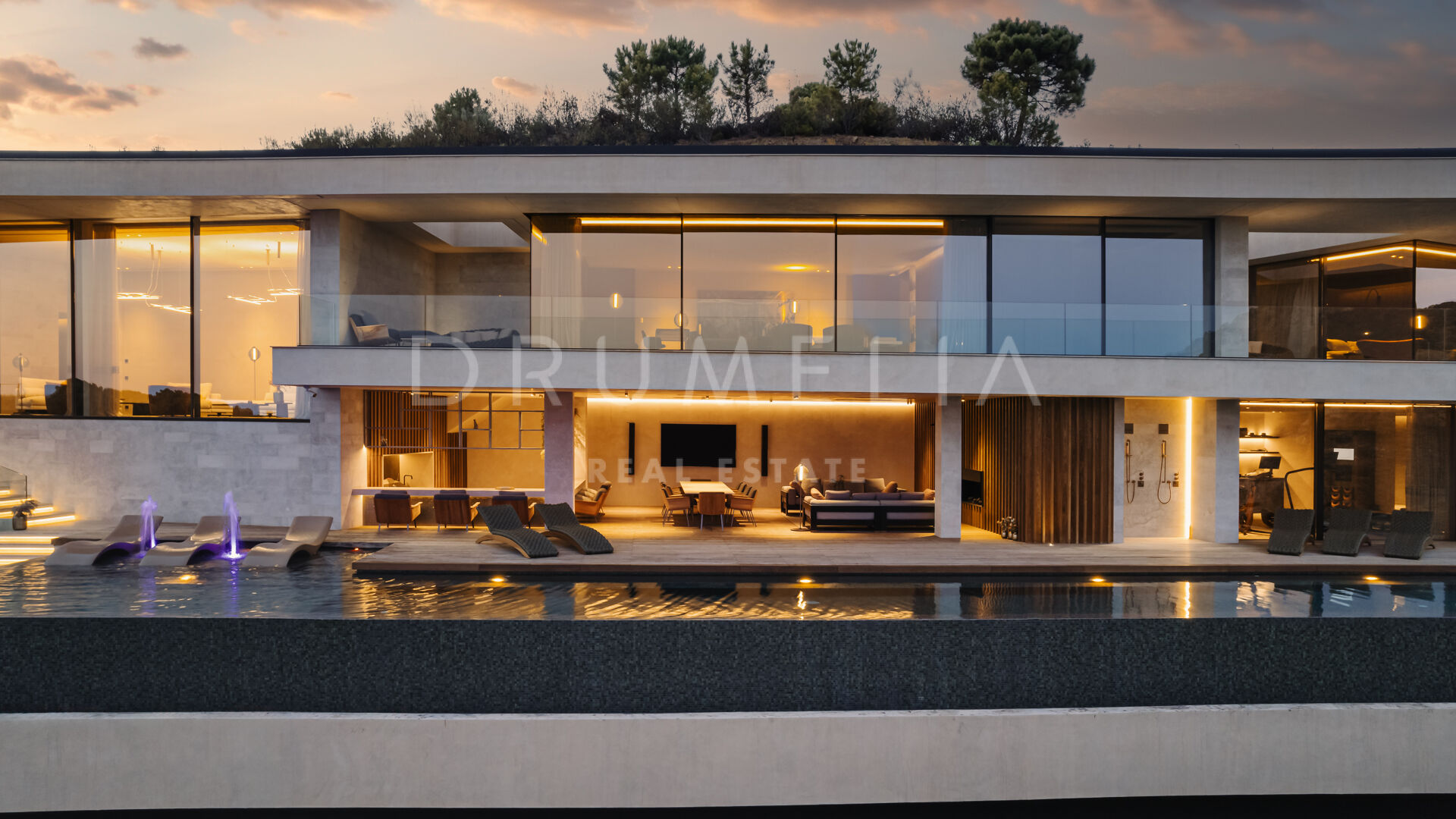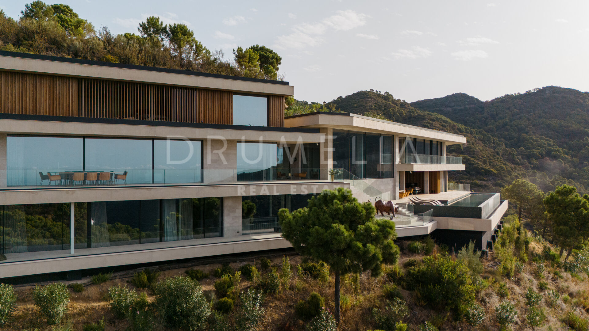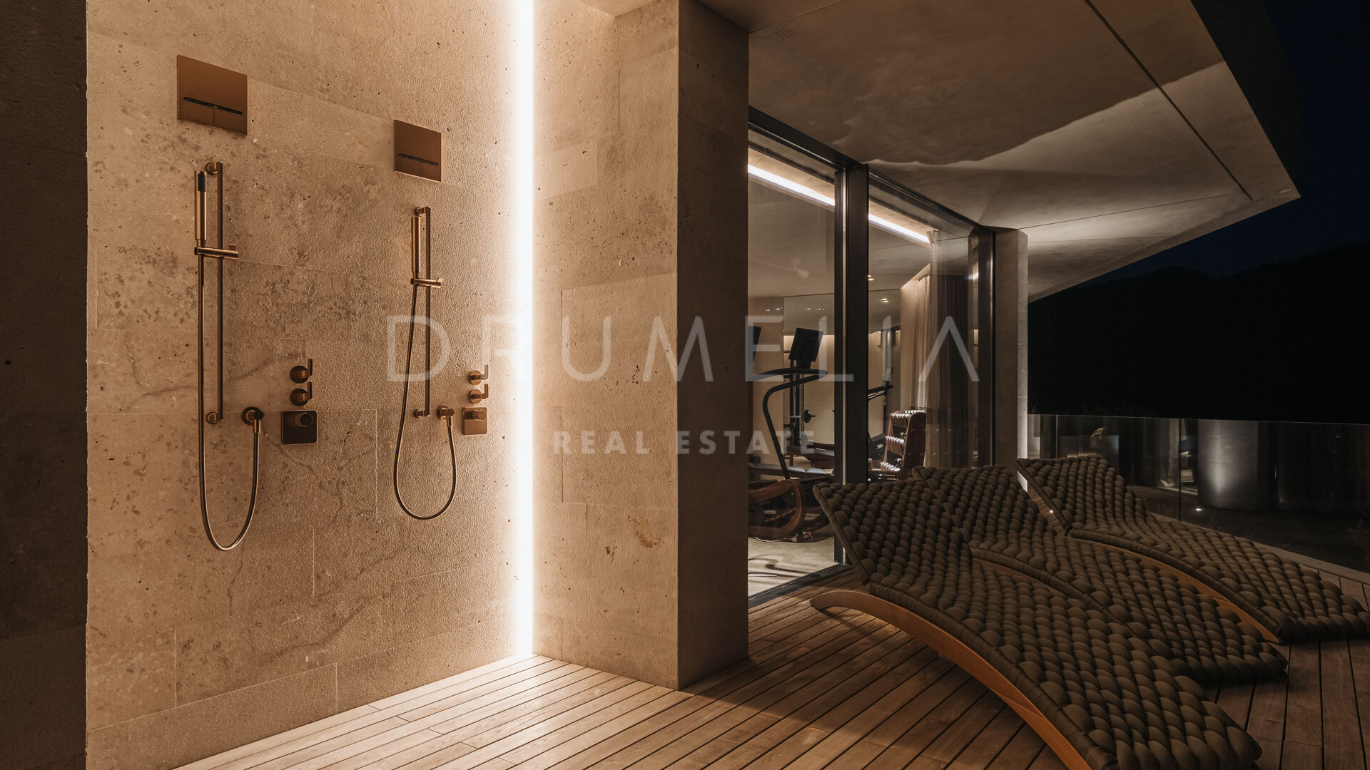 The spectacular 1100 m² house with 500 m² of terraces sits on a large 5,127 m² plot featuring a drought-tolerant garden. It is uniquely designed for comfort, enjoyment, and well-being, fully integrated with the mountains and customized to the plot, orientation, and views. The property, built with sustainable design principles, boasts a green roof, solar panels, energy-efficient LED lights, and oversized picture windows with Schüco frames offering 180-degree panoramic views of the sea and mountains.