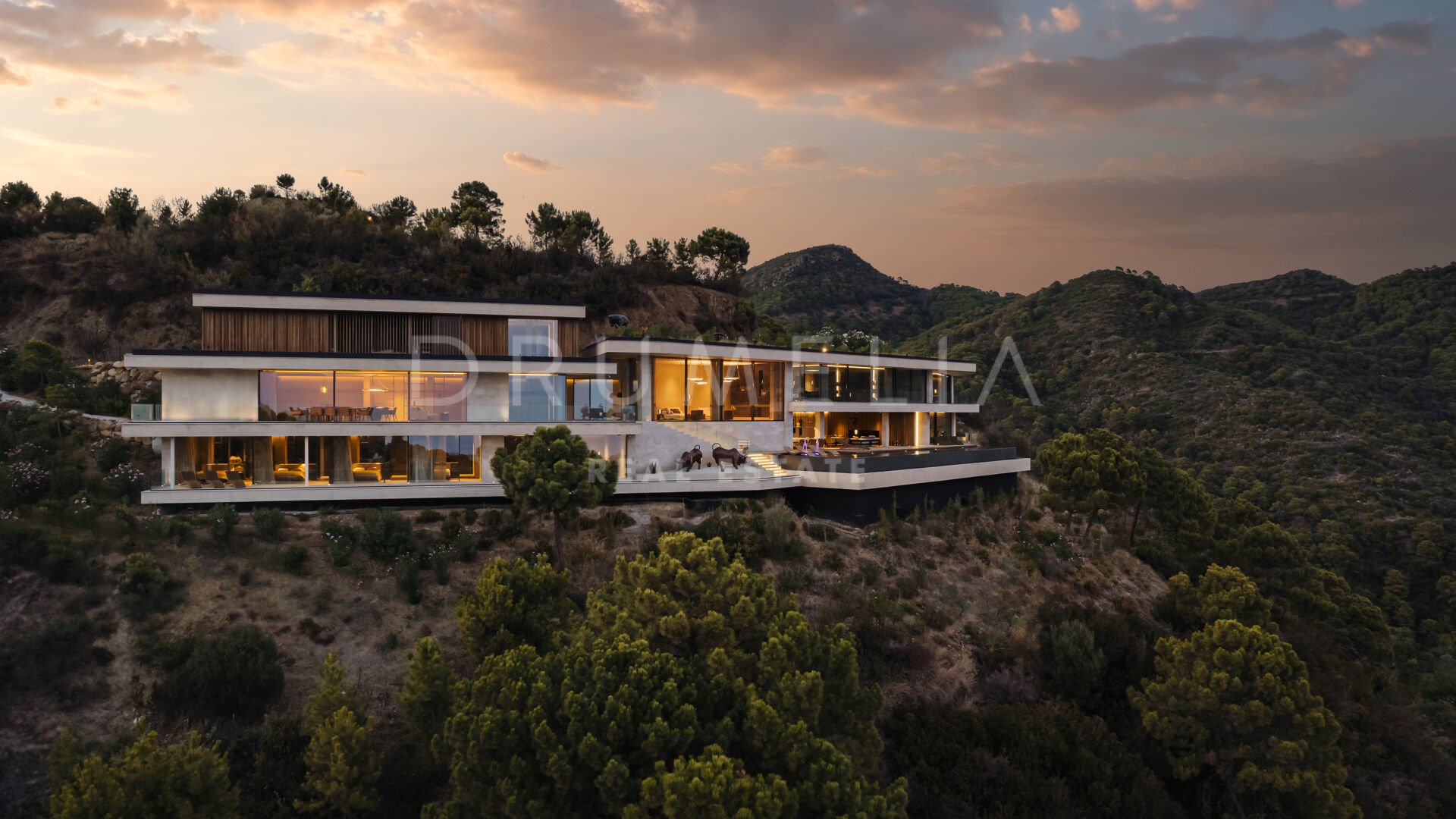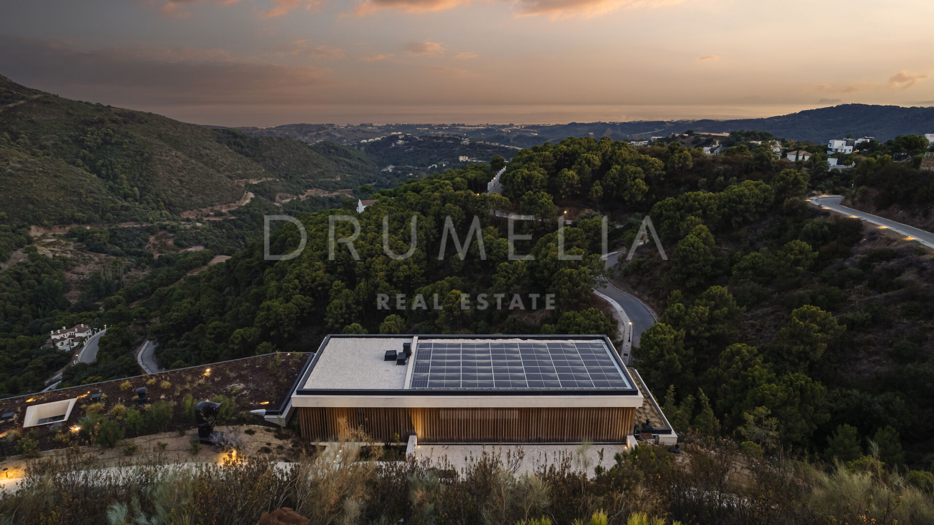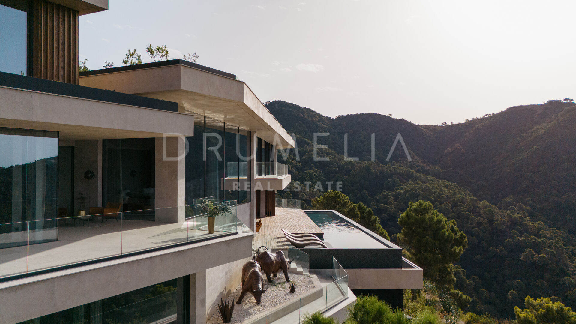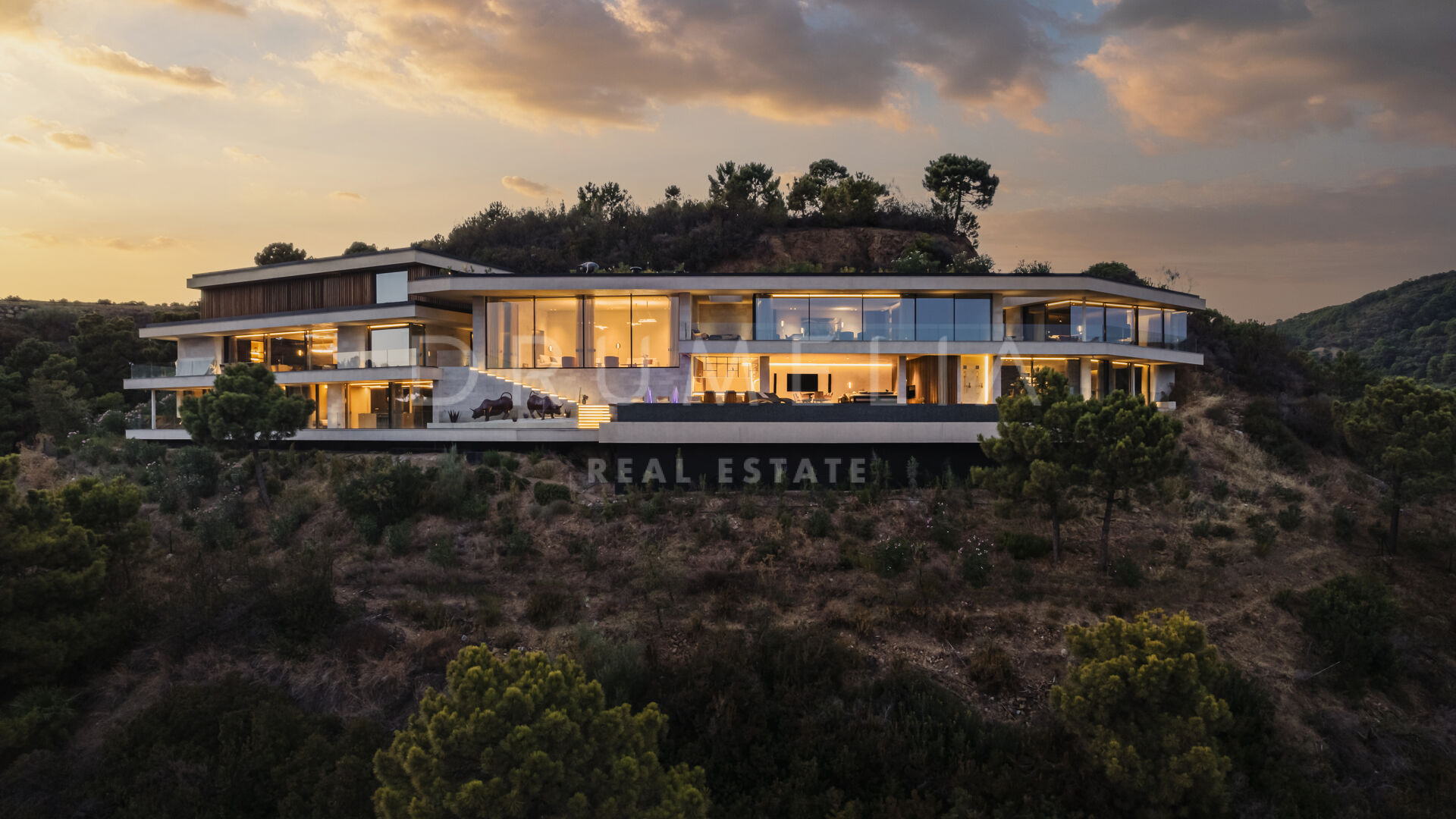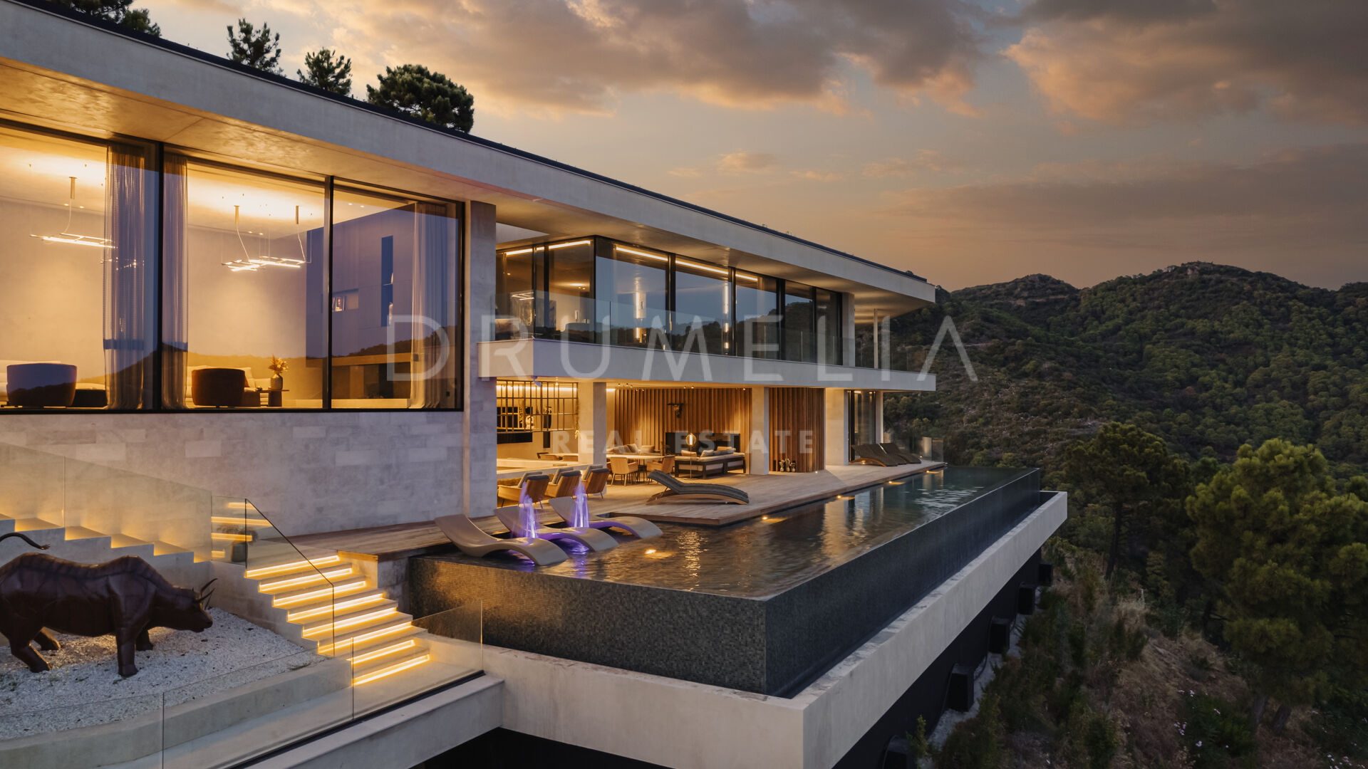 The spectacular 1100 m² house with 500 m² of terraces sits on a large 5,127 m² plot featuring a drought-tolerant garden. It is uniquely designed for comfort, enjoyment, and well-being, fully integrated with the mountains and customized to the plot, orientation, and views. The property, built with sustainable design principles, boasts a green roof, solar panels, energy-efficient LED lights, and oversized picture windows with Schüco frames offering 180-degree panoramic views of the sea and mountains.