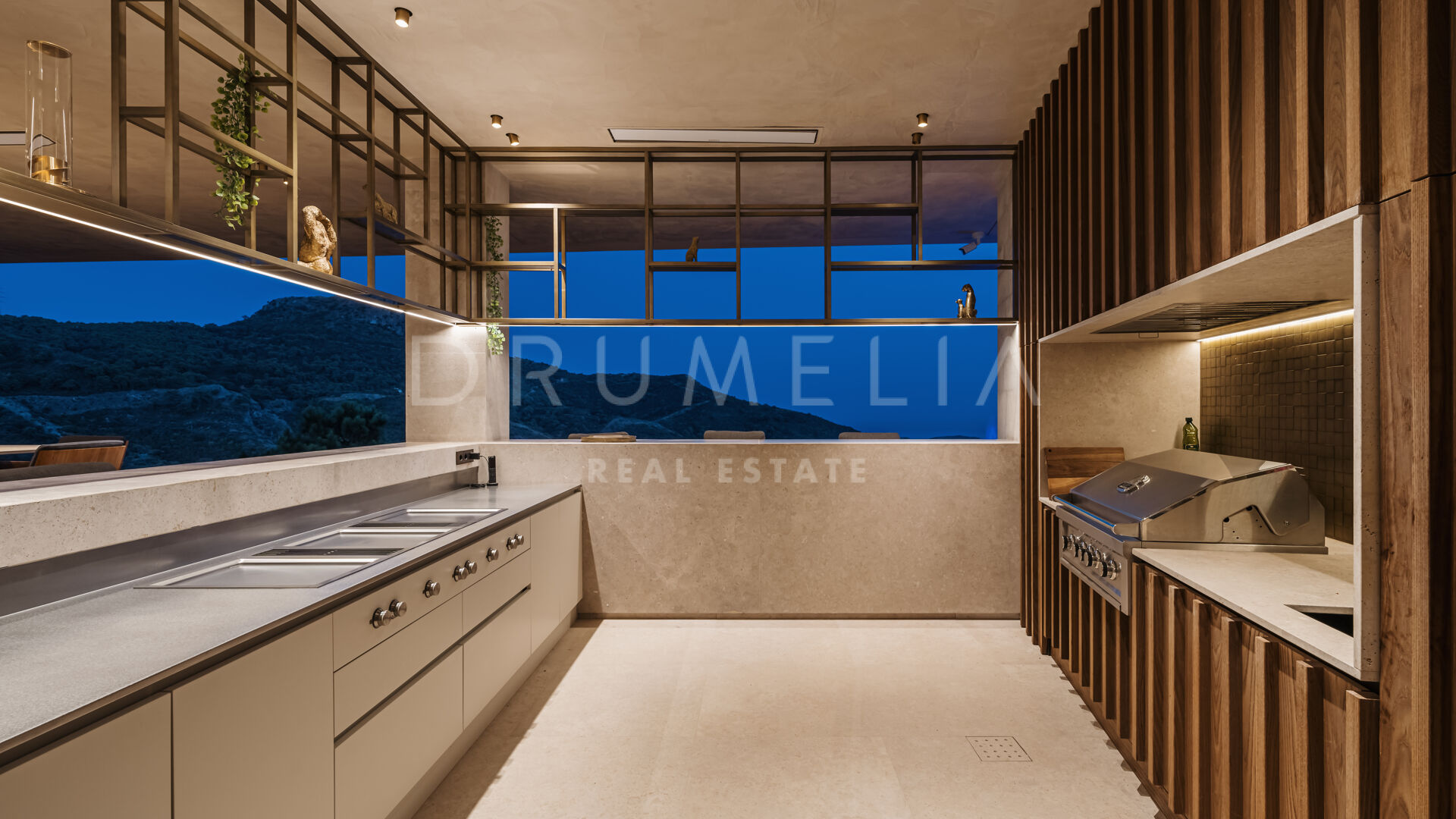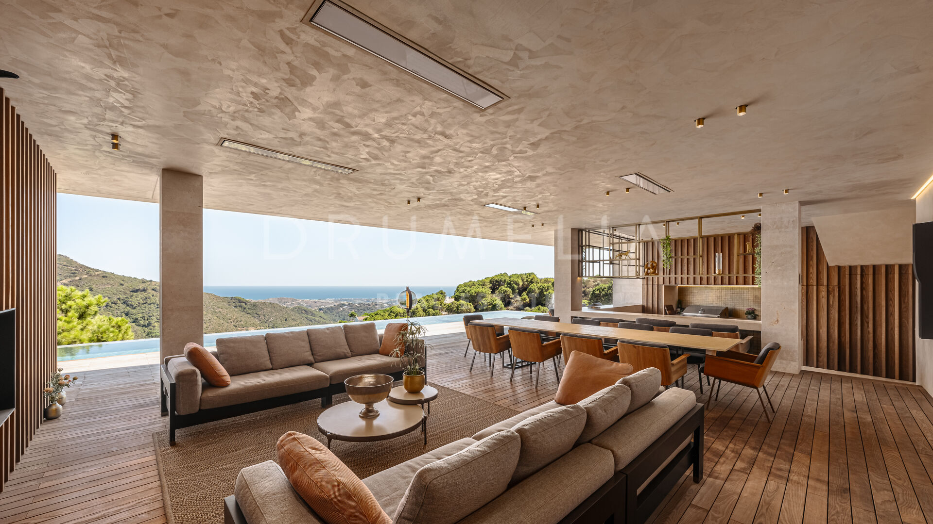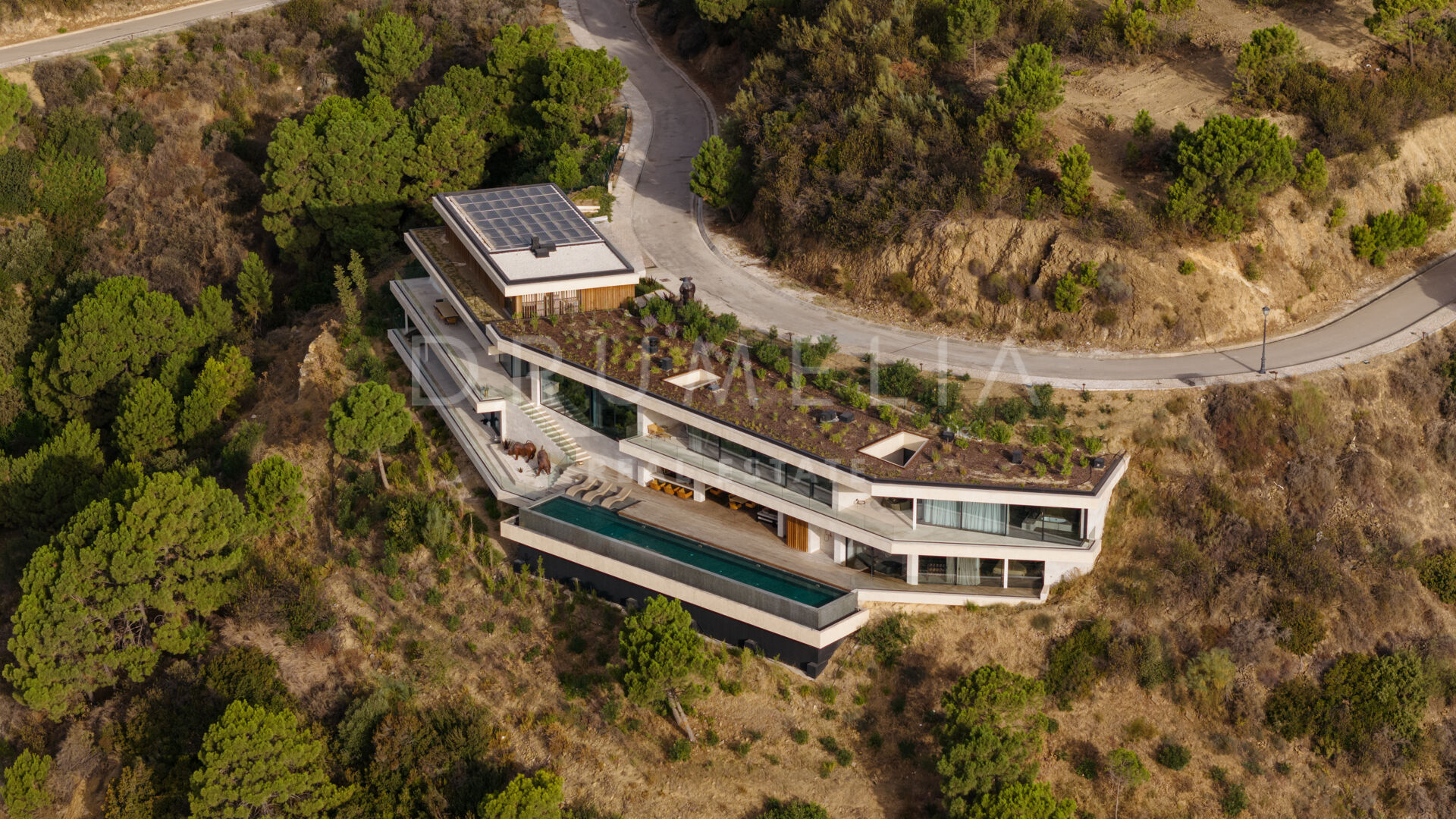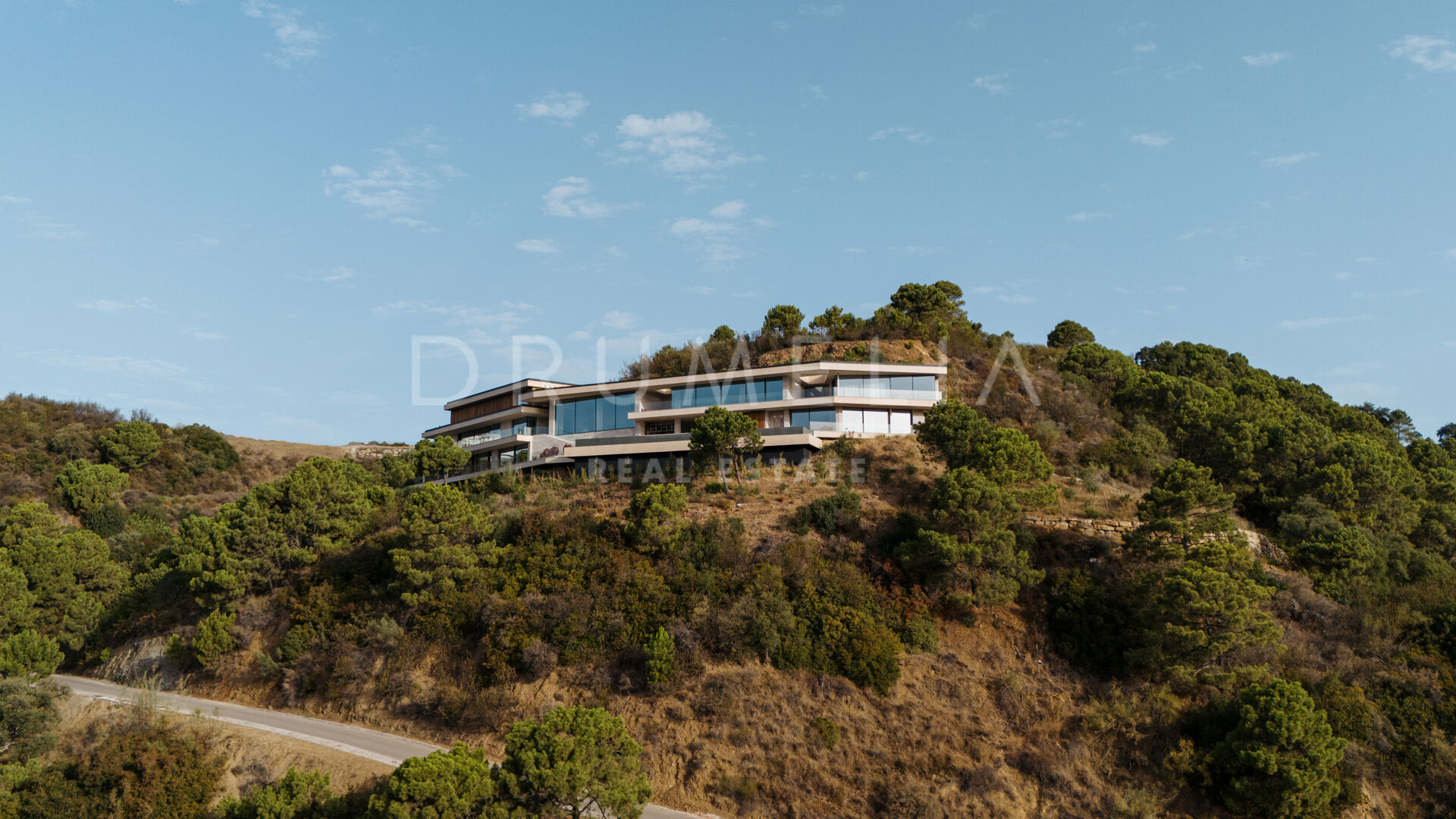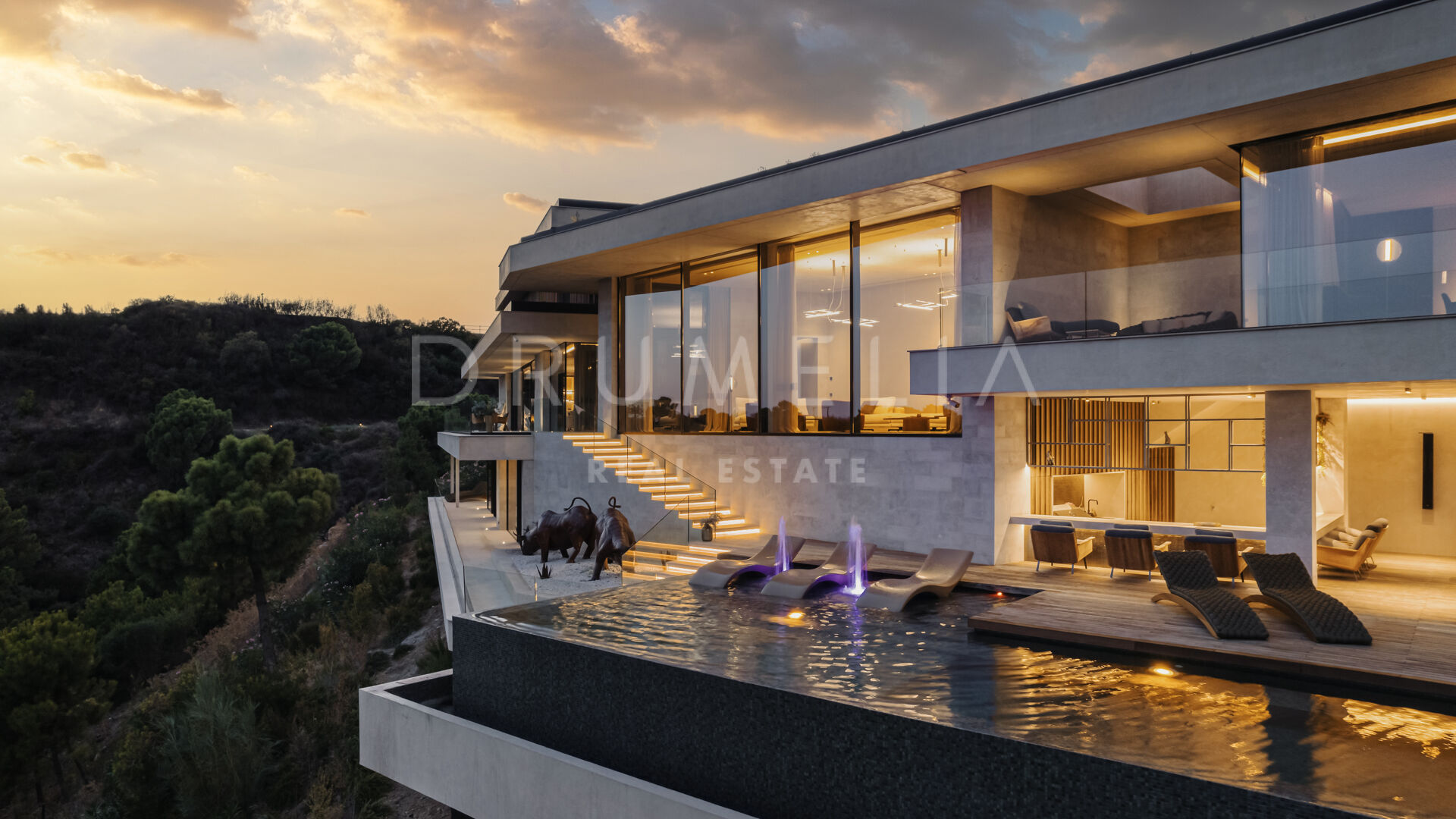 The spectacular 1100 m² house with 500 m² of terraces sits on a large 5,127 m² plot featuring a drought-tolerant garden. It is uniquely designed for comfort, enjoyment, and well-being, fully integrated with the mountains and customized to the plot, orientation, and views. The property, built with sustainable design principles, boasts a green roof, solar panels, energy-efficient LED lights, and oversized picture windows with Schüco frames offering 180-degree panoramic views of the sea and mountains.