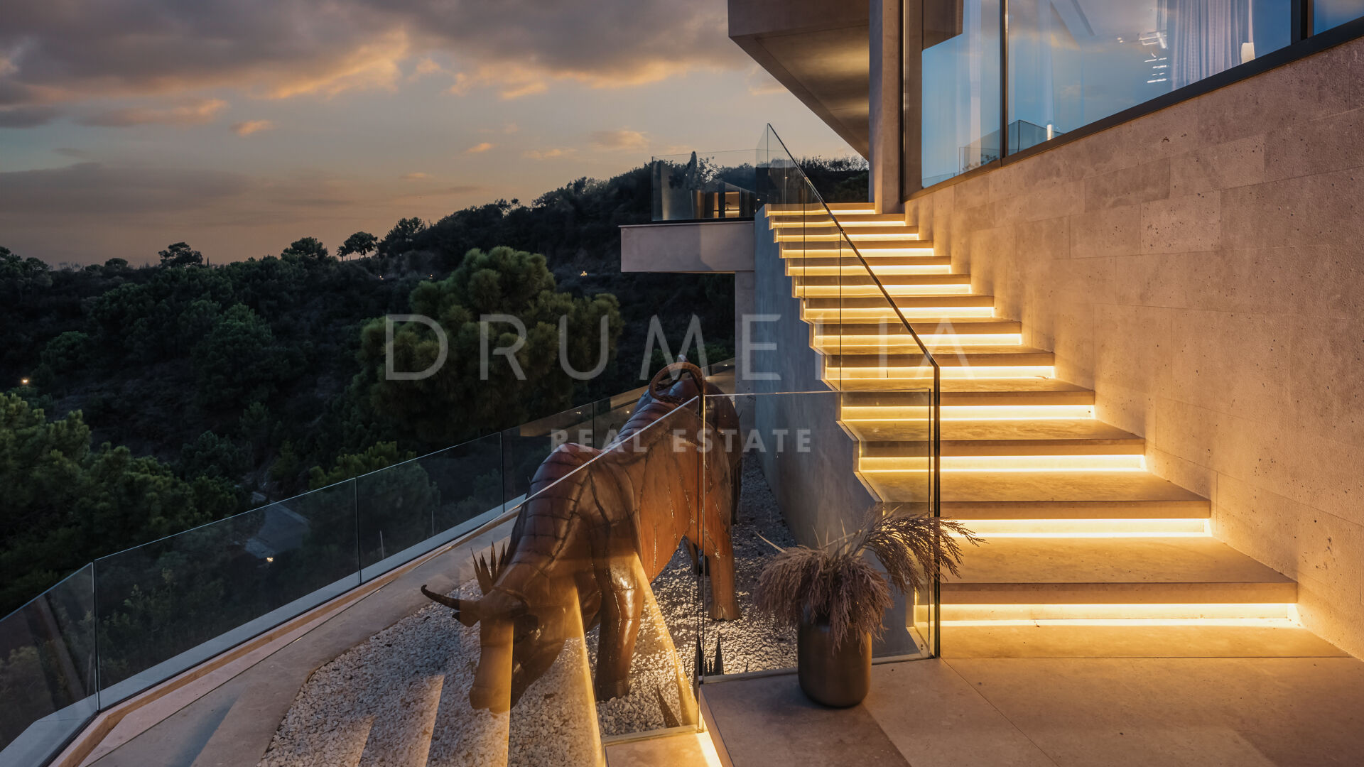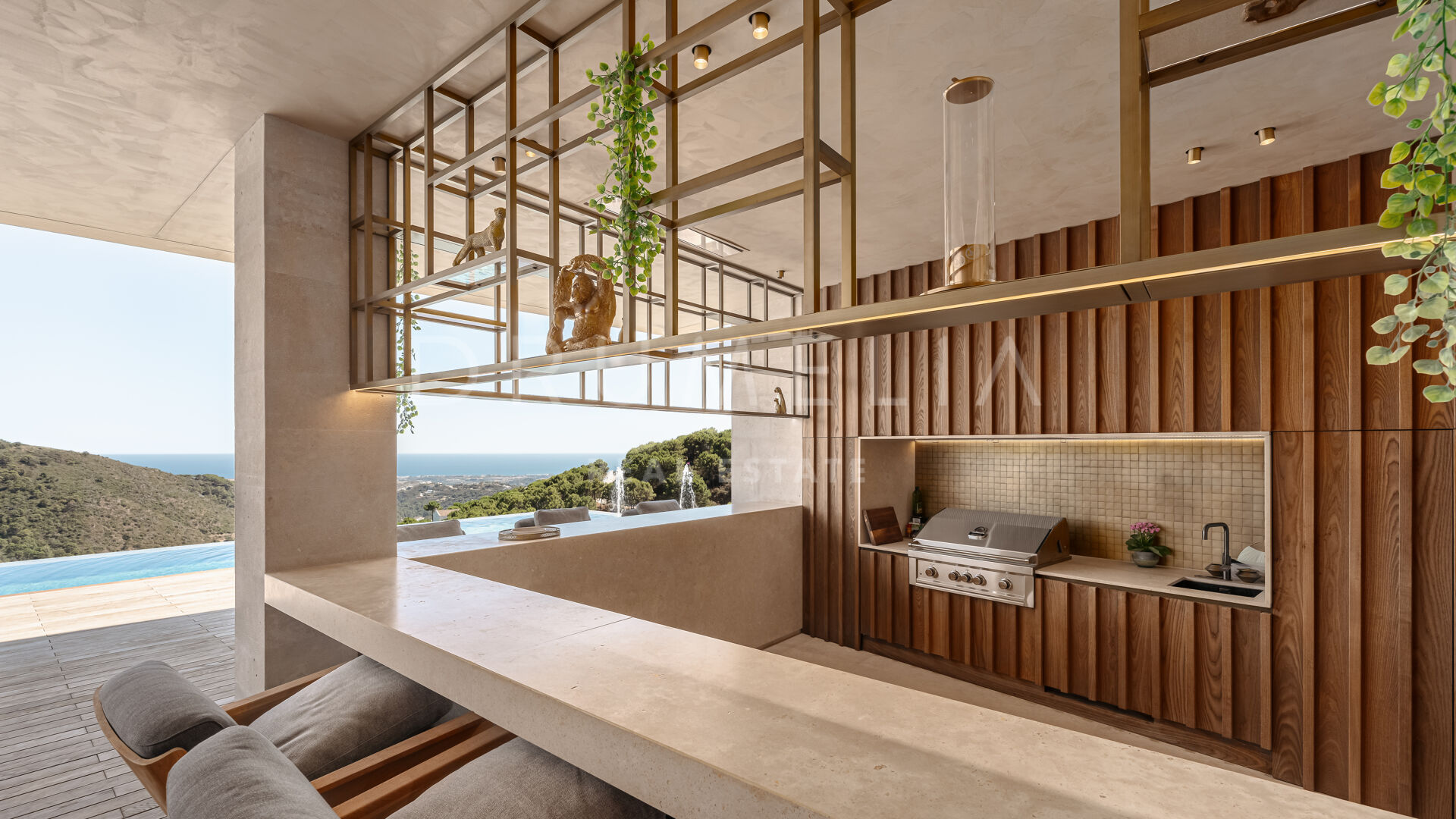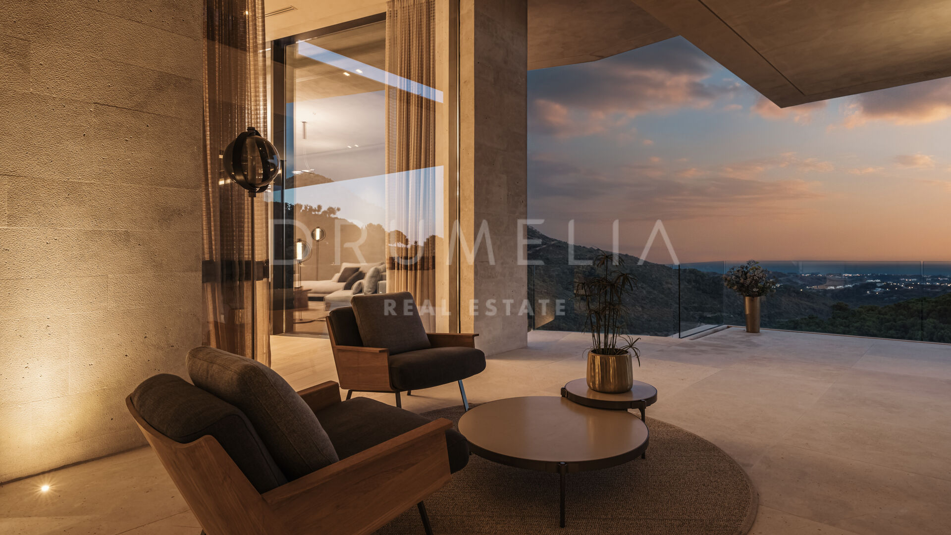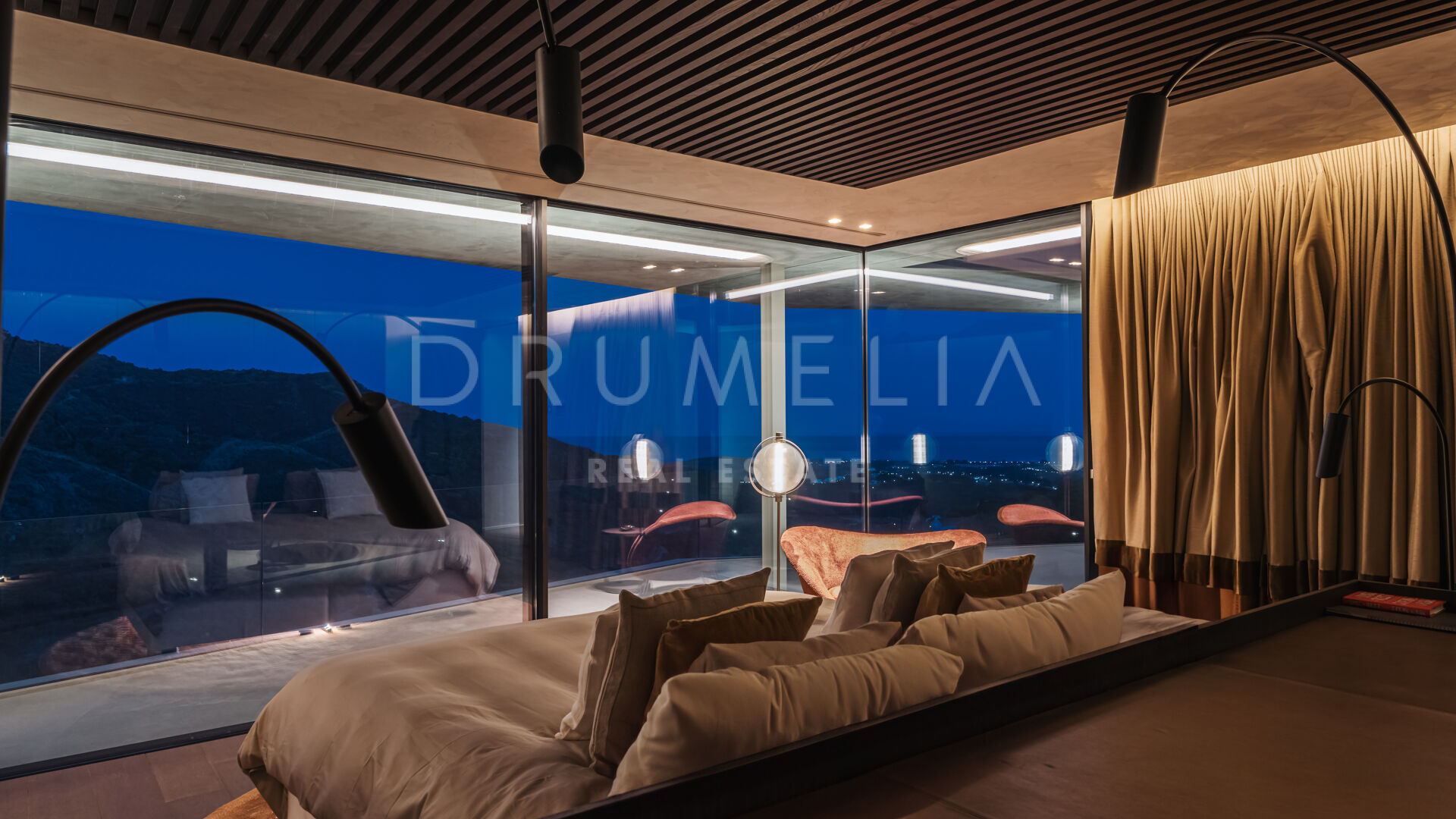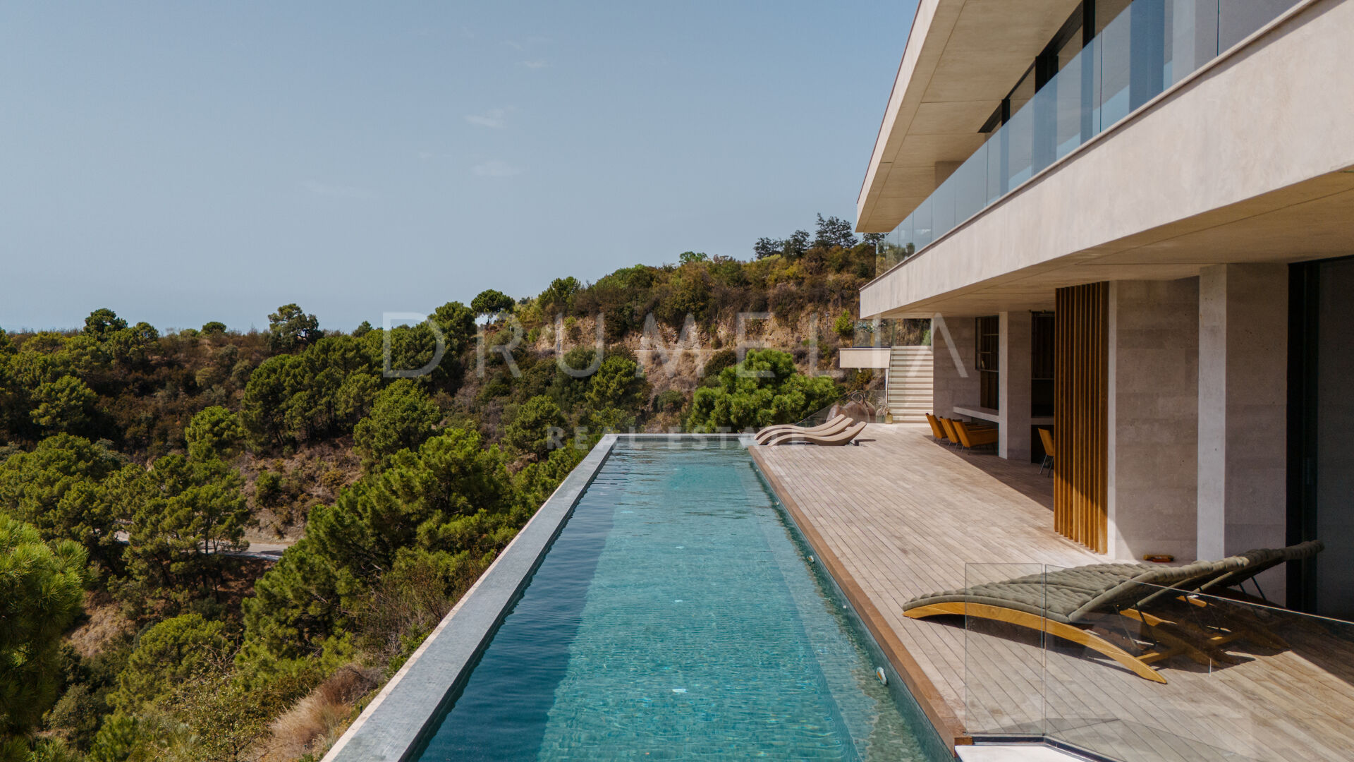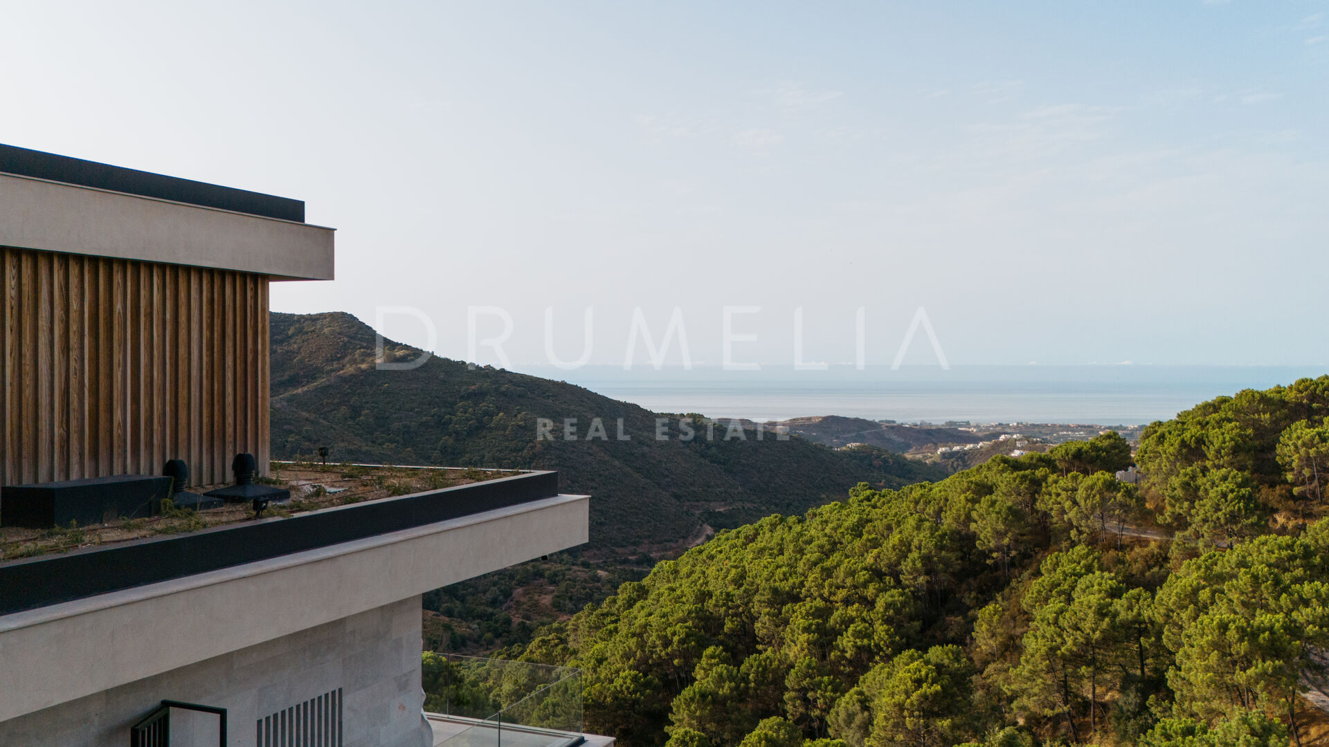 The spectacular 1100 m² house with 500 m² of terraces sits on a large 5,127 m² plot featuring a drought-tolerant garden. It is uniquely designed for comfort, enjoyment, and well-being, fully integrated with the mountains and customized to the plot, orientation, and views. The property, built with sustainable design principles, boasts a green roof, solar panels, energy-efficient LED lights, and oversized picture windows with Schüco frames offering 180-degree panoramic views of the sea and mountains.