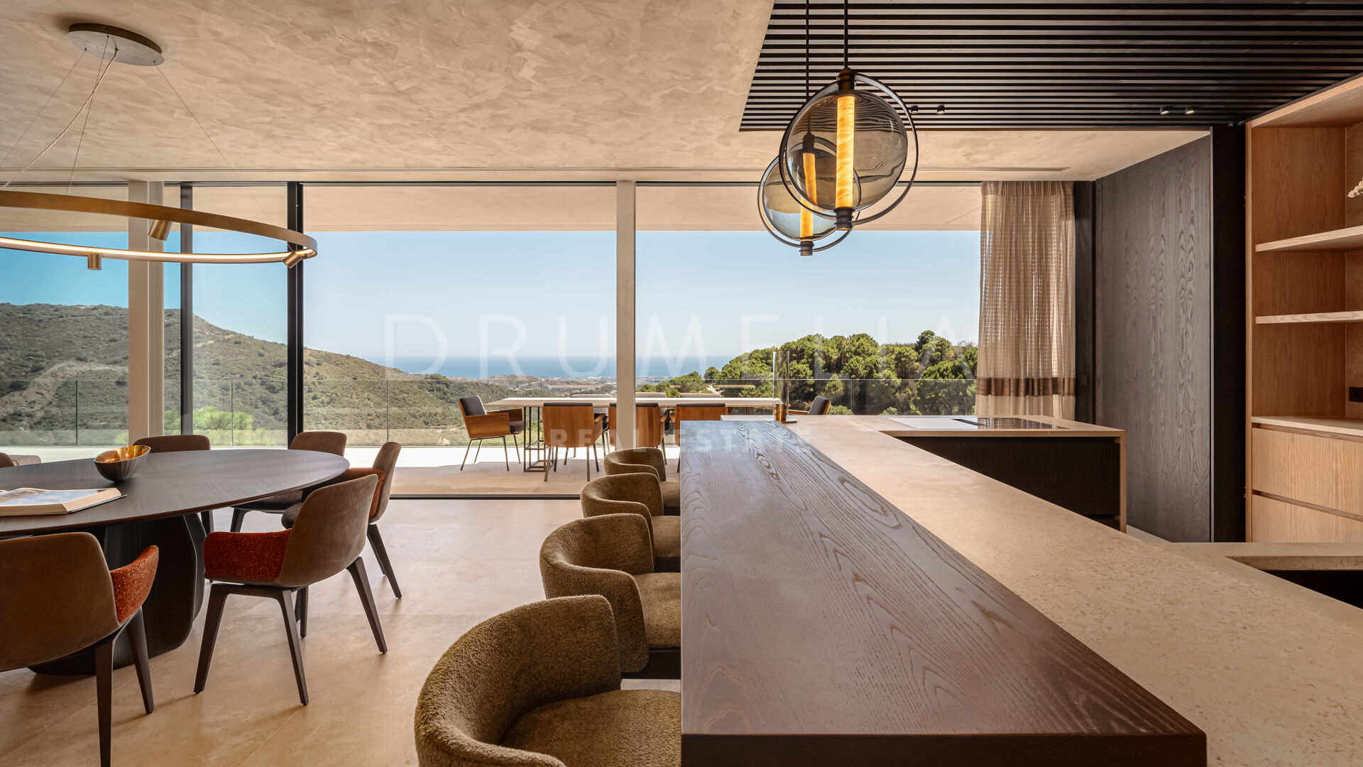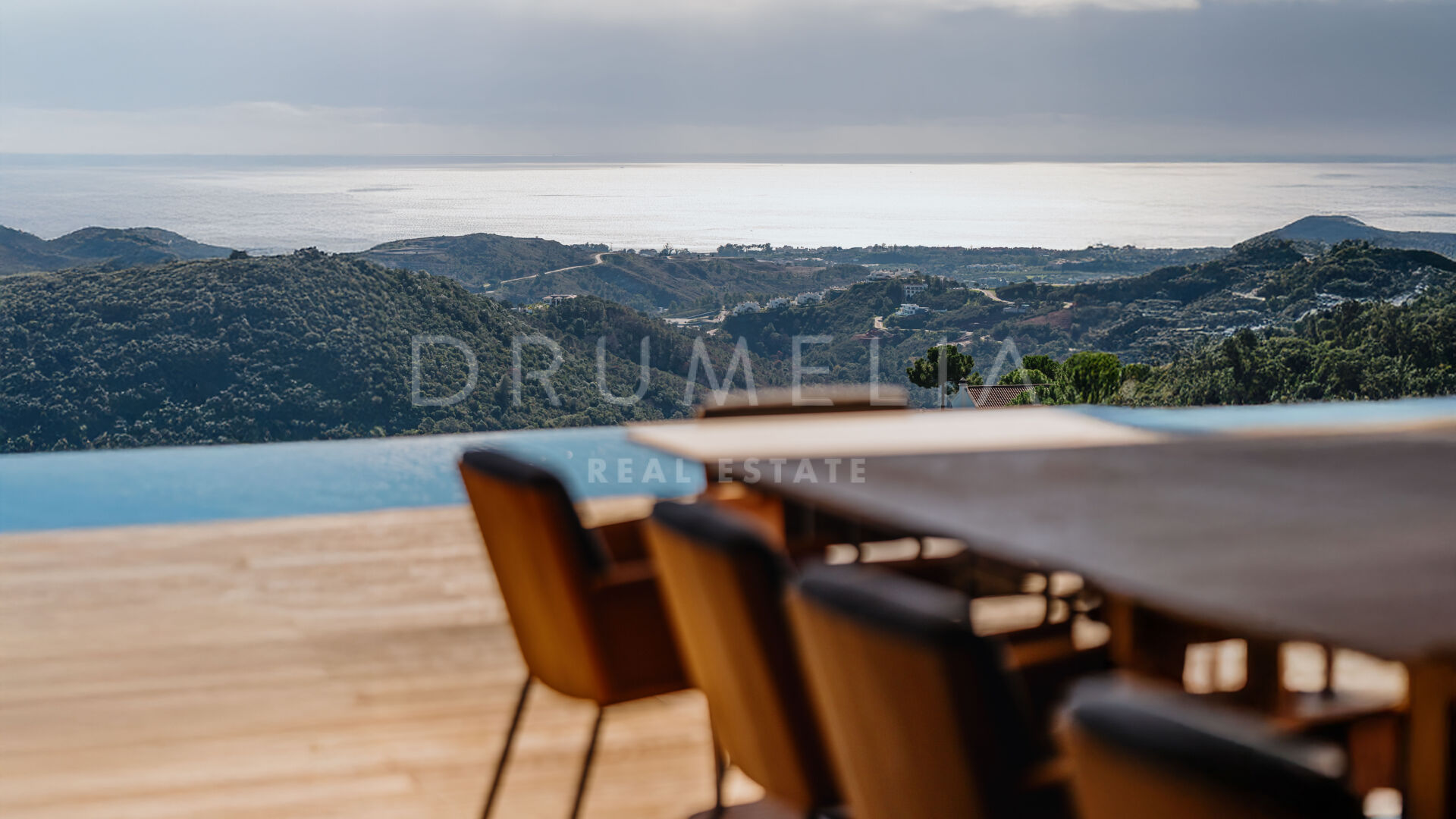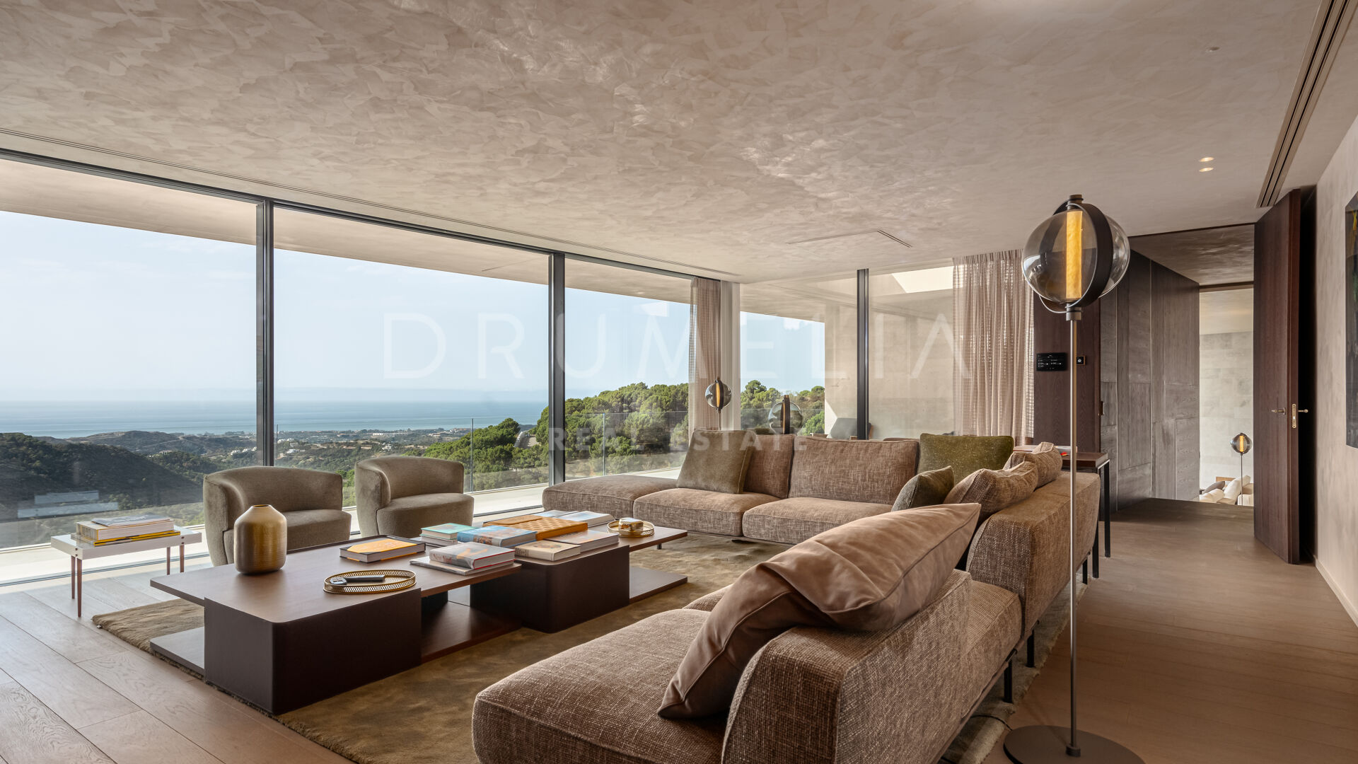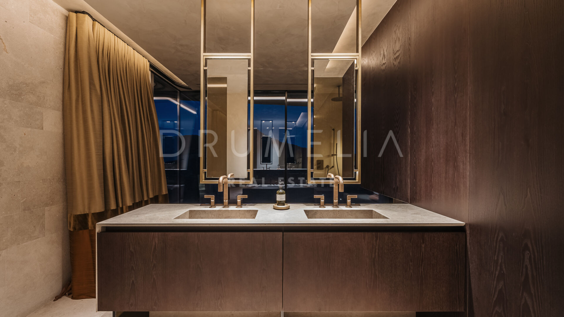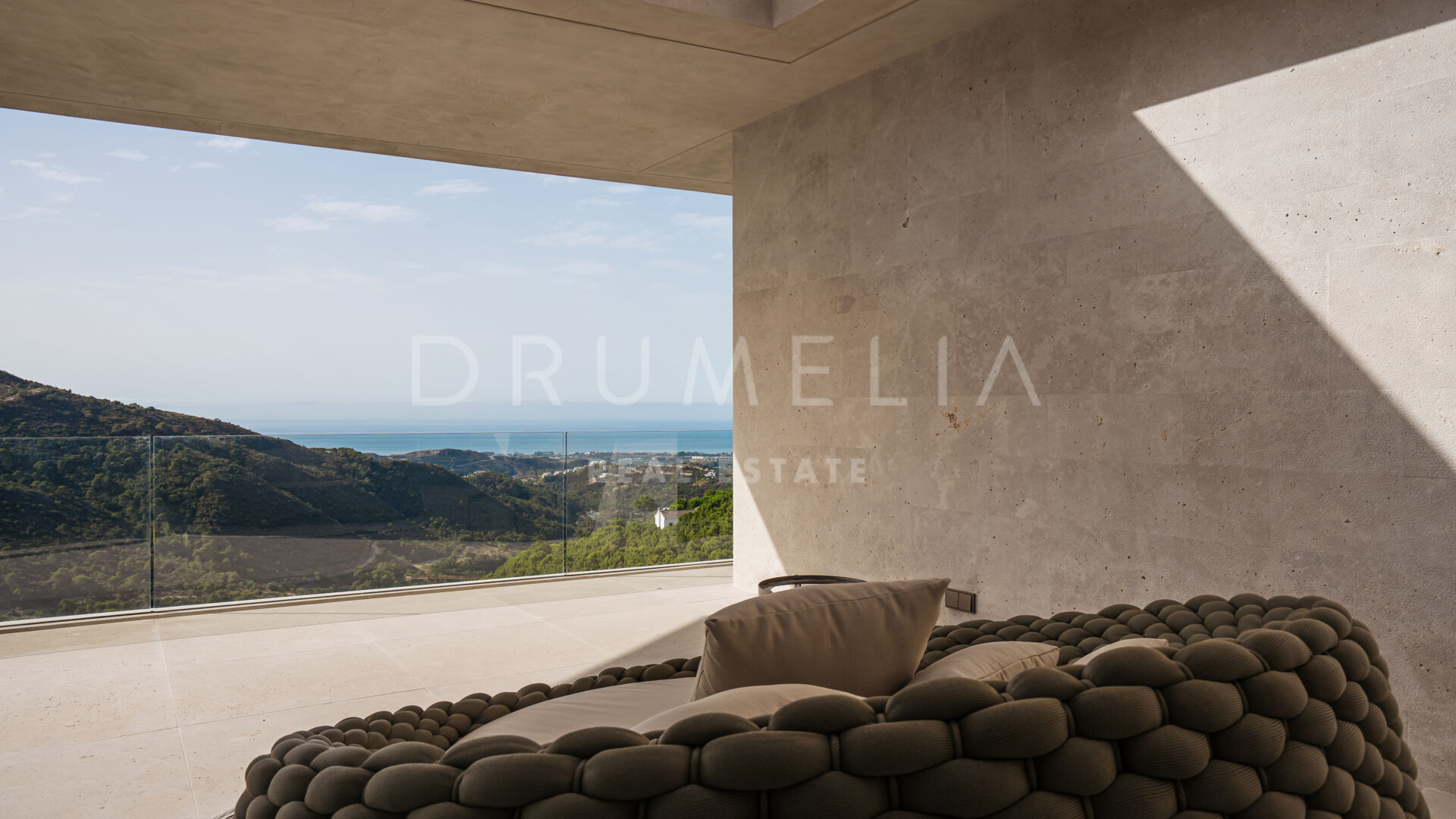 The spectacular 1100 m² house with 500 m² of terraces sits on a large 5,127 m² plot featuring a drought-tolerant garden. It is uniquely designed for comfort, enjoyment, and well-being, fully integrated with the mountains and customized to the plot, orientation, and views. The property, built with sustainable design principles, boasts a green roof, solar panels, energy-efficient LED lights, and oversized picture windows with Schüco frames offering 180-degree panoramic views of the sea and mountains.