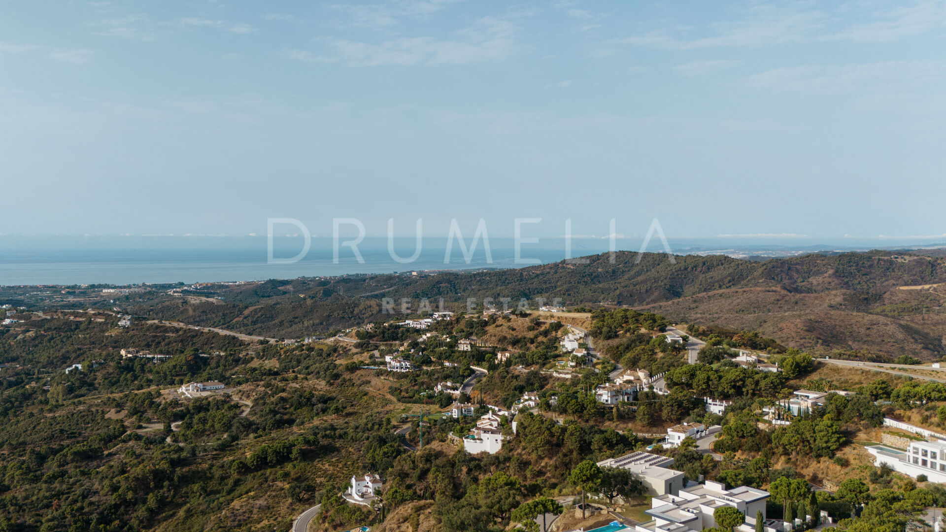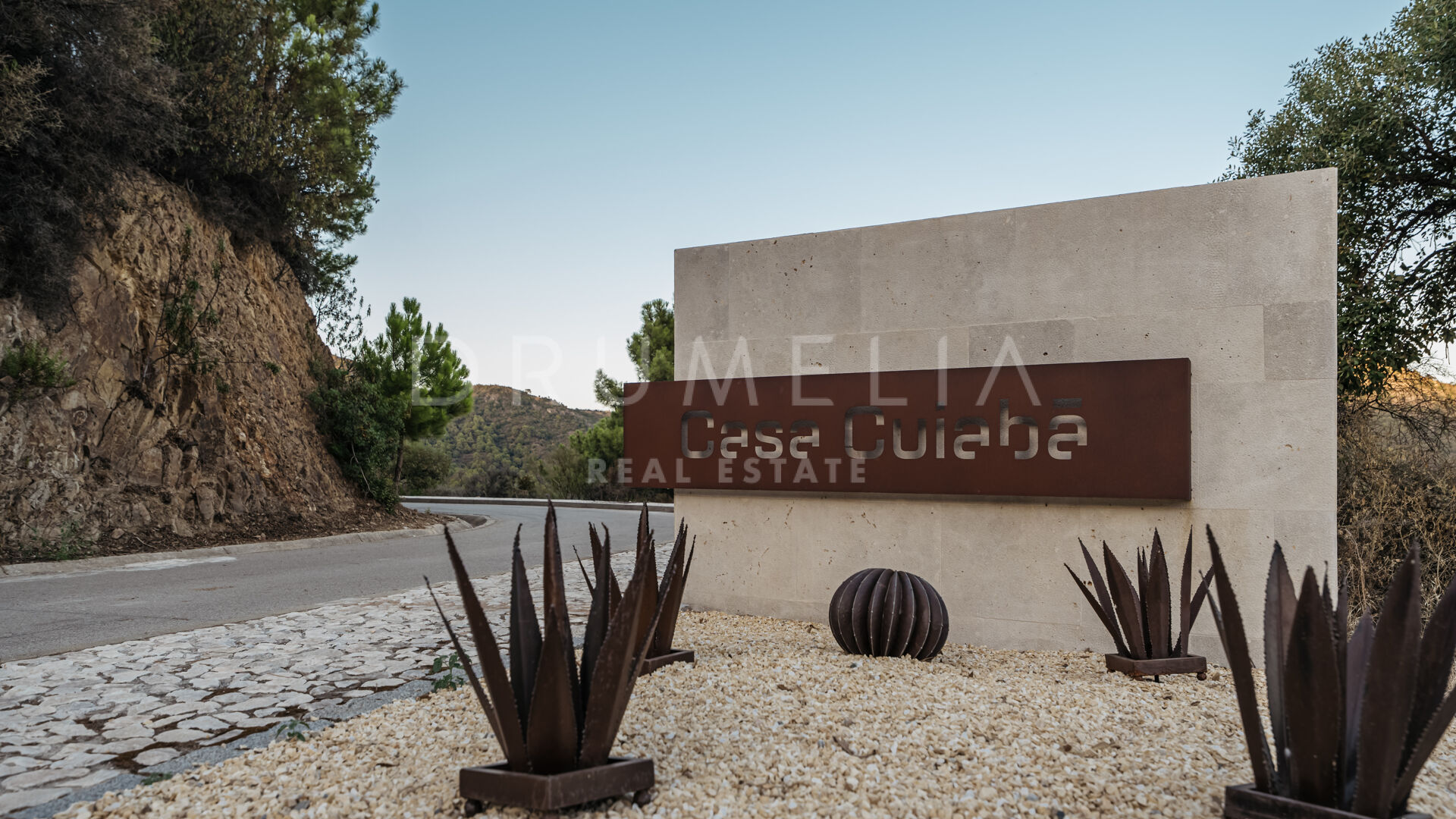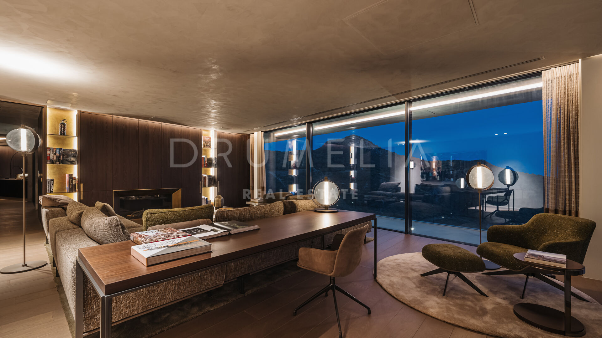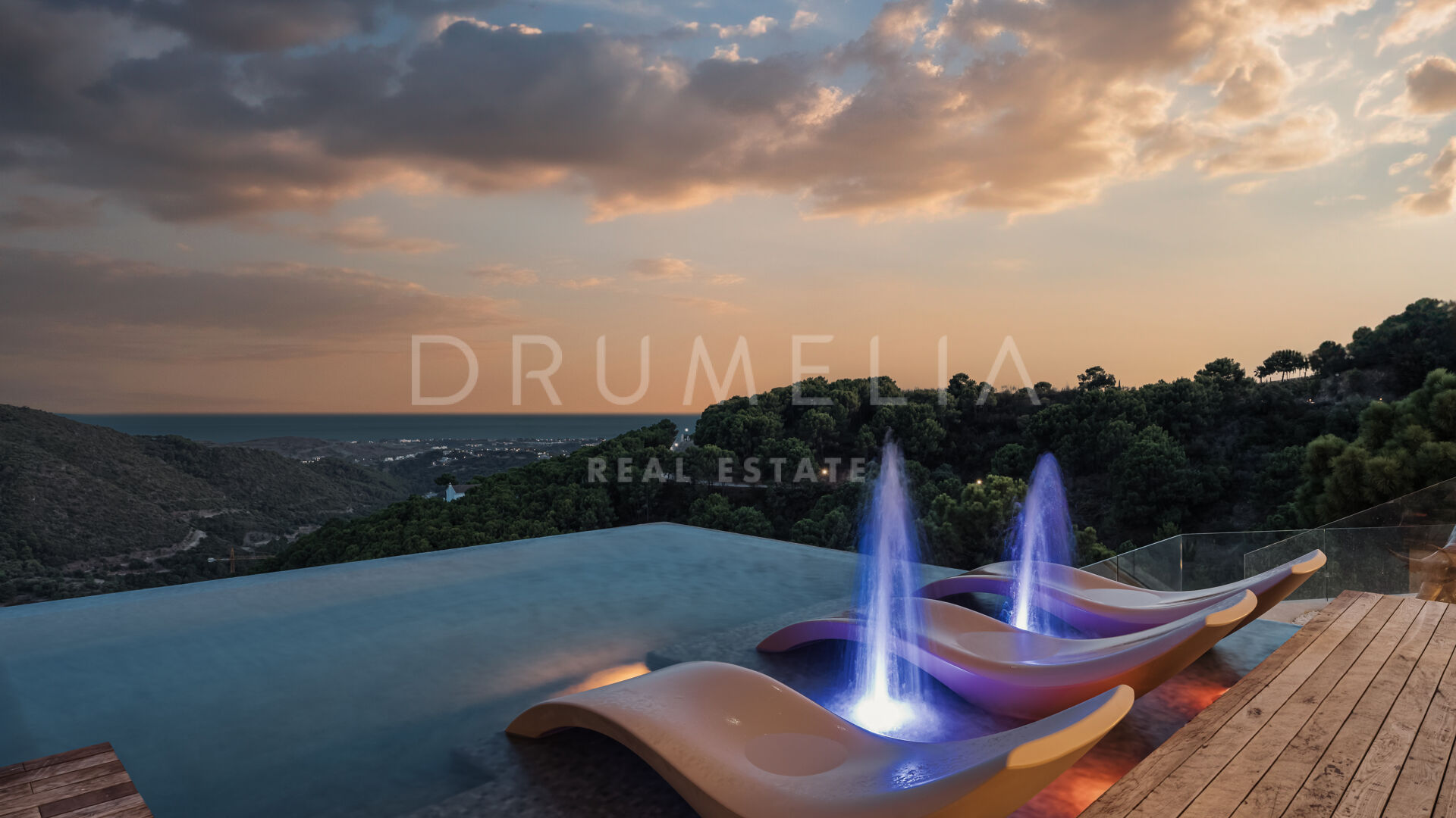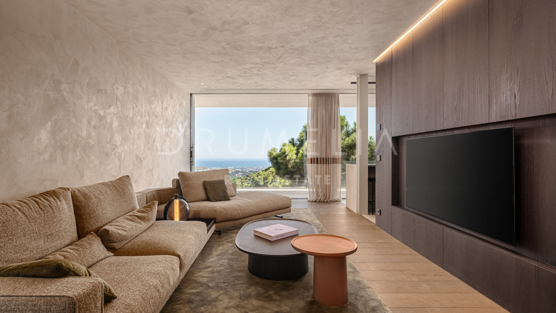 The spectacular 1100 m² house with 500 m² of terraces sits on a large 5,127 m² plot featuring a drought-tolerant garden. It is uniquely designed for comfort, enjoyment, and well-being, fully integrated with the mountains and customized to the plot, orientation, and views. The property, built with sustainable design principles, boasts a green roof, solar panels, energy-efficient LED lights, and oversized picture windows with Schüco frames offering 180-degree panoramic views of the sea and mountains.