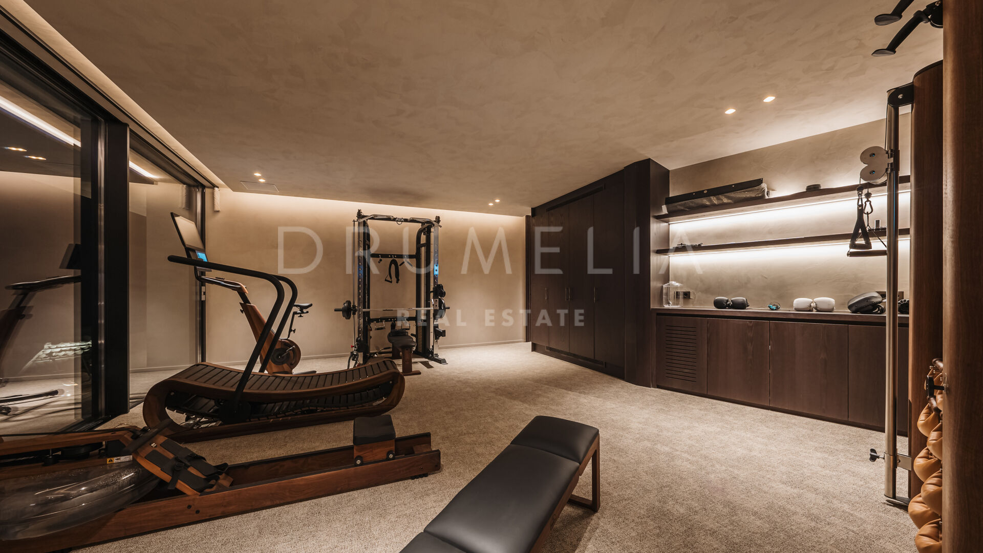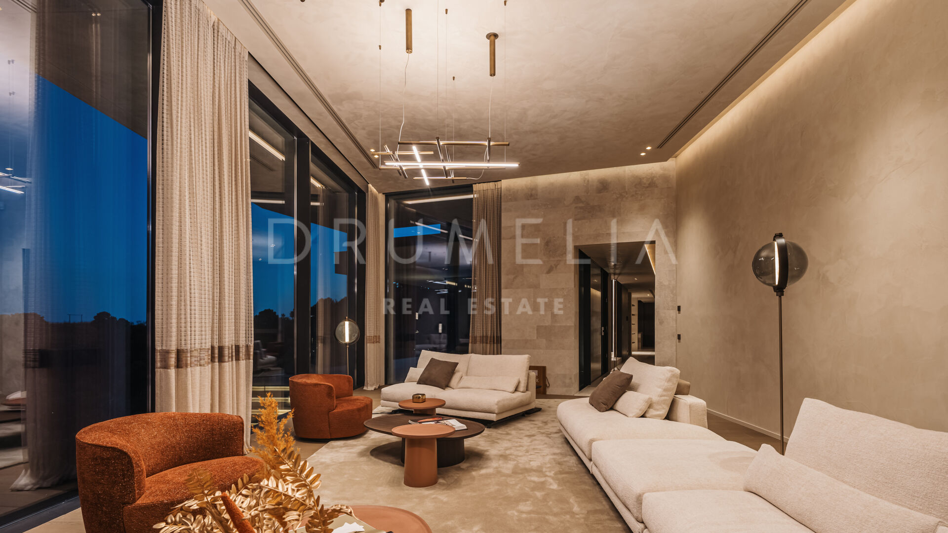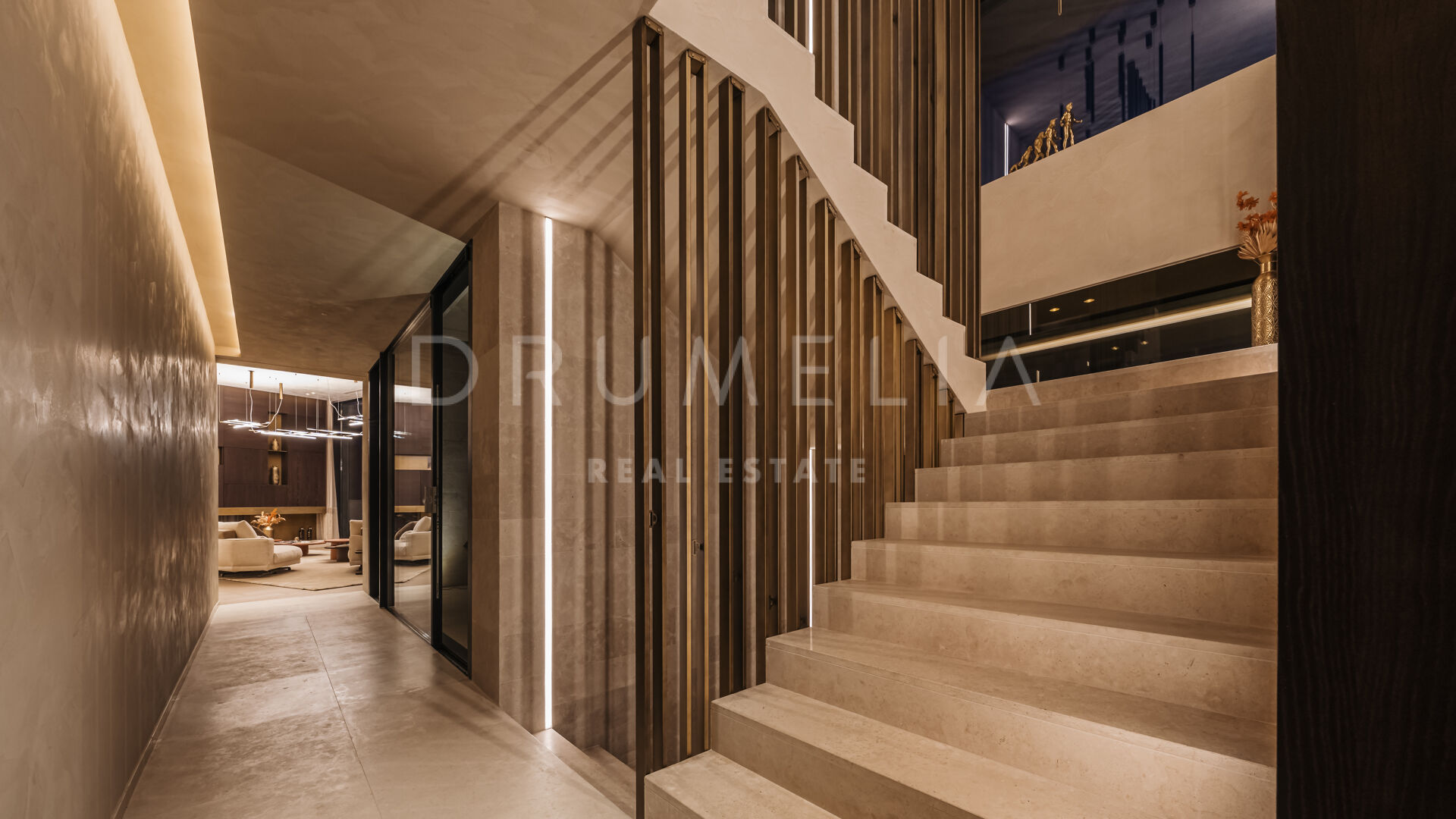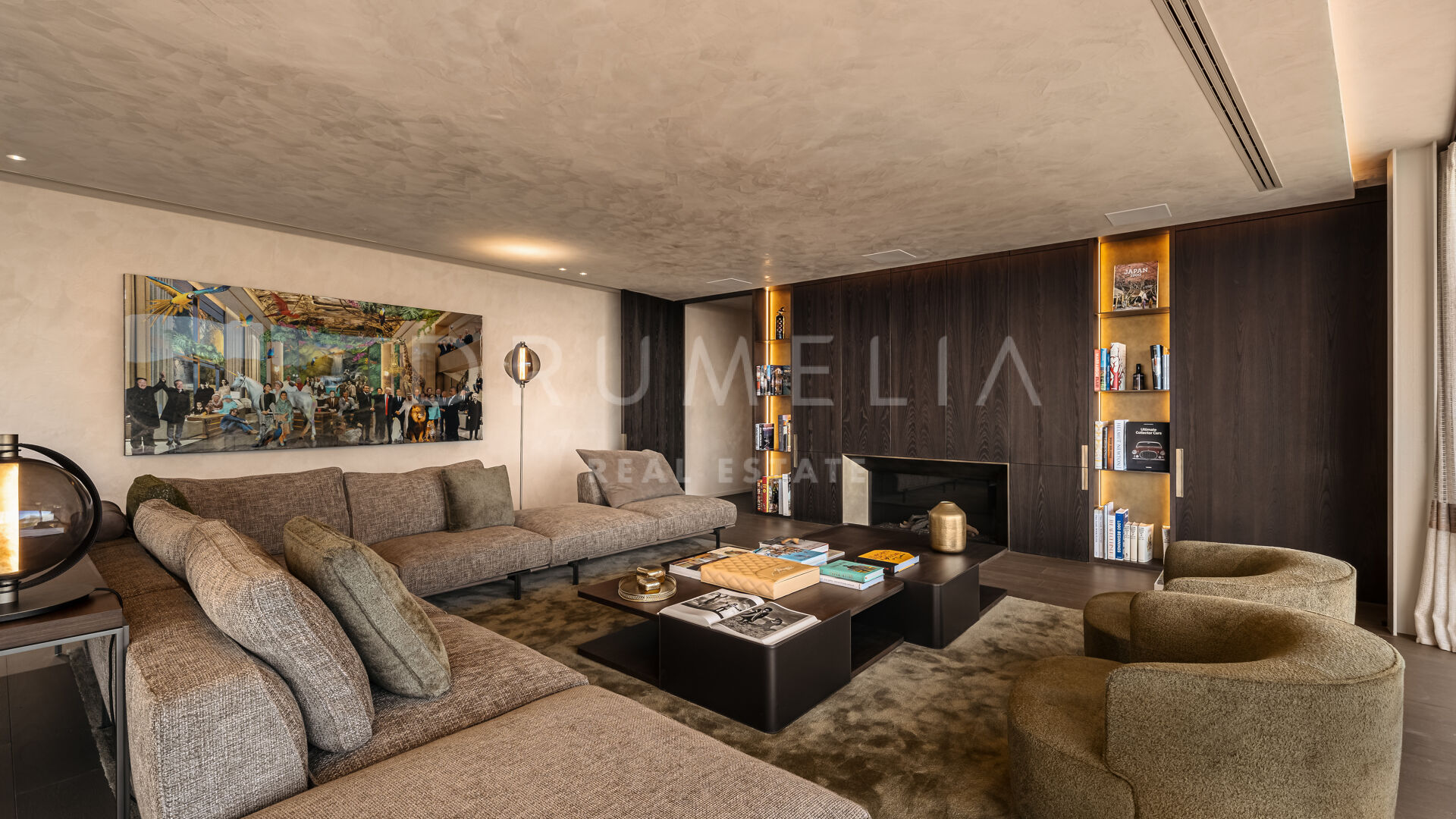 The home is tastefully furnished with high-end Italian furniture by Minotti, Molteni, Gessi, and DeCastelli, featuring superior finishes, sophisticated ceiling and lighting design, multiple gas fireplaces, fitted wardrobes, seamless doors and cupboards, glass patio doors, double glazing, and more. It includes a full Domotic system by Control 4, an integrated sound and video system with stealth speakers (NVidia, Netflix, Tune IN, Tidal, Zapitti, Karaoke), an adaptive AC system, and an automatic aromatic diffuser system. Two elevators are conveniently located, one near the kitchens and one close to the Master bedroom, with the possibility of integrating an indoor pool.