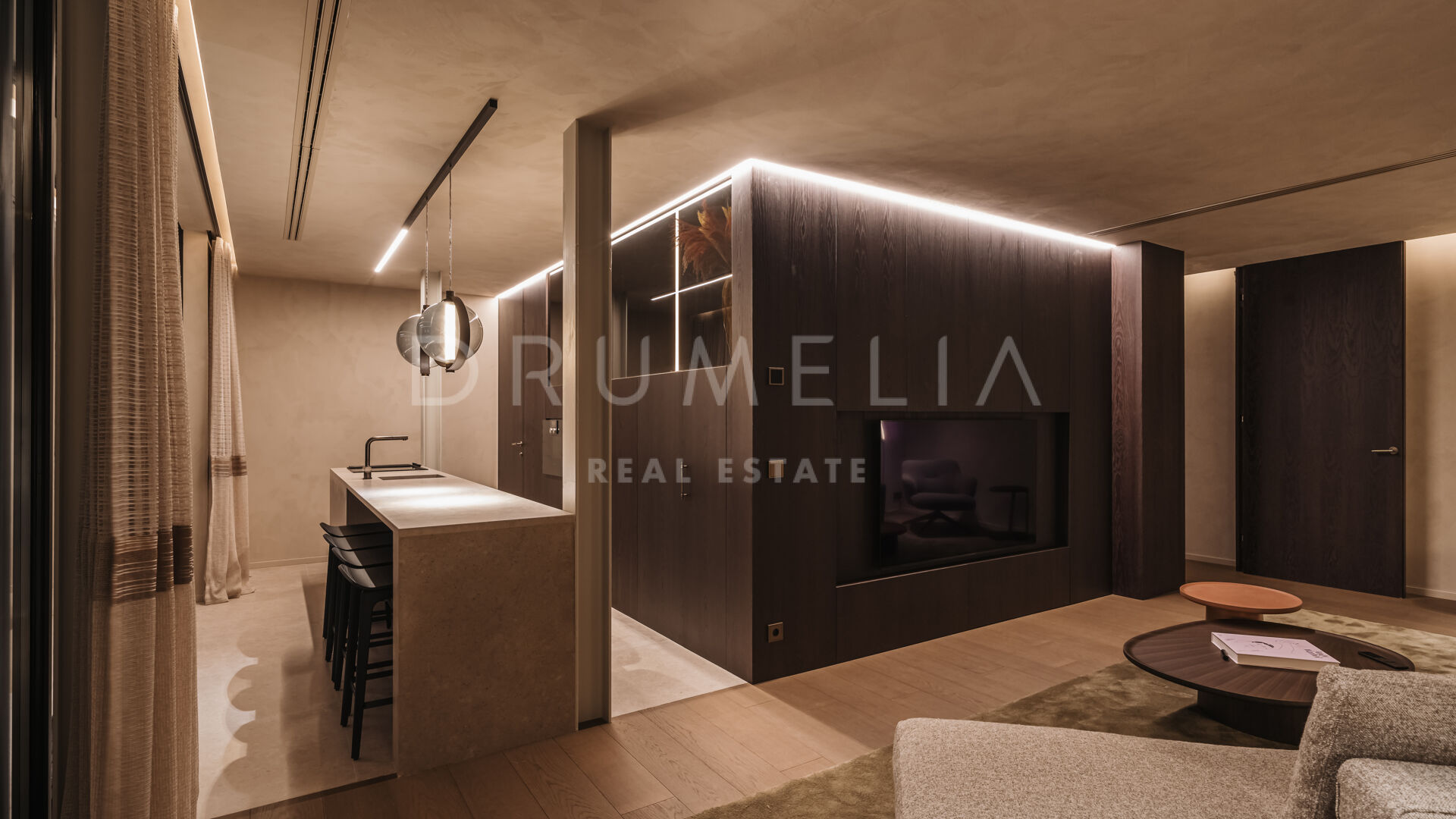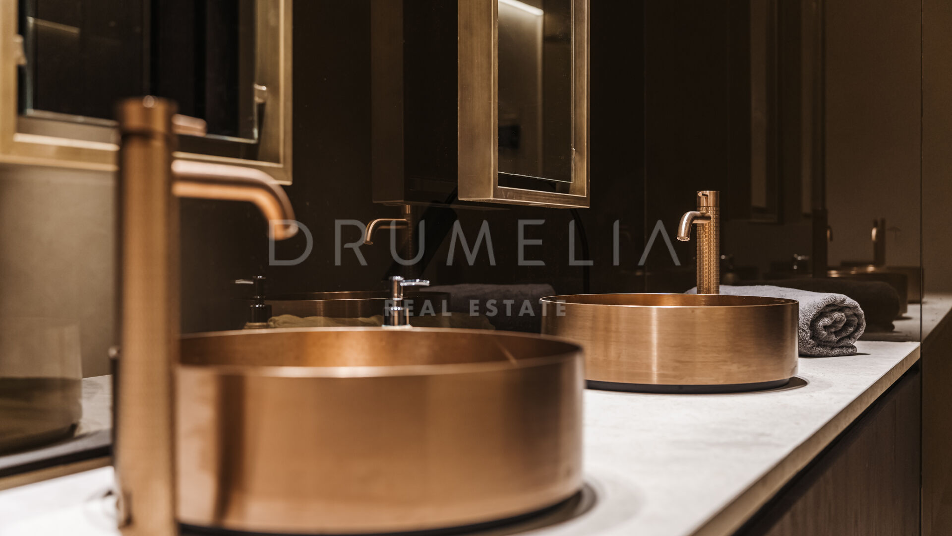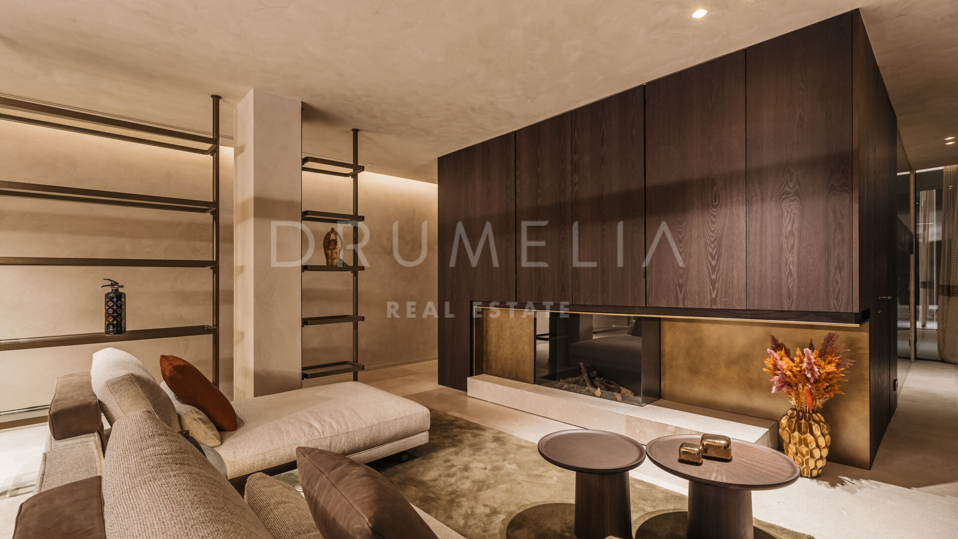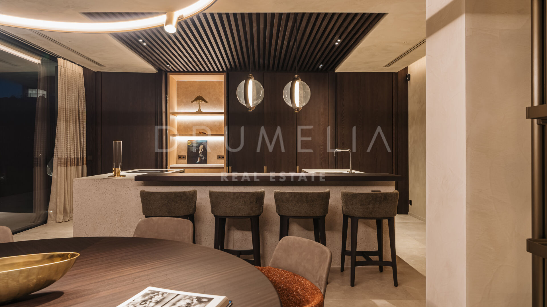 The home is tastefully furnished with high-end Italian furniture by Minotti, Molteni, Gessi, and DeCastelli, featuring superior finishes, sophisticated ceiling and lighting design, multiple gas fireplaces, fitted wardrobes, seamless doors and cupboards, glass patio doors, double glazing, and more. It includes a full Domotic system by Control 4, an integrated sound and video system with stealth speakers (NVidia, Netflix, Tune IN, Tidal, Zapitti, Karaoke), an adaptive AC system, and an automatic aromatic diffuser system. Two elevators are conveniently located, one near the kitchens and one close to the Master bedroom, with the possibility of integrating an indoor pool.