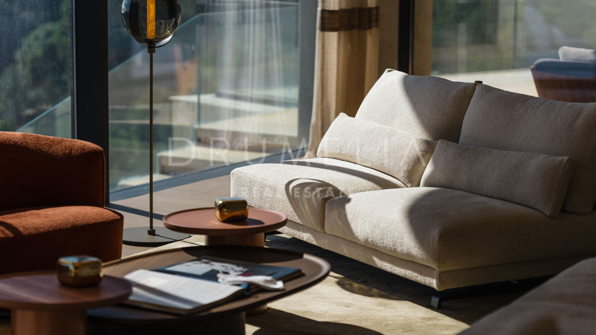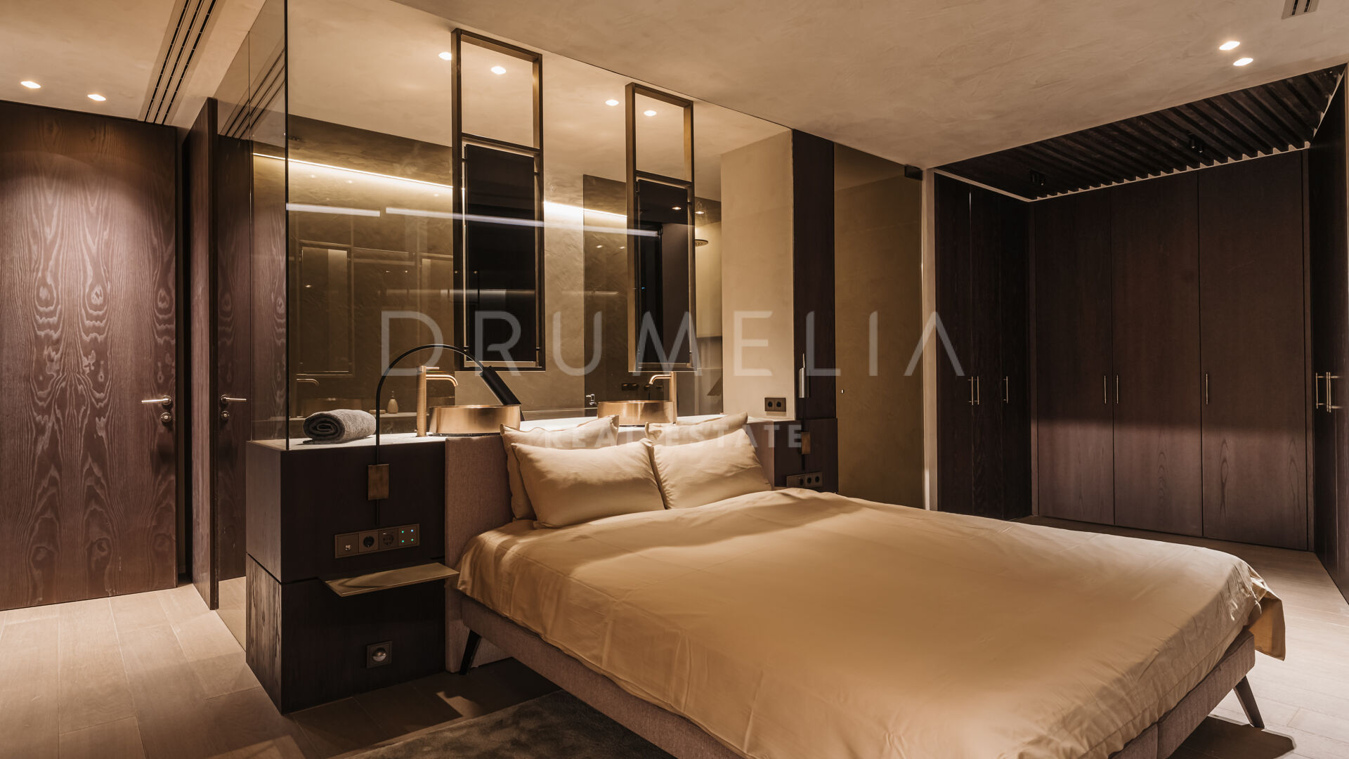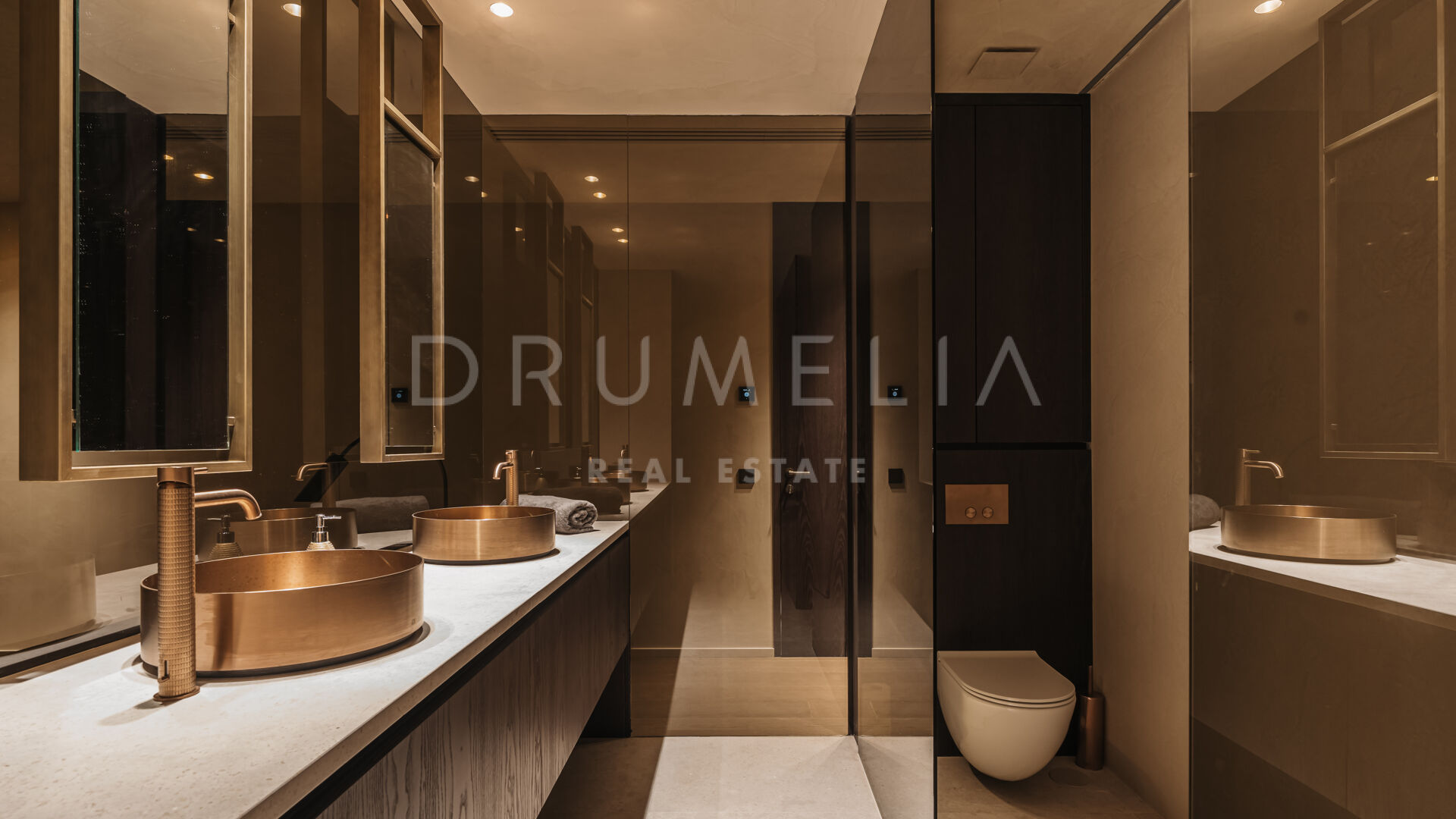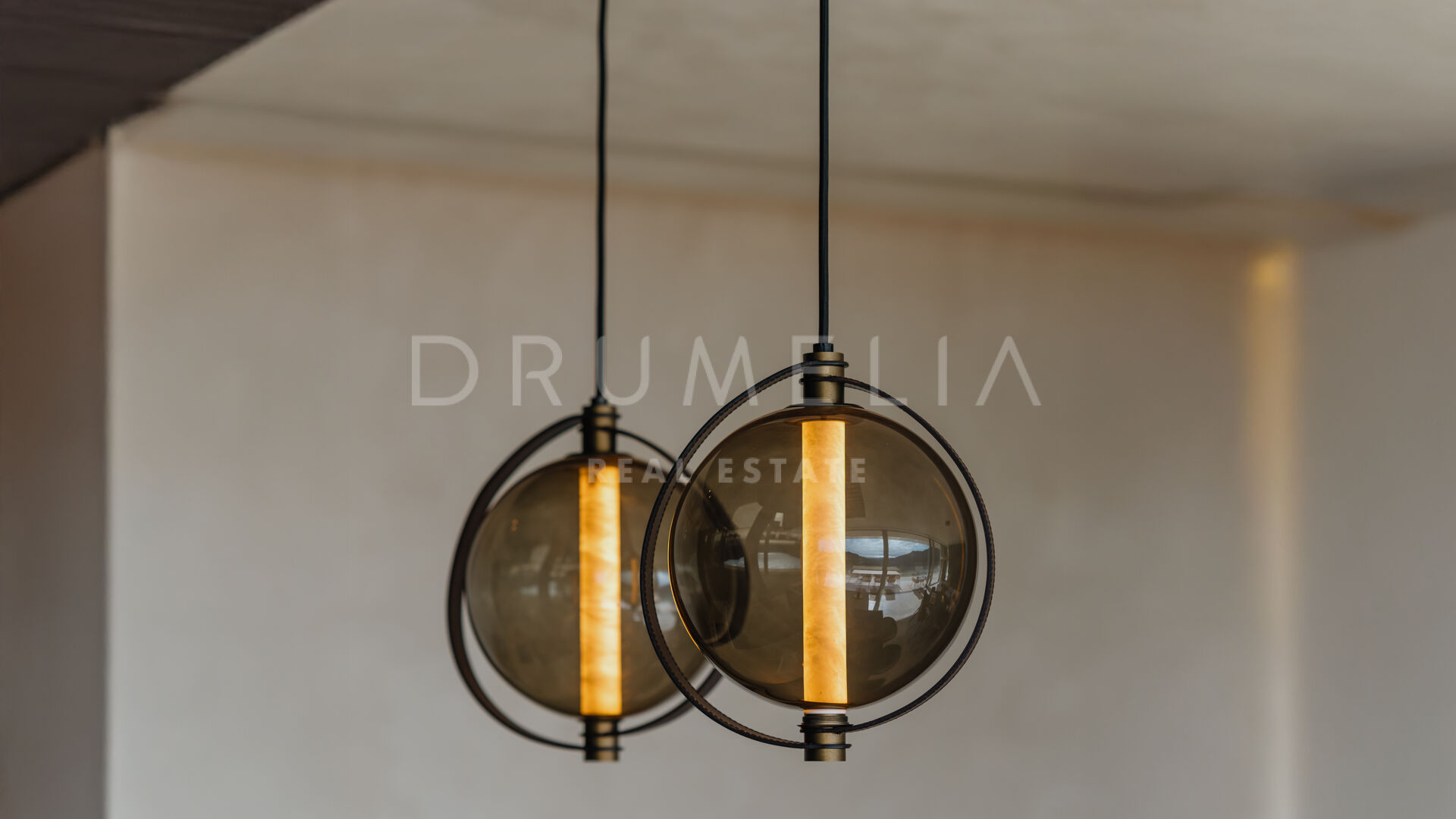 The home is tastefully furnished with high-end Italian furniture by Minotti, Molteni, Gessi, and DeCastelli, featuring superior finishes, sophisticated ceiling and lighting design, multiple gas fireplaces, fitted wardrobes, seamless doors and cupboards, glass patio doors, double glazing, and more. It includes a full Domotic system by Control 4, an integrated sound and video system with stealth speakers (NVidia, Netflix, Tune IN, Tidal, Zapitti, Karaoke), an adaptive AC system, and an automatic aromatic diffuser system. Two elevators are conveniently located, one near the kitchens and one close to the Master bedroom, with the possibility of integrating an indoor pool.