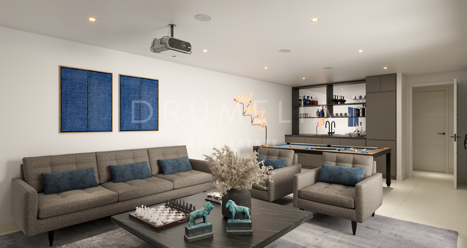 This spectacular 4-bedroom house of the progressive concept is set in a newly launched development offered for sale in El Campanario, Estepona, in the heart of Golf Triangle (Campanario – Paraiso – Atalaya golf courses). The exclusive gated community provides a collection of beautifully designed 8 contemporary villas and access to some of the finest lifestyle amenities. It is located on the New Golden Mile, the stretch of coastline between San Pedro, a part of Marbella, and Estepona, just a short drive from golf courses, sandy beaches, international schools, glamourous Puerto Banus, Marbella, Estepona and Benahavis. It will take you less than an hour to drive to both Gibraltar and Malaga airports. The New Golden Mile continues to grow in popularity. It is home to some of the spectacular established complexes and high-end houses located within walking distance of shops, restaurants and beaches, and several world-famous luxury hotels.