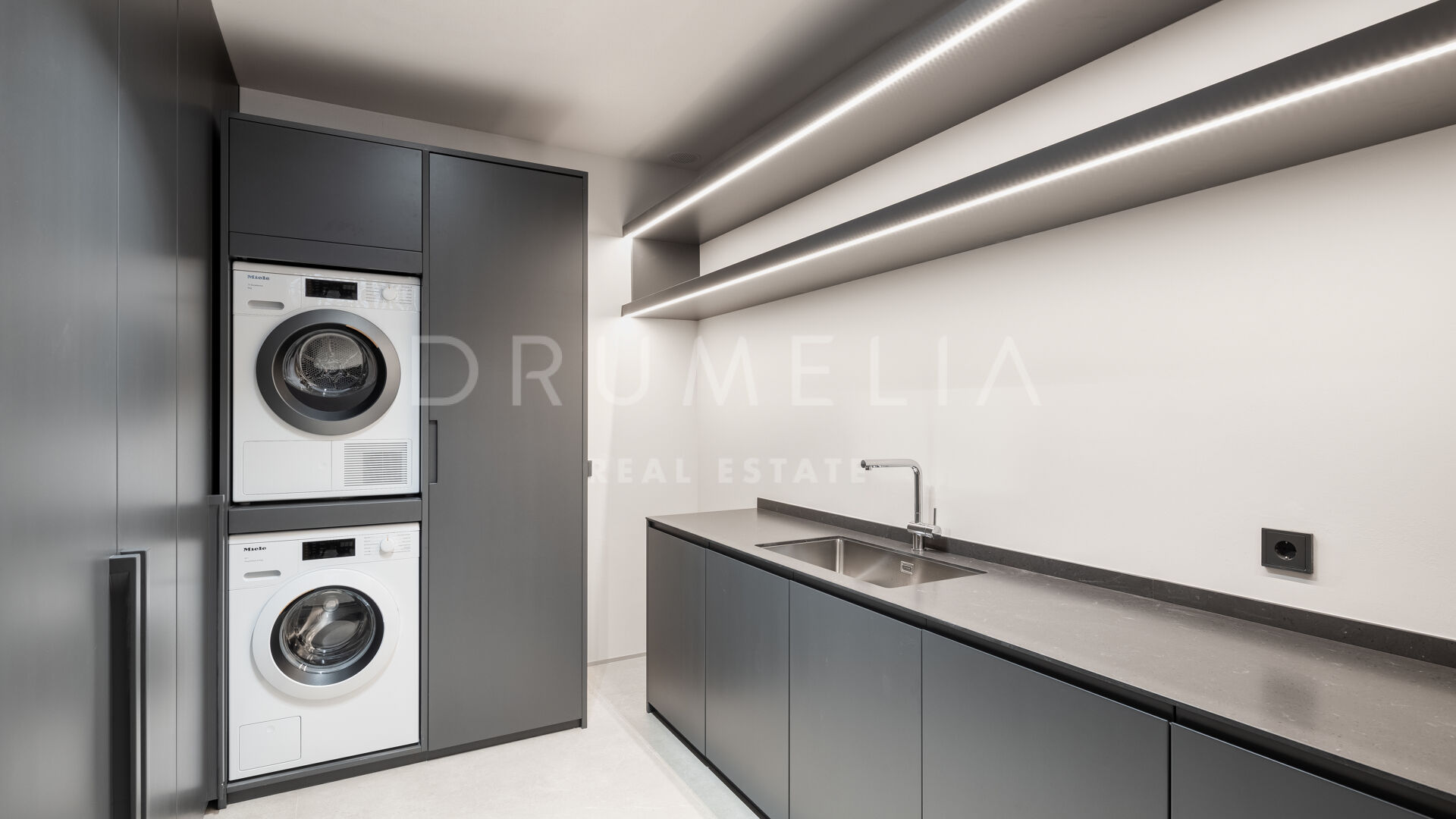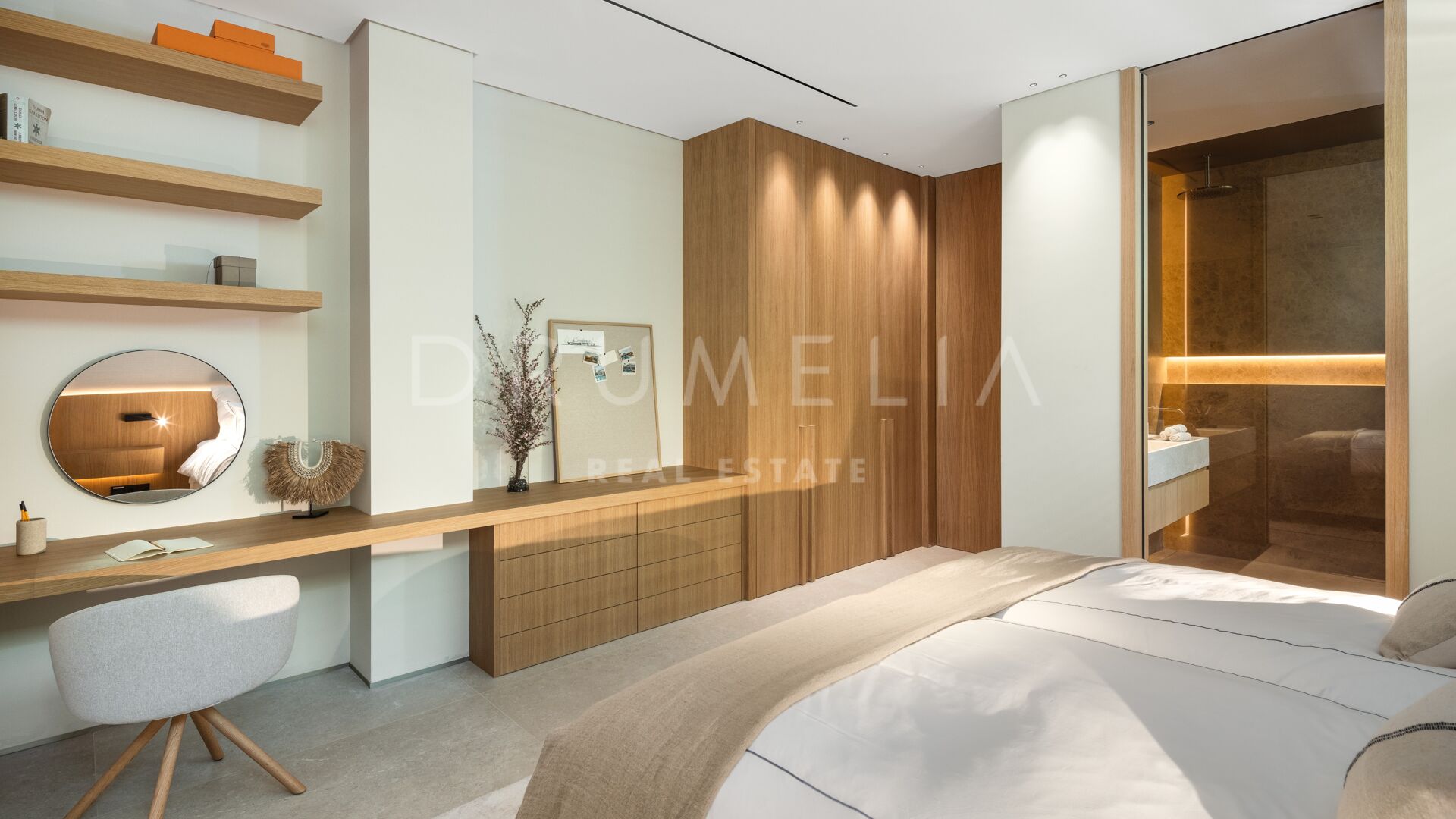 Inside, the open-plan living, dining, and kitchen area is flooded with natural light from floor-to-ceiling windows and a double-height ceiling. The living area showcases exquisite Travertino Tajal stone walls and a cozy nook with beautiful trees. The kitchen is a culinary dream with top-of-the-line appliances, natural oak finishes, and ample storage. A lift connects all levels, leading to a rooftop terrace with 360º views of La Concha and the Mediterranean Sea.