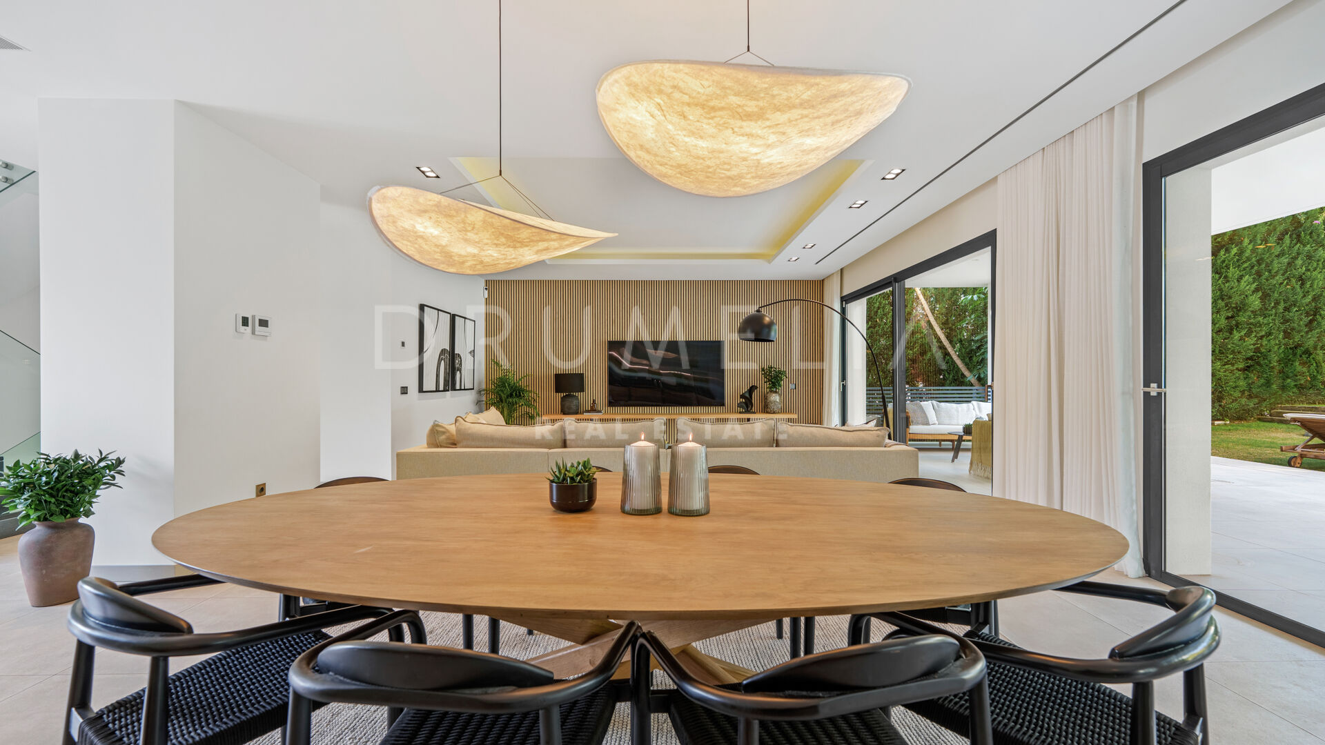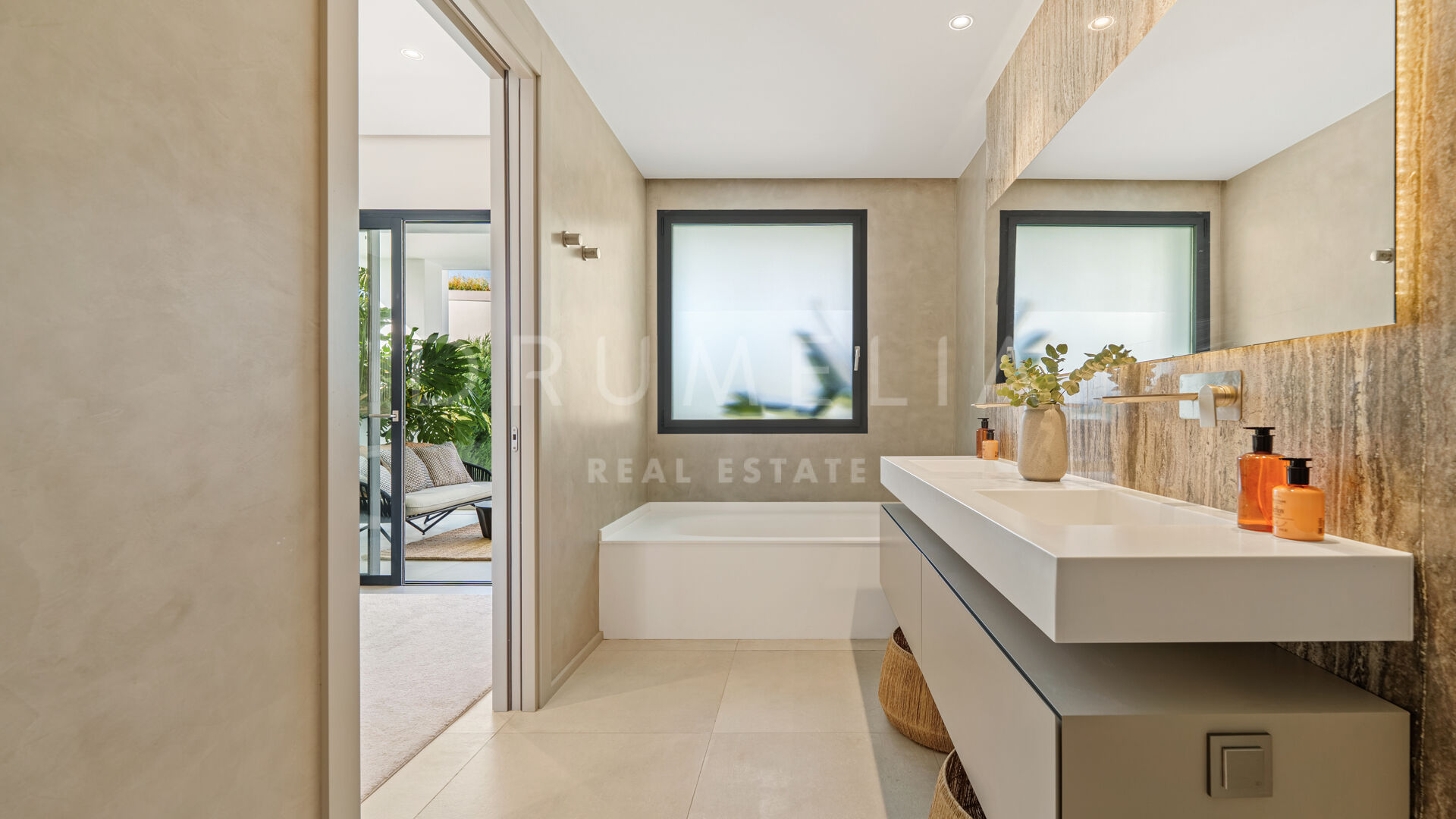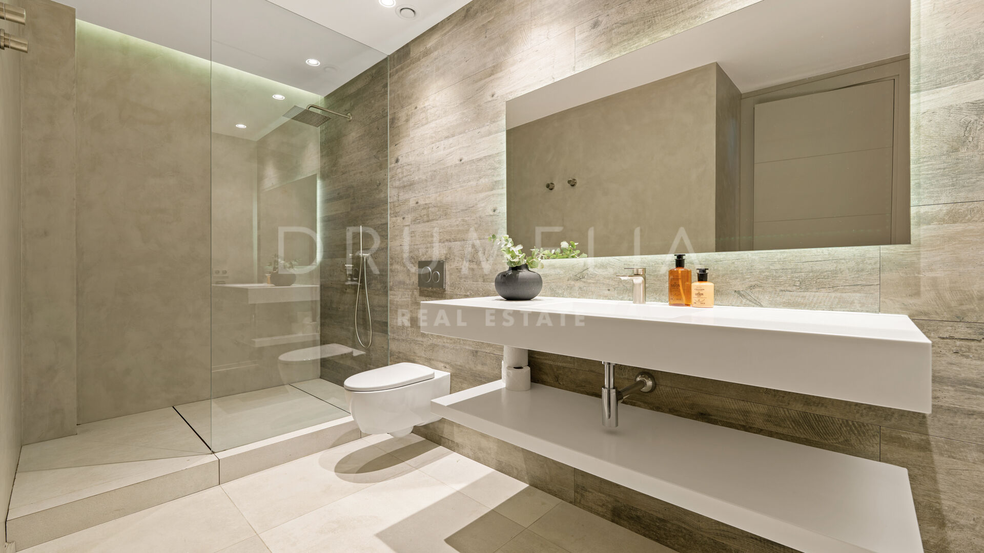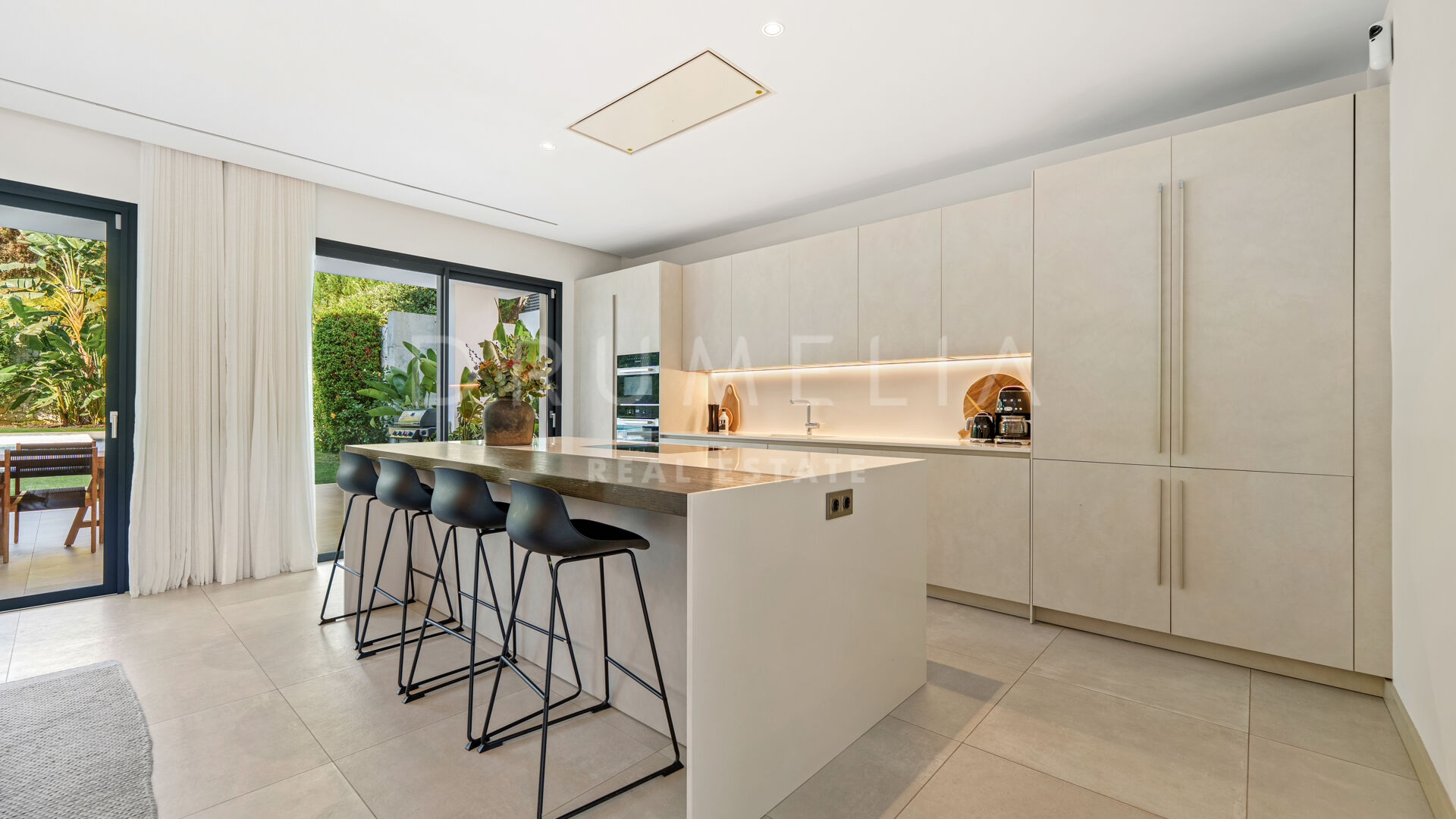 Located in one of Marbella’s most exclusive areas, this modern residence perfectly combines style, comfort, and functionality. The open, bright spaces are connected through large windows that blend the interior with the terraces and the private garden. The spacious and elegant living and dining areas are complemented by a contemporary kitchen, featuring sleek cabinetry and an island ideal for casual dining.
