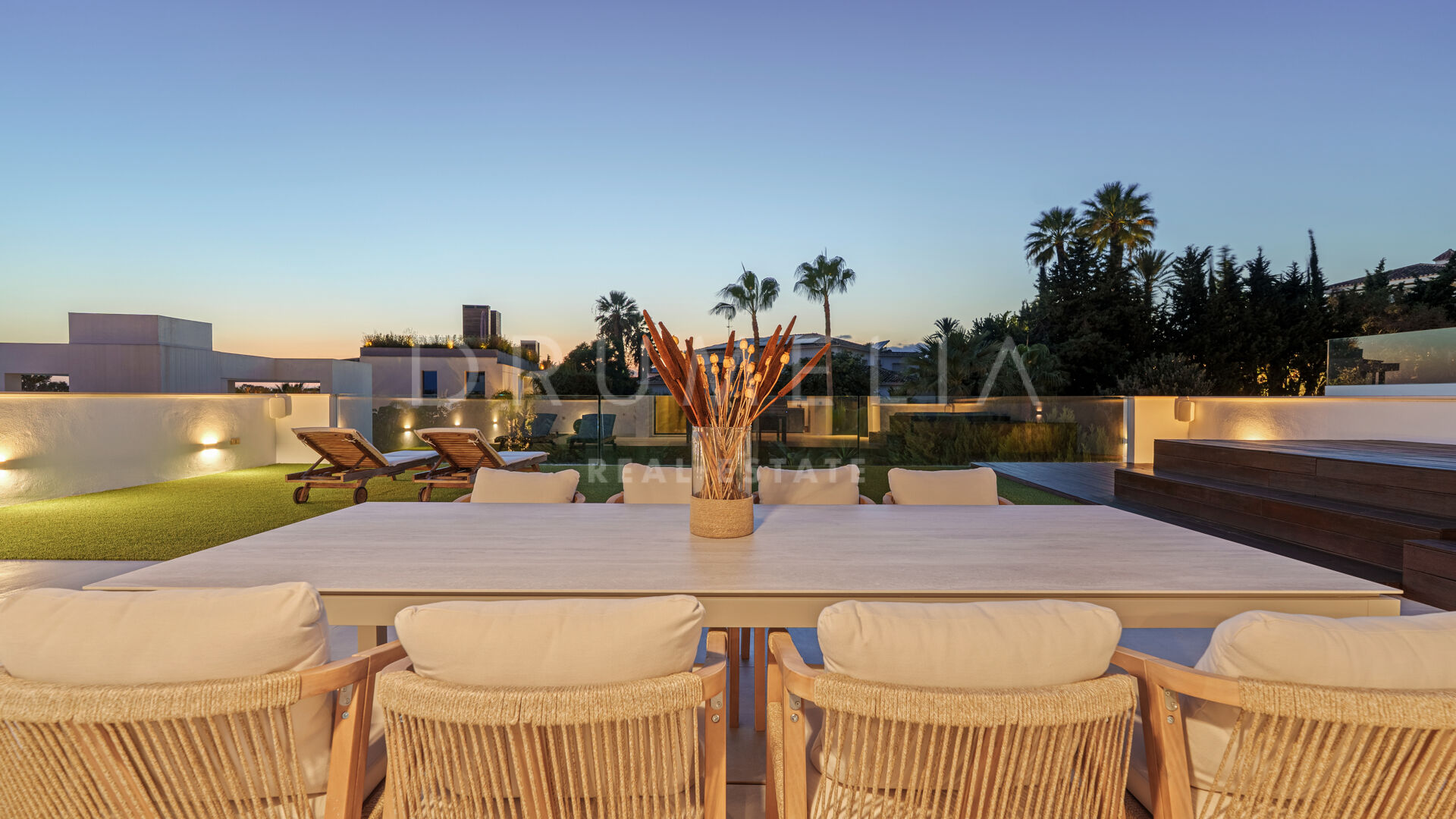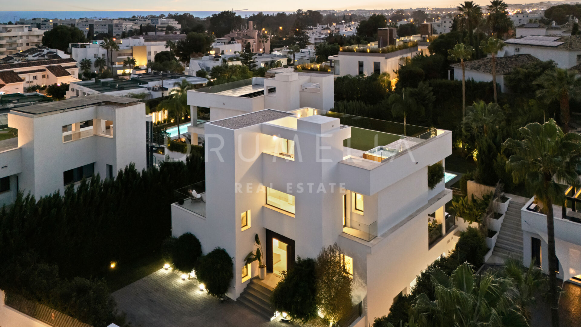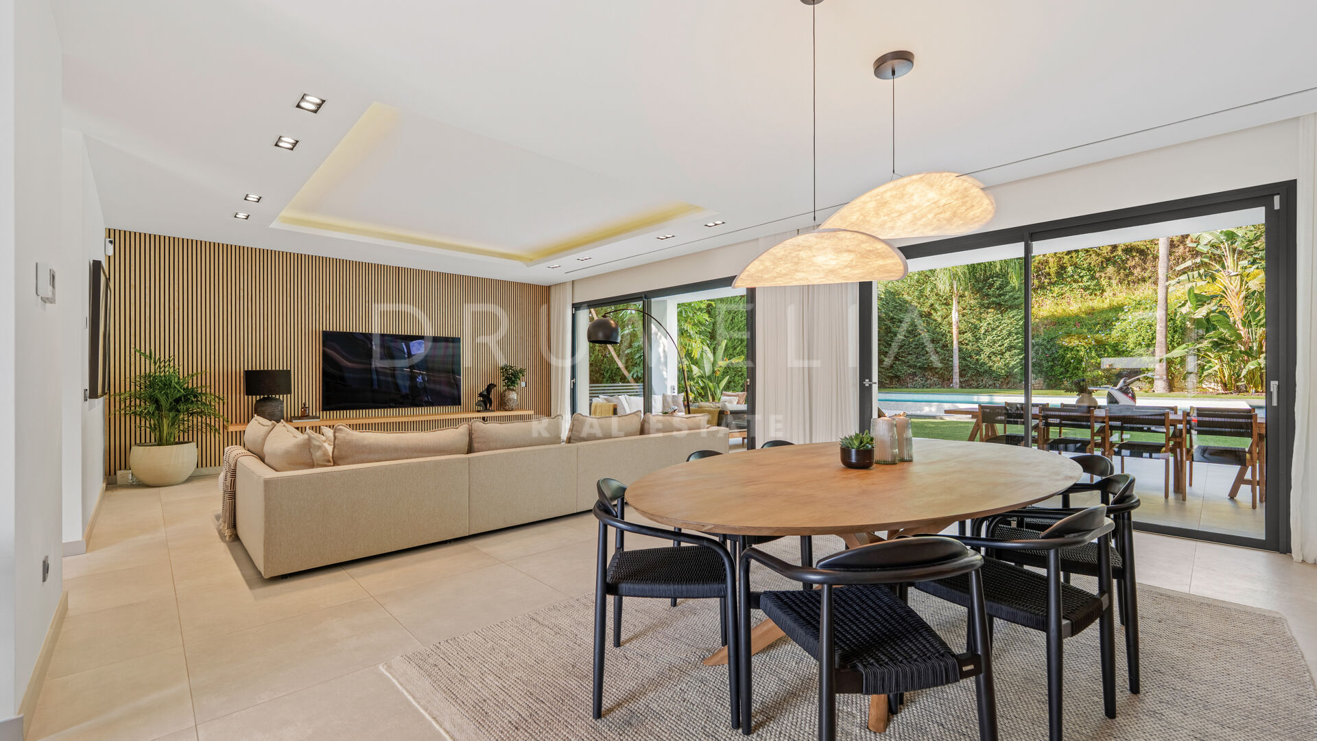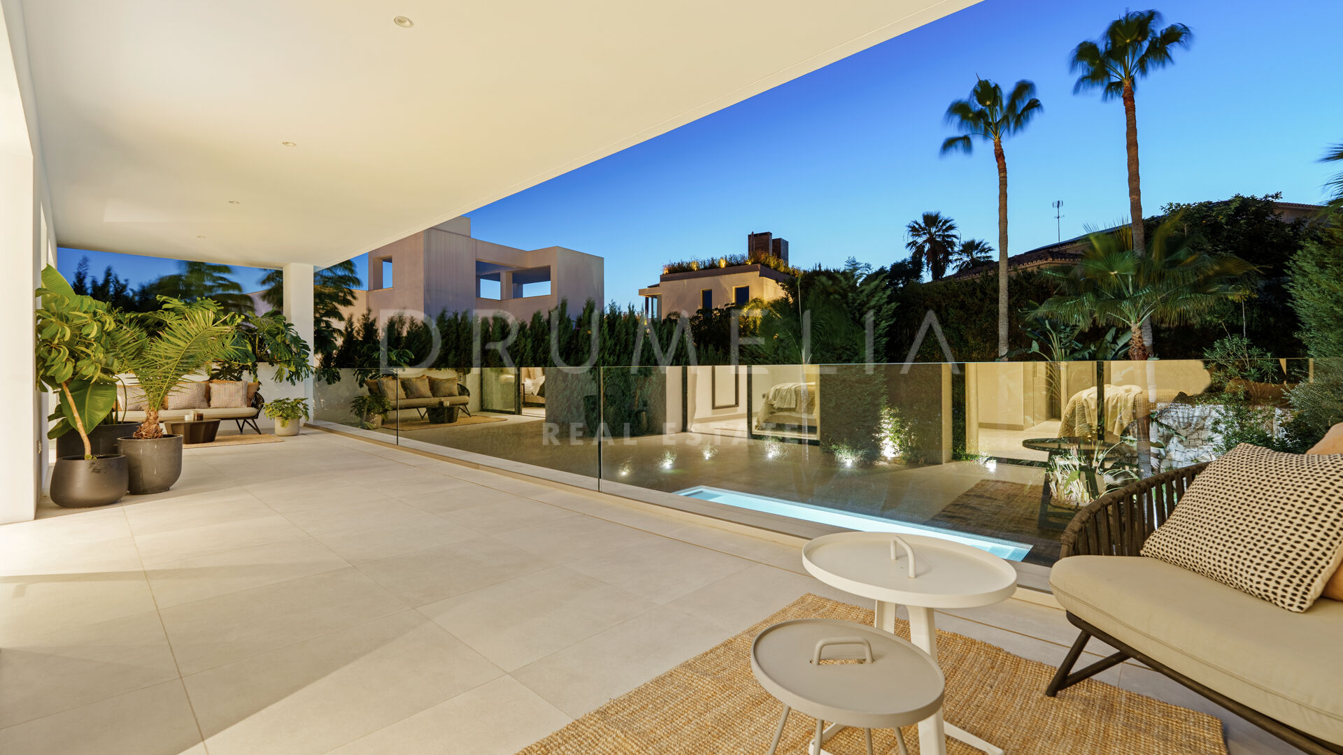 Located in one of Marbella’s most exclusive areas, this modern residence perfectly combines style, comfort, and functionality. The open, bright spaces are connected through large windows that blend the interior with the terraces and the private garden. The spacious and elegant living and dining areas are complemented by a contemporary kitchen, featuring sleek cabinetry and an island ideal for casual dining.