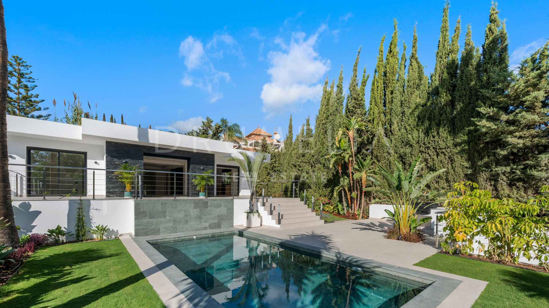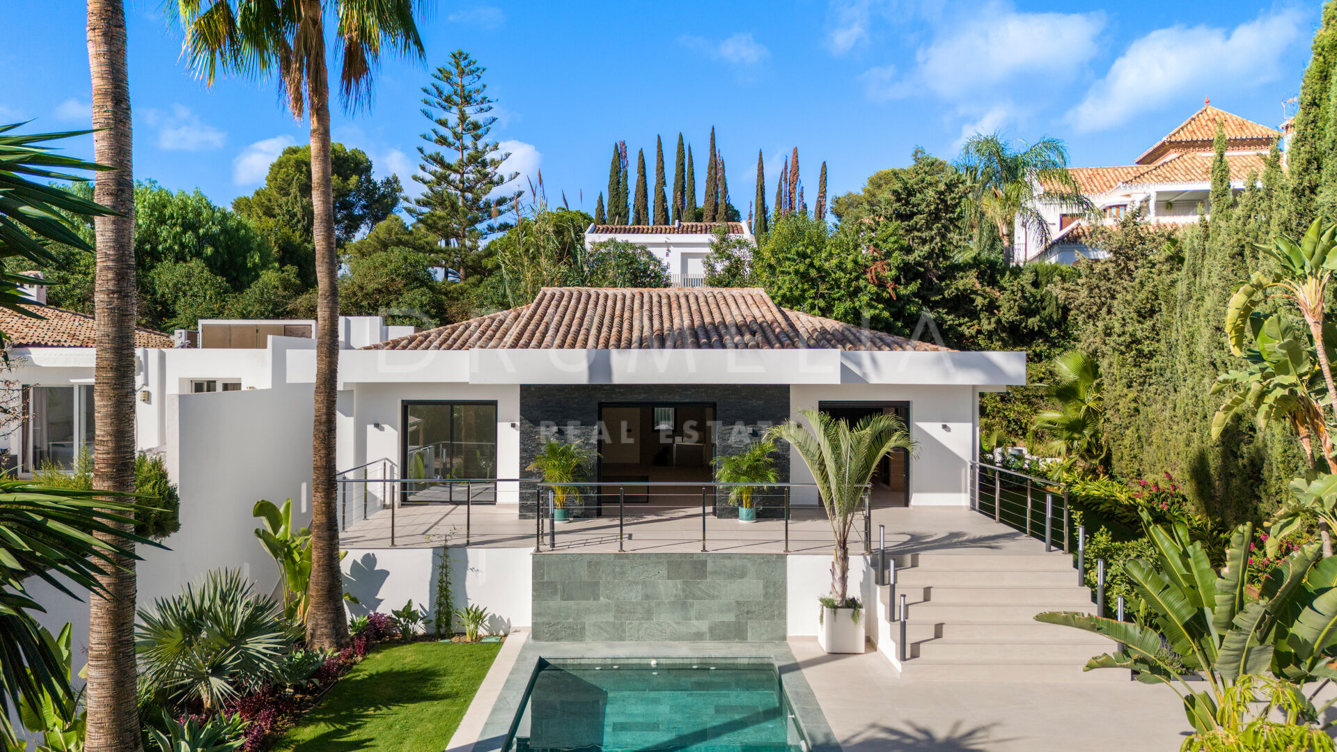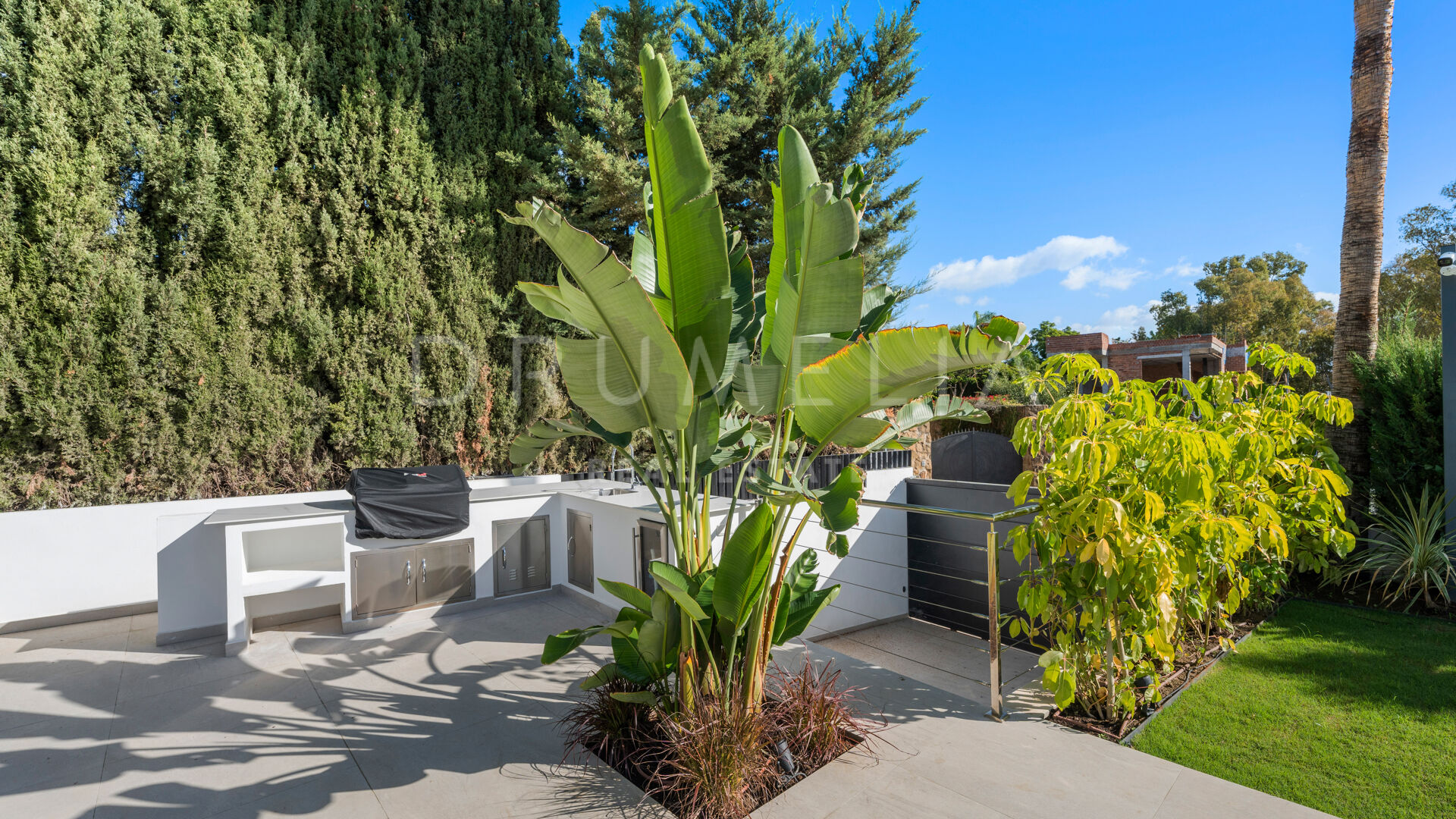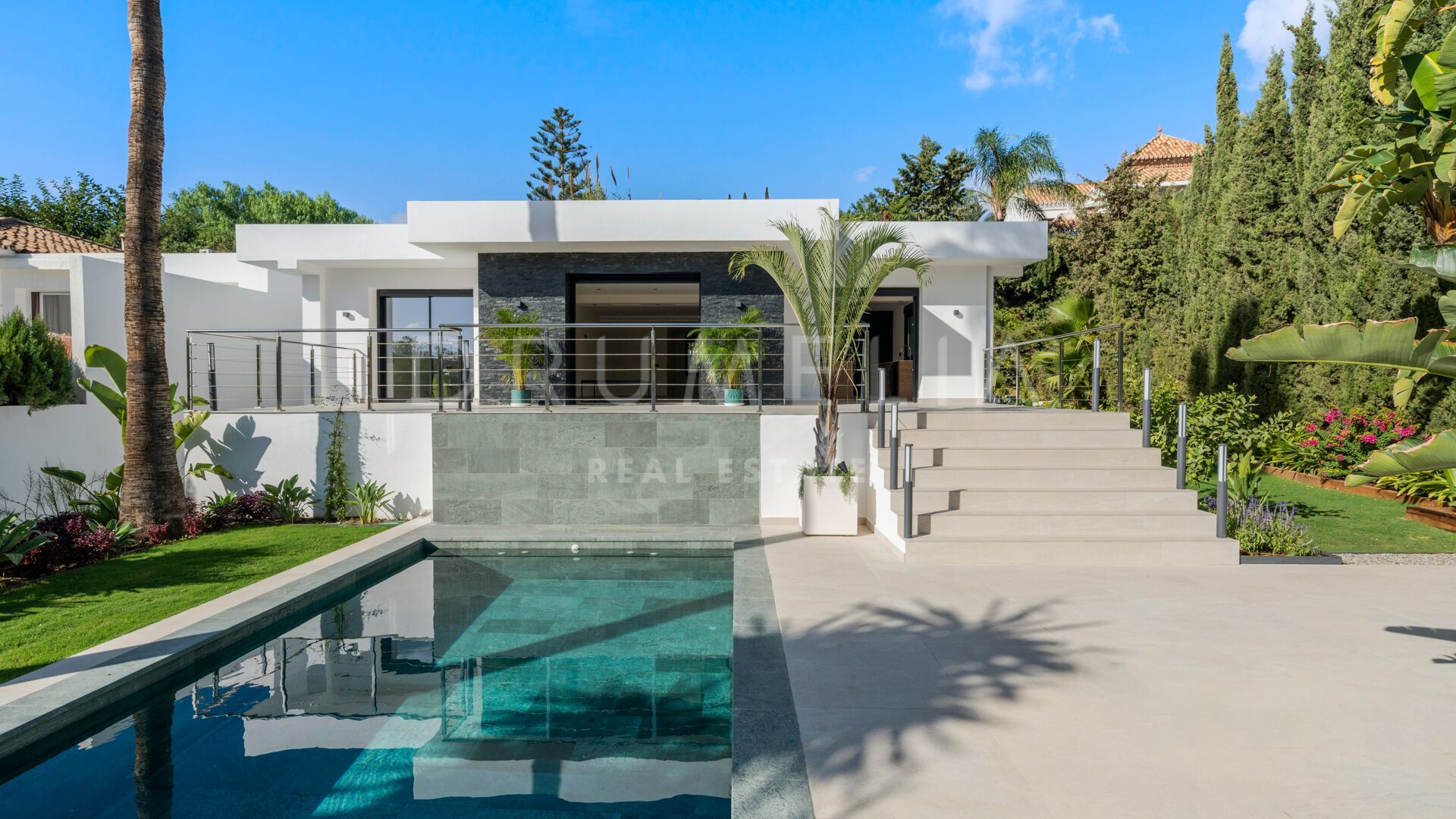 Are you looking for a beautiful modern home in a nice location, close to the beaches, golf courses and all amenities? Then, this totally refurbished 5-bedroom villa for sale in Nueva Atalaya can be your choice. The highly demanded area of the municipality of Estepona is known for its strategic location approximately halfway between Estepona and Marbella. Surrounded by golf courses, Nueva Atalaya is in a triangle of El Paraíso Golf, Real Club de Golf Guadalmina, and Atalaya Golf. Atalaya neighbourhood exudes a tranquil, relaxed atmosphere, with peaceful leafy areas, high-end villas, spacious townhouses and modern apartment complexes. You will live just a few minutes away from the beaches, shopping areas, supermarkets, international schools, clinics, theme parks, tennis clubs, world-famous hotels with the wide variety of services, as well as connection to the A-7 motorway. All attractions, amenities and facilities of the vivid New Golden Mile of Estepona, chic Puerto Banus, San Pedro de Alcantara, Golf Valley of Nueva Andalucia and Benahavis are with an easy reach.