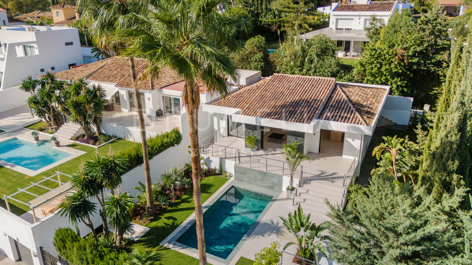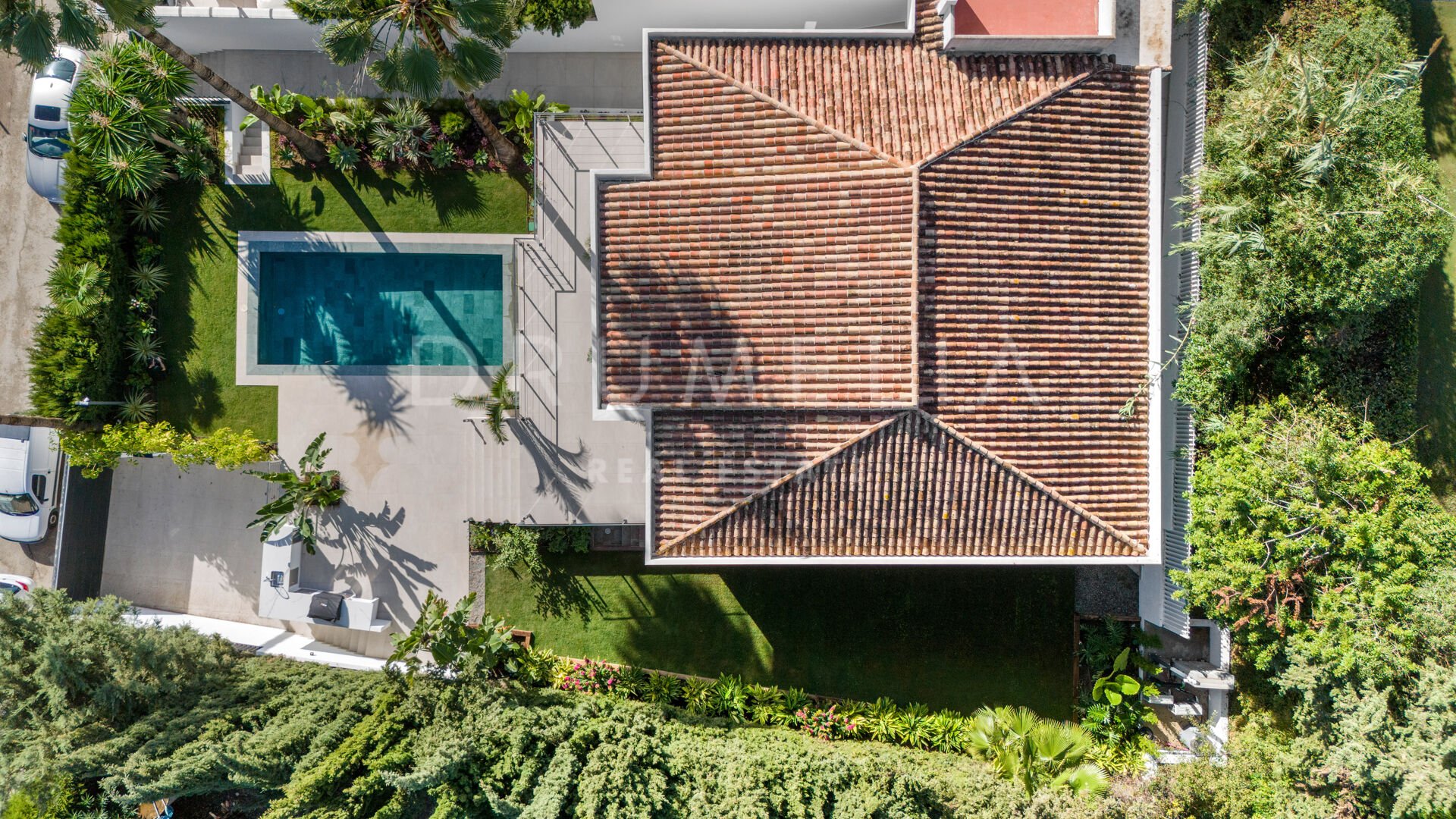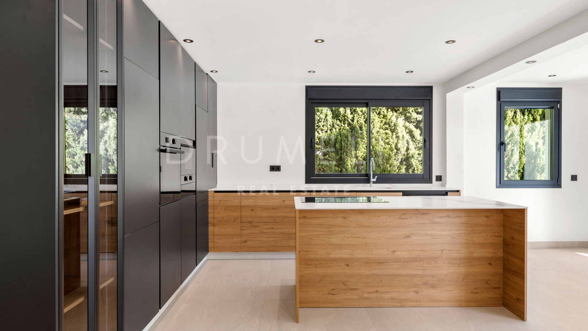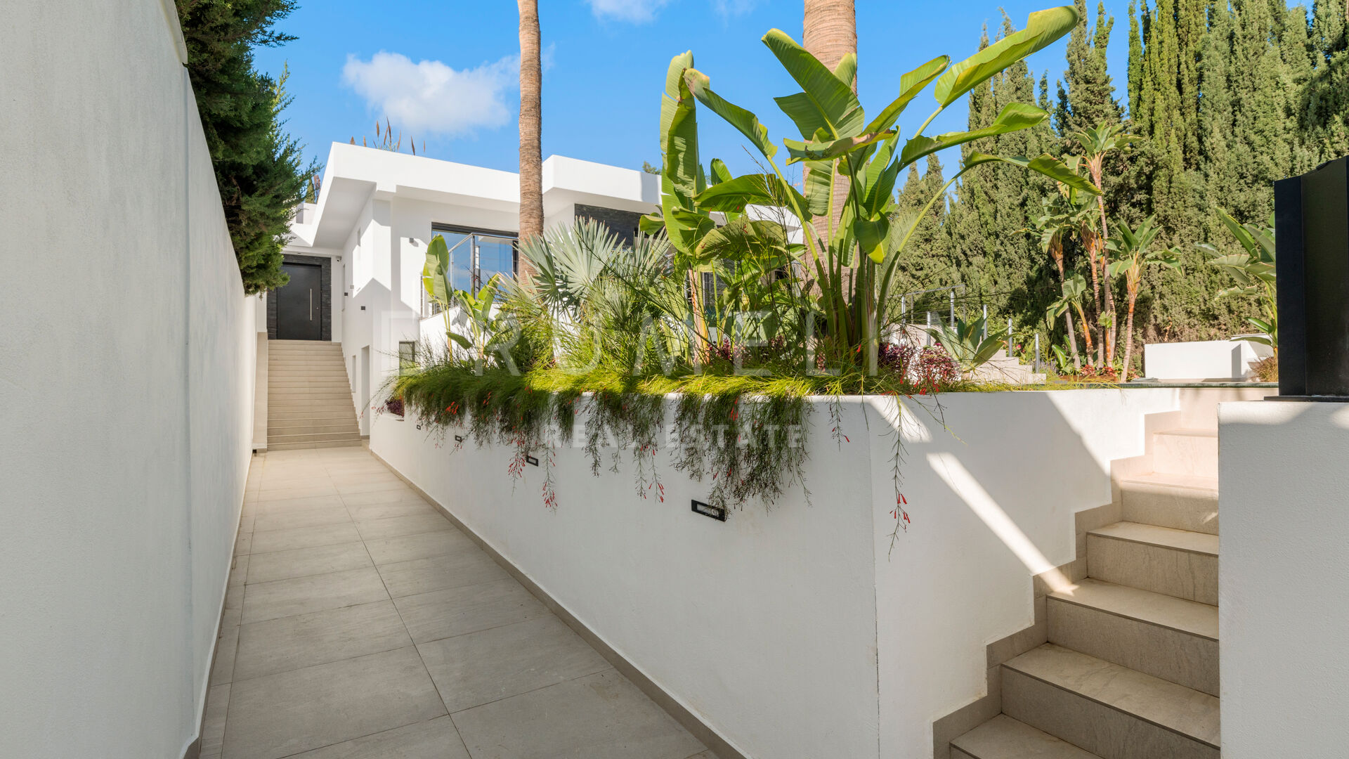 Are you looking for a beautiful modern home in a nice location, close to the beaches, golf courses and all amenities? Then, this totally refurbished 5-bedroom villa for sale in Nueva Atalaya can be your choice. The highly demanded area of the municipality of Estepona is known for its strategic location approximately halfway between Estepona and Marbella. Surrounded by golf courses, Nueva Atalaya is in a triangle of El Paraíso Golf, Real Club de Golf Guadalmina, and Atalaya Golf. Atalaya neighbourhood exudes a tranquil, relaxed atmosphere, with peaceful leafy areas, high-end villas, spacious townhouses and modern apartment complexes. You will live just a few minutes away from the beaches, shopping areas, supermarkets, international schools, clinics, theme parks, tennis clubs, world-famous hotels with the wide variety of services, as well as connection to the A-7 motorway. All attractions, amenities and facilities of the vivid New Golden Mile of Estepona, chic Puerto Banus, San Pedro de Alcantara, Golf Valley of Nueva Andalucia and Benahavis are with an easy reach.