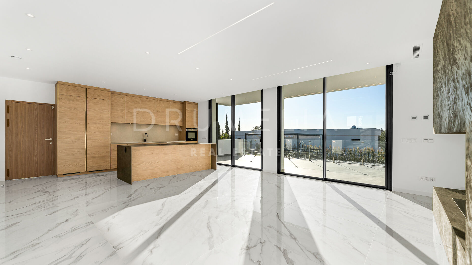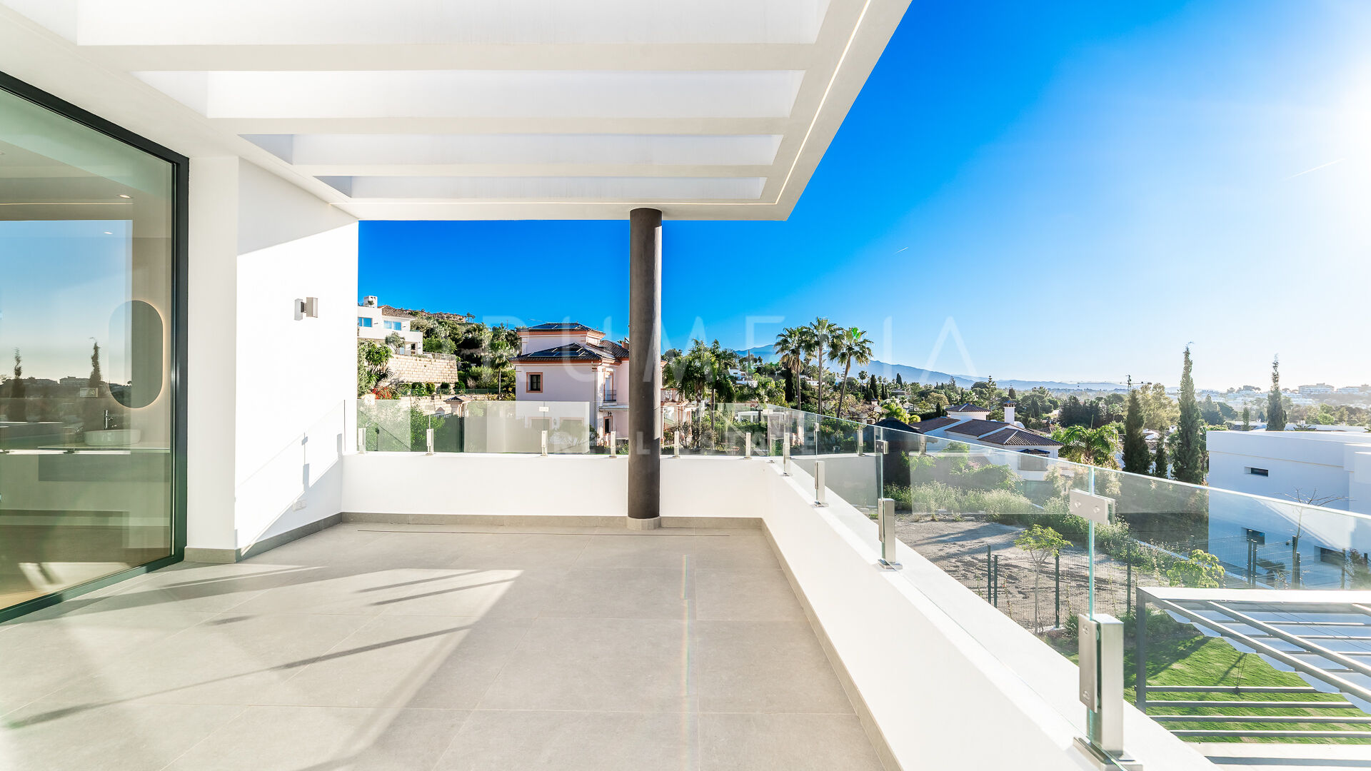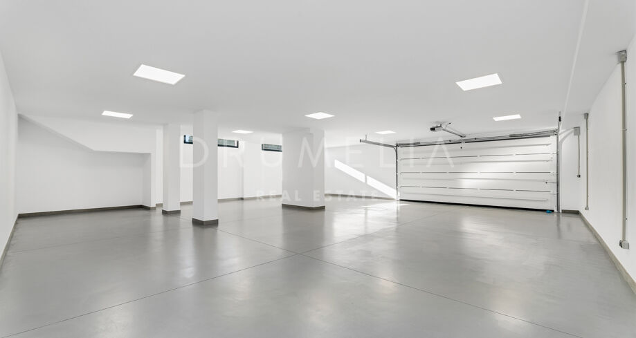 The property sits on a 1,915 m² plot and offers 912 m² of built area plus 125 m² of terraces. Its contemporary architecture is defined by clean lines and an open-plan interior design that enhances natural light and connection with the outdoors. Large windows frame open views of the Mediterranean Sea and the surrounding mountains, seamlessly integrating the landscape into the living spaces. The villa features six bedrooms, five of them en suite, seven bathrooms, a double-height living room with a bio-ethanol fireplace, a dining area, an open-plan kitchen, a study, and a private garage for three vehicles.