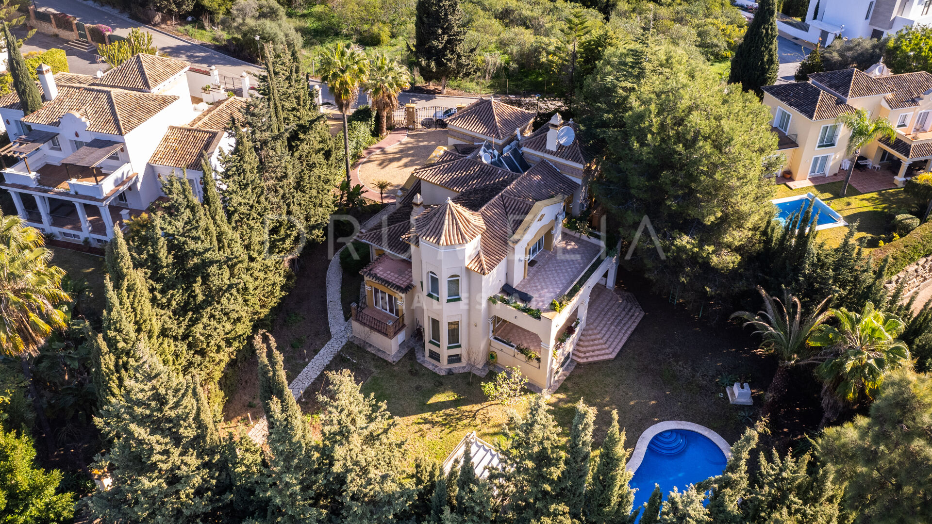 Surrounded by lush greenery and similar luxurious properties of Benahavis and Estepona areas, the fabulous villa of 612 m² is nestled on a large plot of 1.737 m². The authentic Mediterranean-style house is in full harmony with its environment. It boasts a timeless elegant design, comforts and natural materials (marble, wood, stone). The luxury property needs some renovation and love to become your own slice of Paradise and ideal Mediterranean retreat. The home offers open and bright spaces for exclusive Mediterranean lifestyle with a blend of indoor and outdoor living. It features a wide driveway, a double height entrance hall, spacious living and dining areas, a fully fitted kitchen, 4 bedrooms with fitted wardrobes, 3 bathrooms (showers, bathtubs, Jacuzzi), a private garage, swimming pool and mature landscaped gardens.