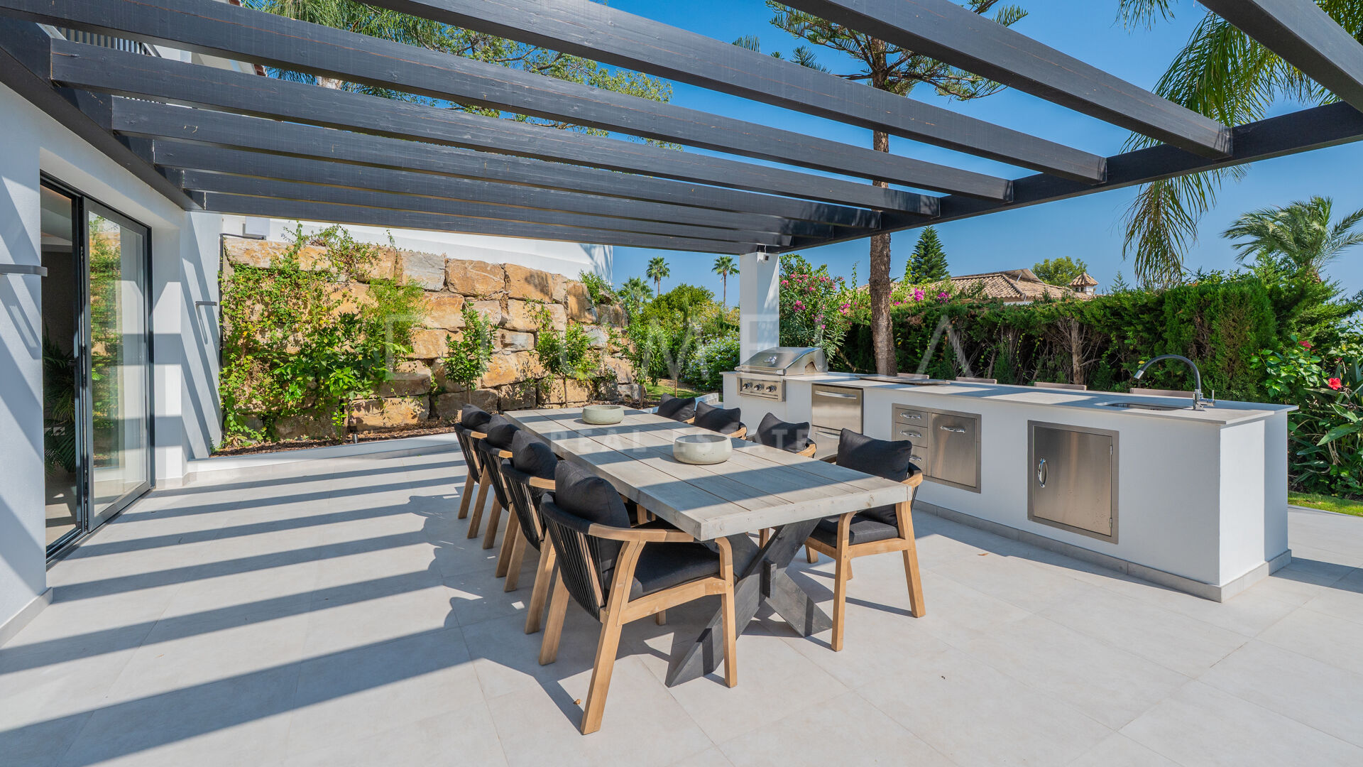 Outdoor spaces are designed for both relaxation and entertaining. They include a swimming pool, a pergola with an outdoor kitchen and barbecue, and a dedicated chill-out area. Solar panels and underfloor heating provide year-round comfort and improved energy efficiency.