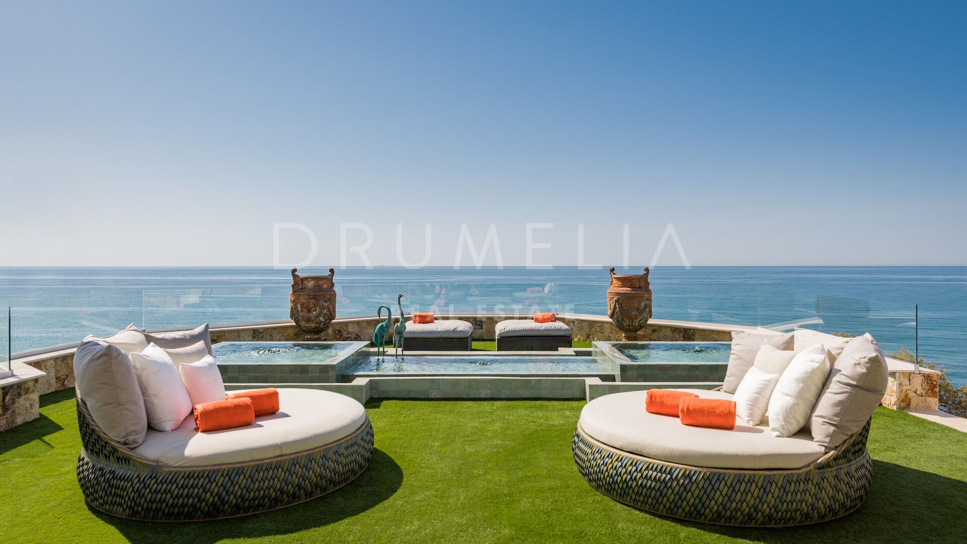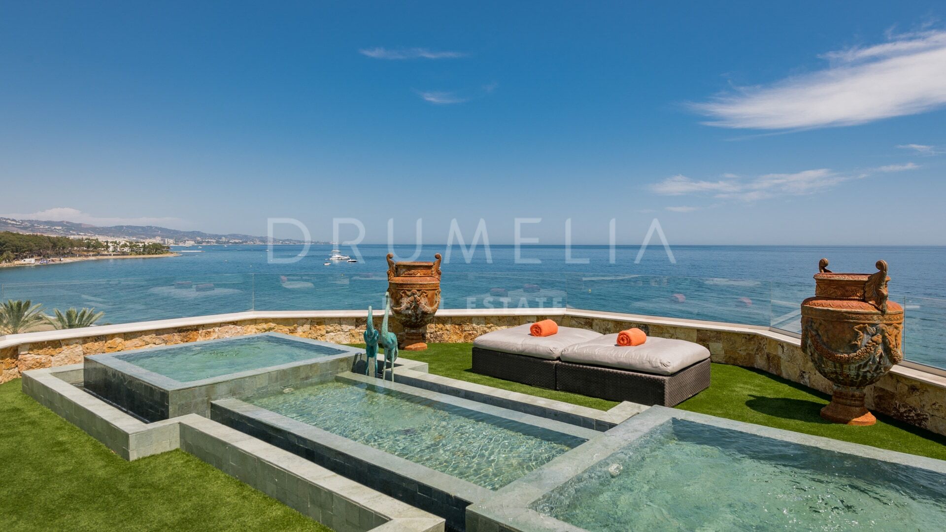 Outdoor living is just as impressive. The upper level hosts two heated pools/jacuzzis, surrounded by landscaped gardens and offering panoramic sea views—a serene setting for unwinding or entertaining in style.