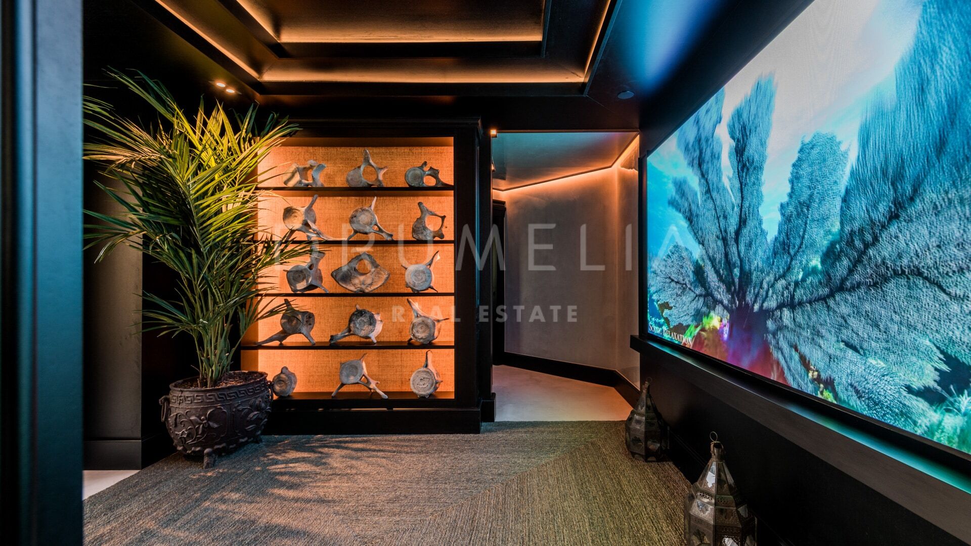 The kitchen is sleek and contemporary, fitted with premium appliances and complemented by a separate laundry room. For moments of relaxation, a private cinema room adds a touch of comfort and entertainment to the home.