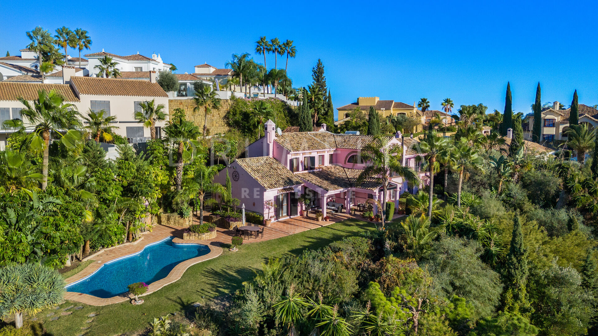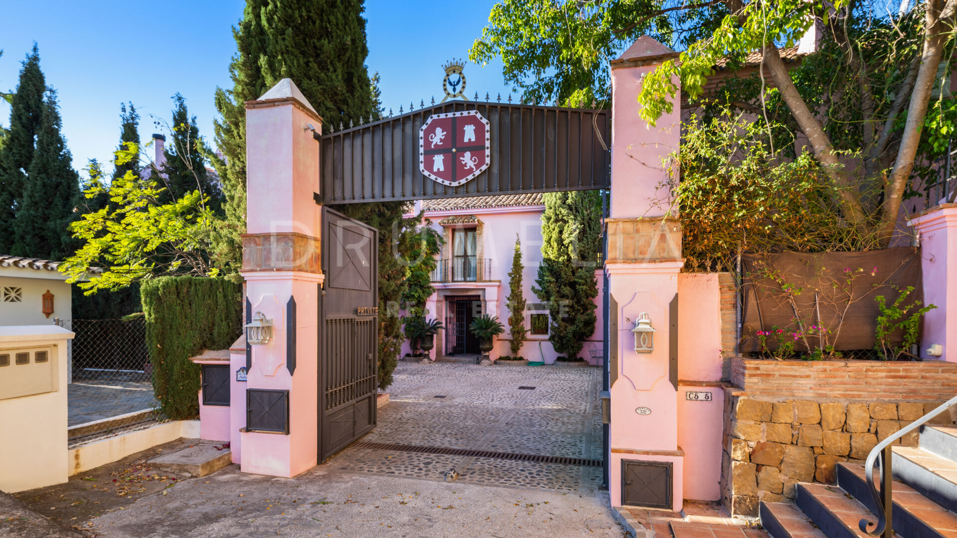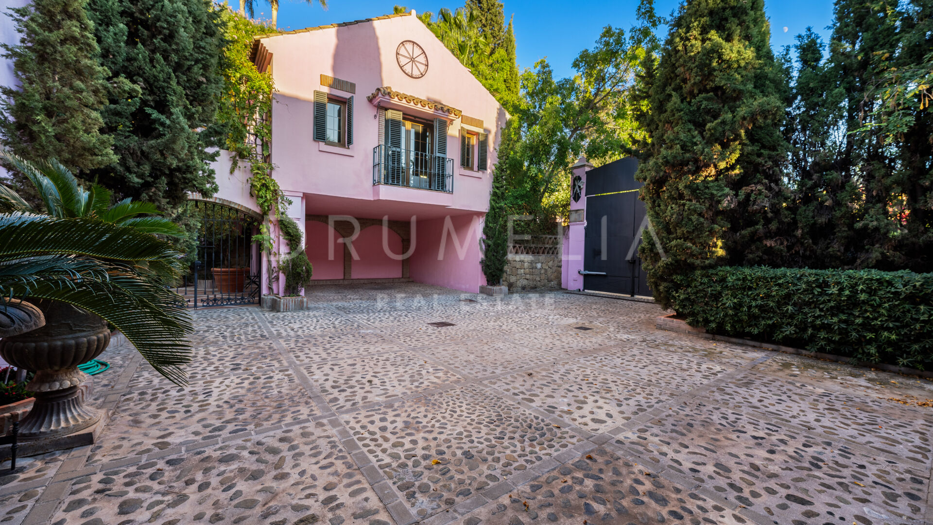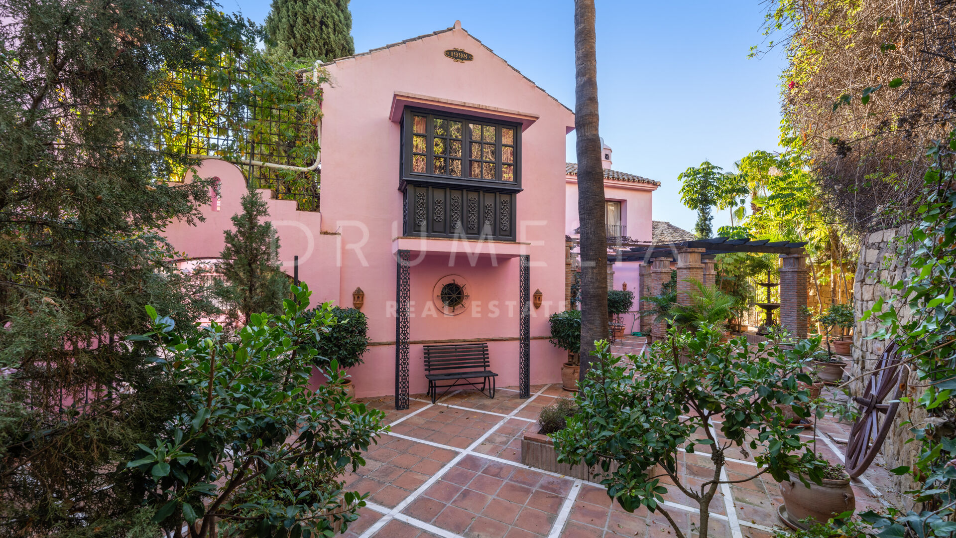 You enter the grounds through impressive gates into a courtyard with ample parking for 4 cars. The villa is distributed over 2 floors with a double height entrance hall and spacious rooms offering plenty of natural light throughout the house. The fireplaces create a warm and inviting atmosphere. The rooms open onto the pretty terraces, a manicured subtropical garden with a private pool and a barbecue area, and a wonderful courtyard with a fountain. Plenty of outside spaces invite to relax and bask in the sunshine, which this south/west-facing villa benefits from. The lower floor offers both formal and informal lounges, a dining room connected to a fully fitted kitchen, perfect for entertaining, and a Guest Suite. 3 bedroom suites can be found on the upper floor, a large Master Suite with a spacious bathroom, and 2 guest bedrooms both with en-suite bathrooms. The bedrooms open on to lovely balconies, and the guest bedrooms can be accessed without entering the villa. In addition to reception areas this wonderful home also has a library, which could be the 6th bedroom, utility, laundry and storage rooms, and a separate studio apartment.