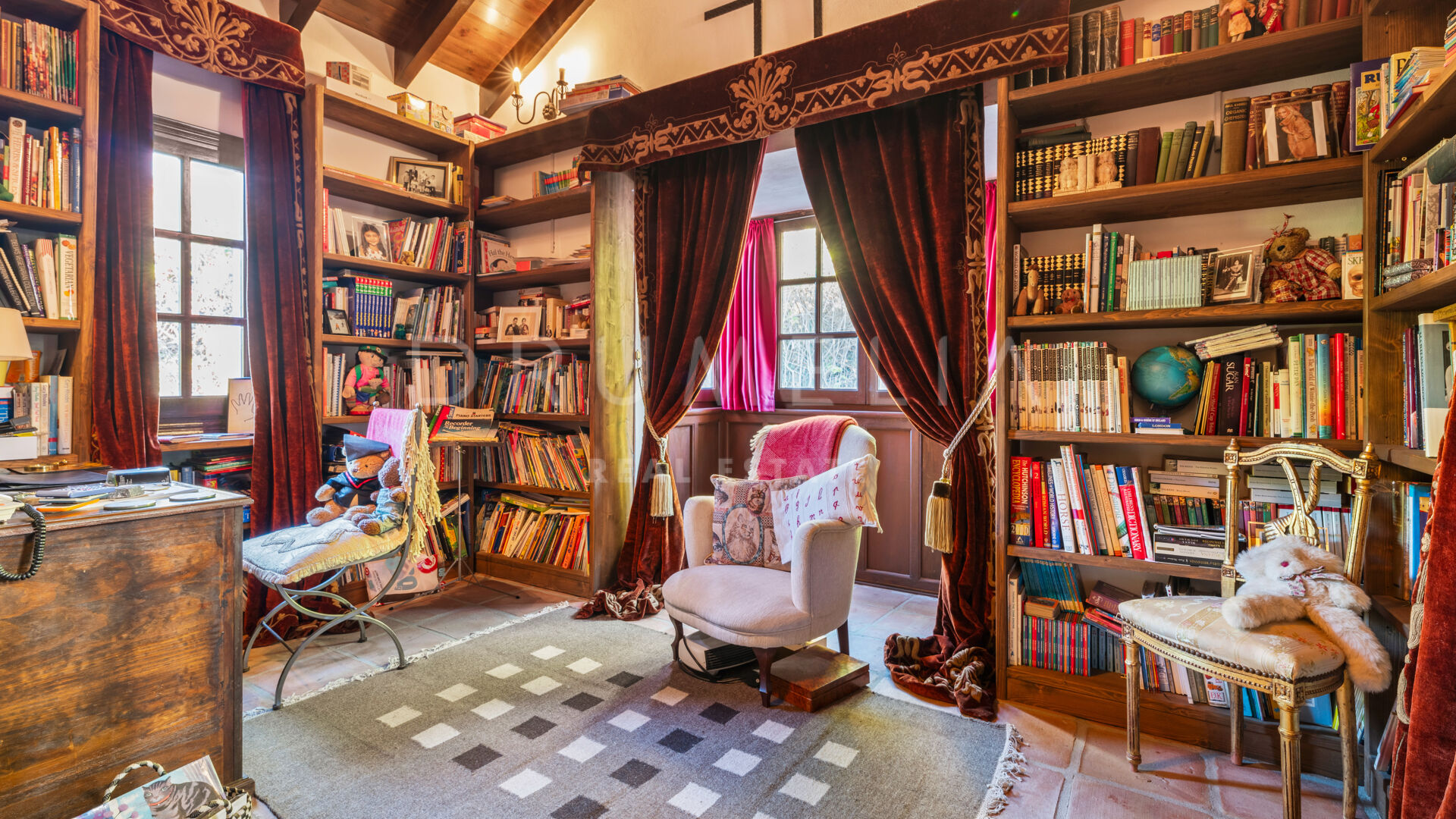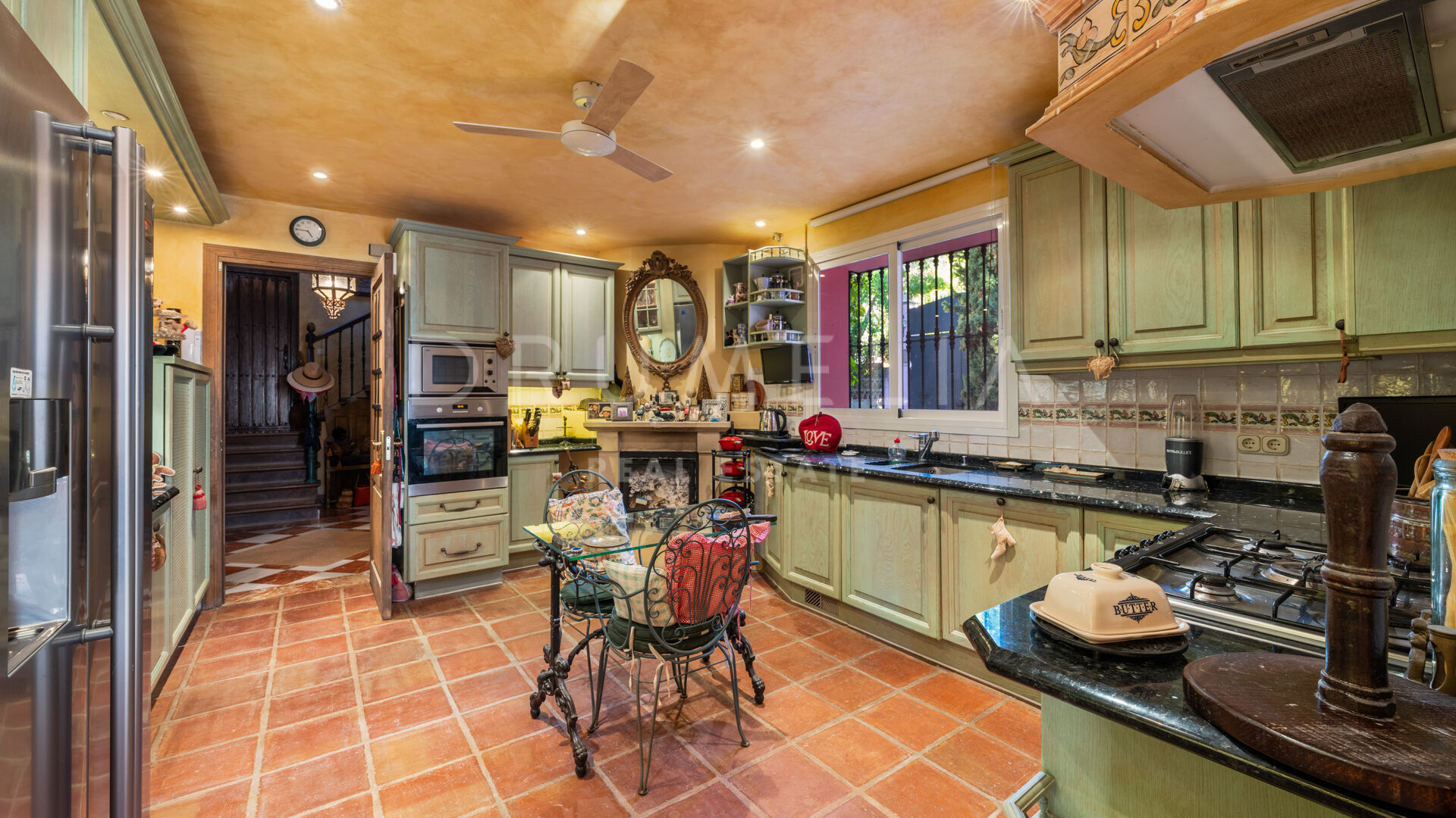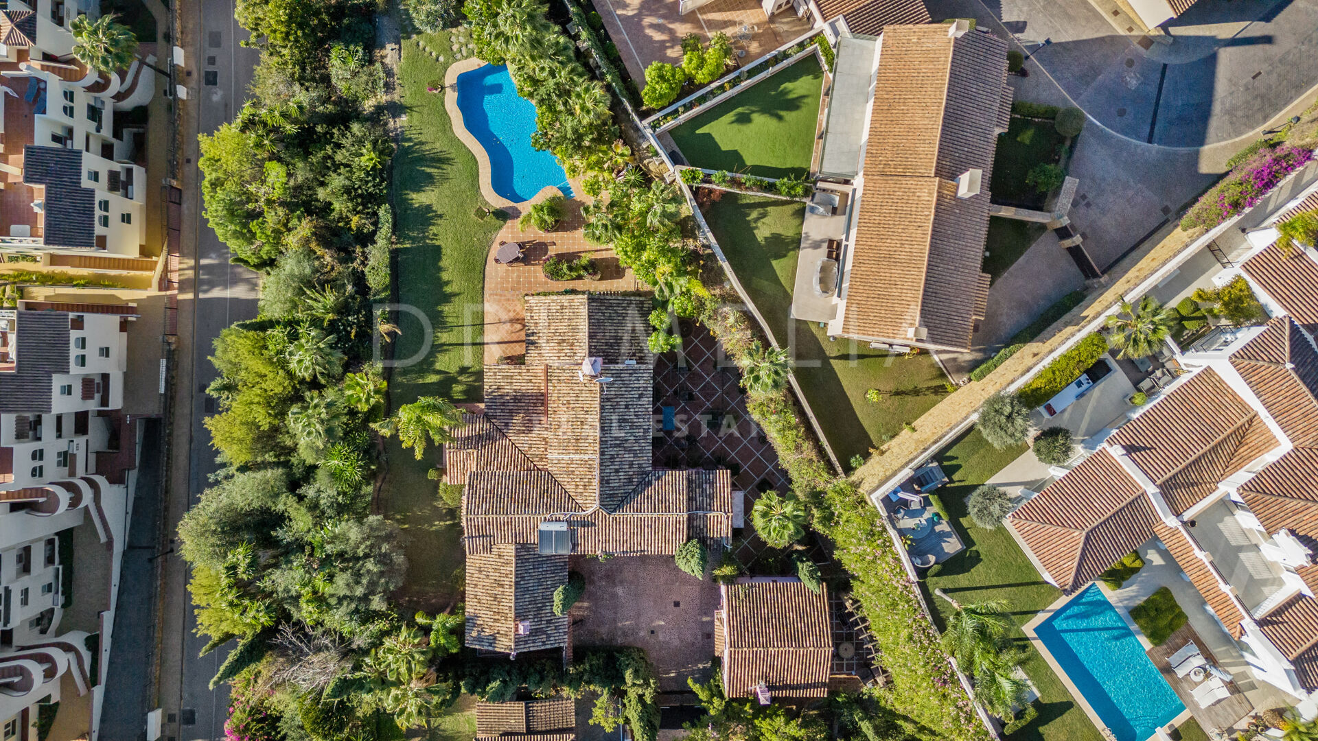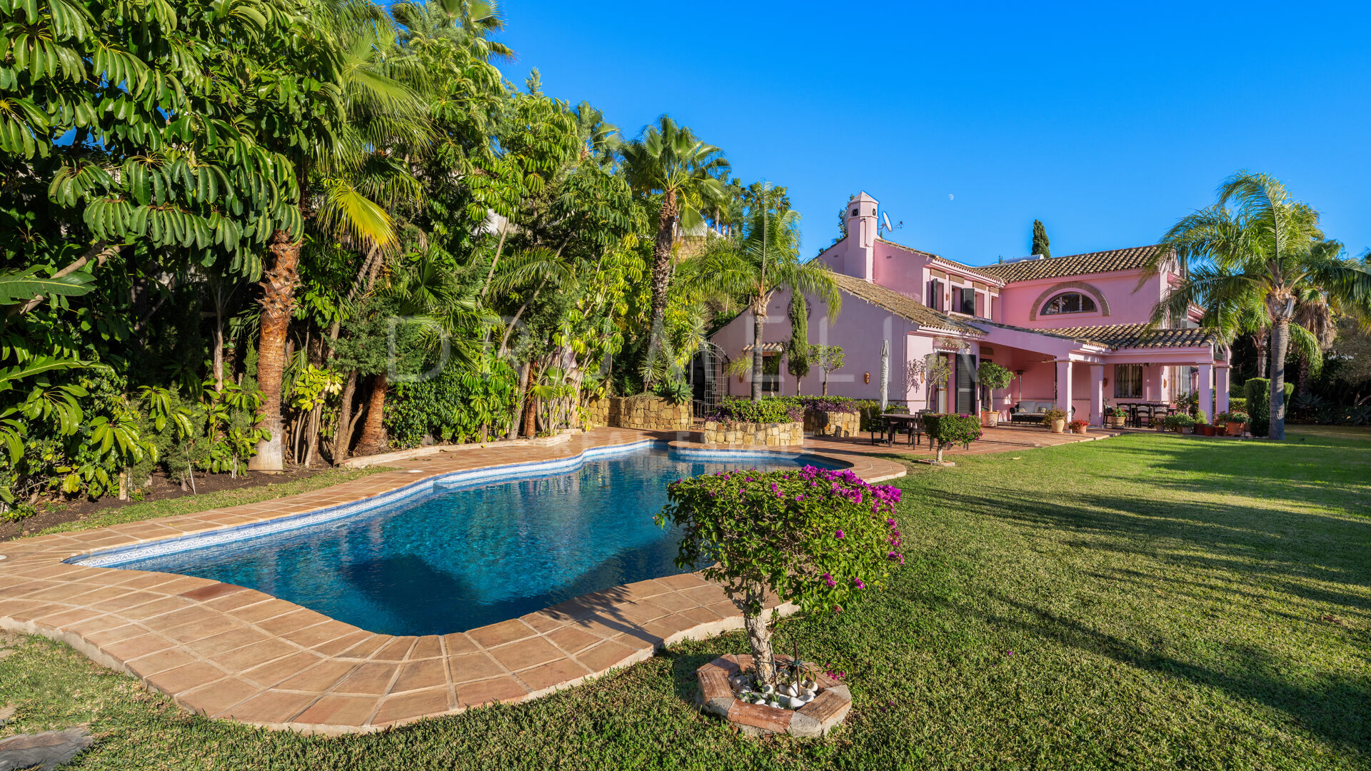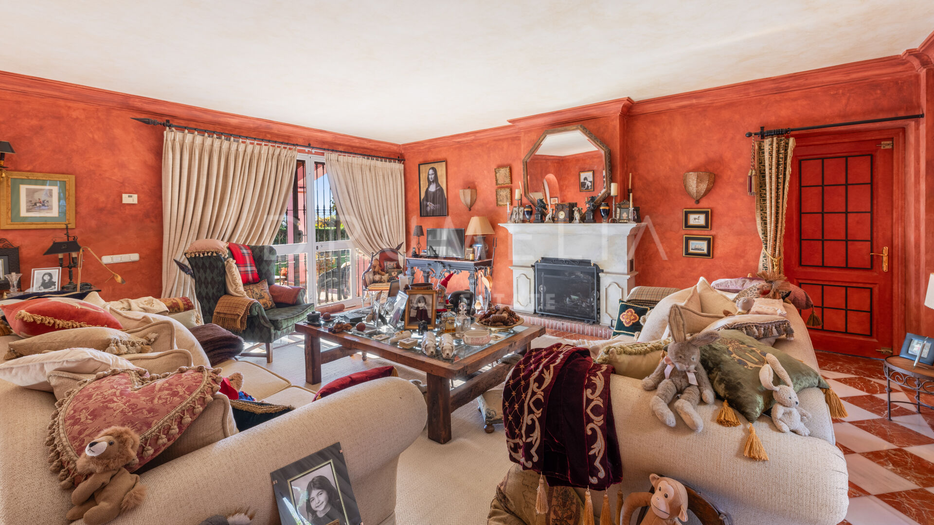 You enter the grounds through impressive gates into a courtyard with ample parking for 4 cars. The villa is distributed over 2 floors with a double height entrance hall and spacious rooms offering plenty of natural light throughout the house. The fireplaces create a warm and inviting atmosphere. The rooms open onto the pretty terraces, a manicured subtropical garden with a private pool and a barbecue area, and a wonderful courtyard with a fountain. Plenty of outside spaces invite to relax and bask in the sunshine, which this south/west-facing villa benefits from. The lower floor offers both formal and informal lounges, a dining room connected to a fully fitted kitchen, perfect for entertaining, and a Guest Suite. 3 bedroom suites can be found on the upper floor, a large Master Suite with a spacious bathroom, and 2 guest bedrooms both with en-suite bathrooms. The bedrooms open on to lovely balconies, and the guest bedrooms can be accessed without entering the villa. In addition to reception areas this wonderful home also has a library, which could be the 6th bedroom, utility, laundry and storage rooms, and a separate studio apartment.
