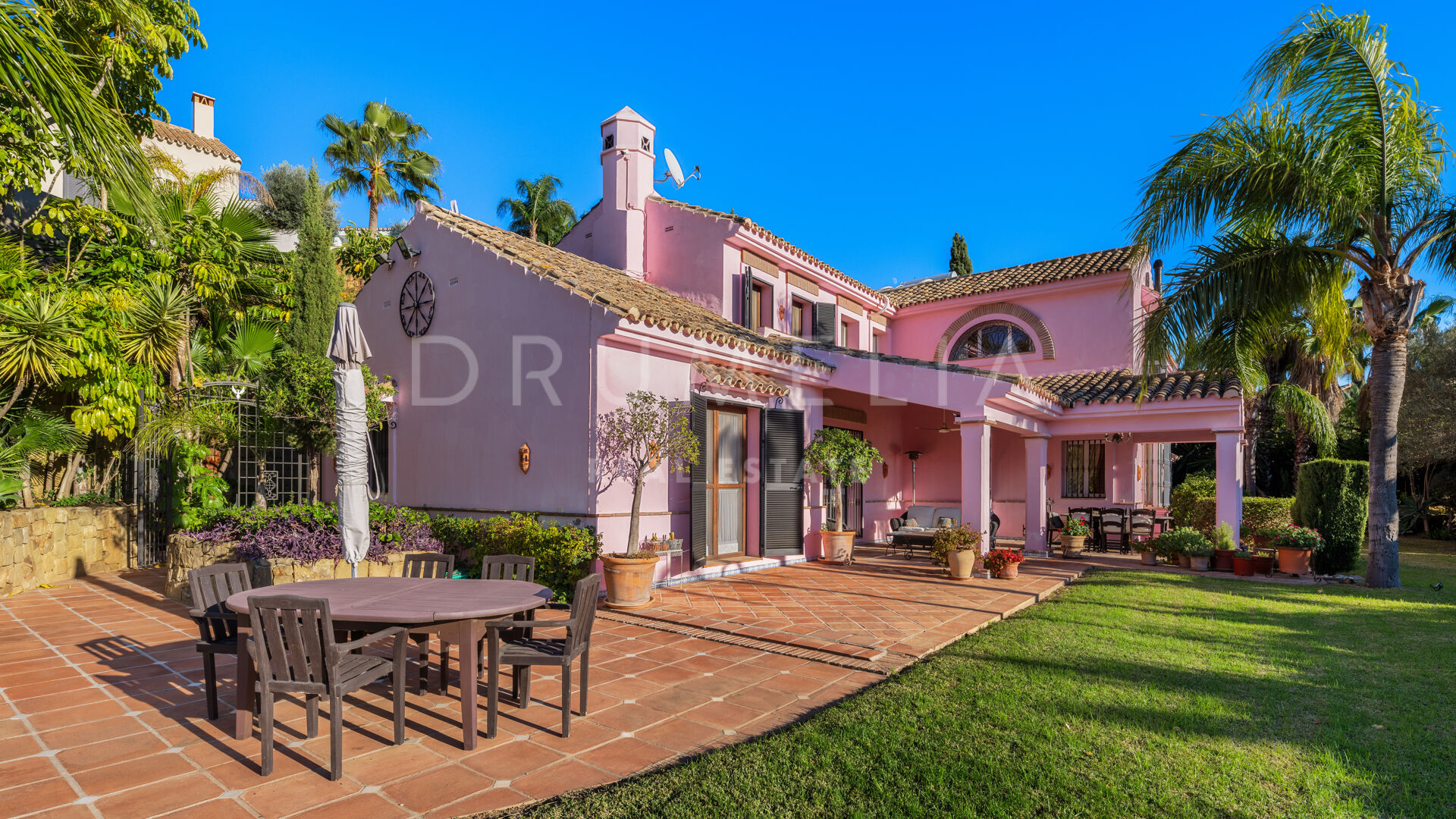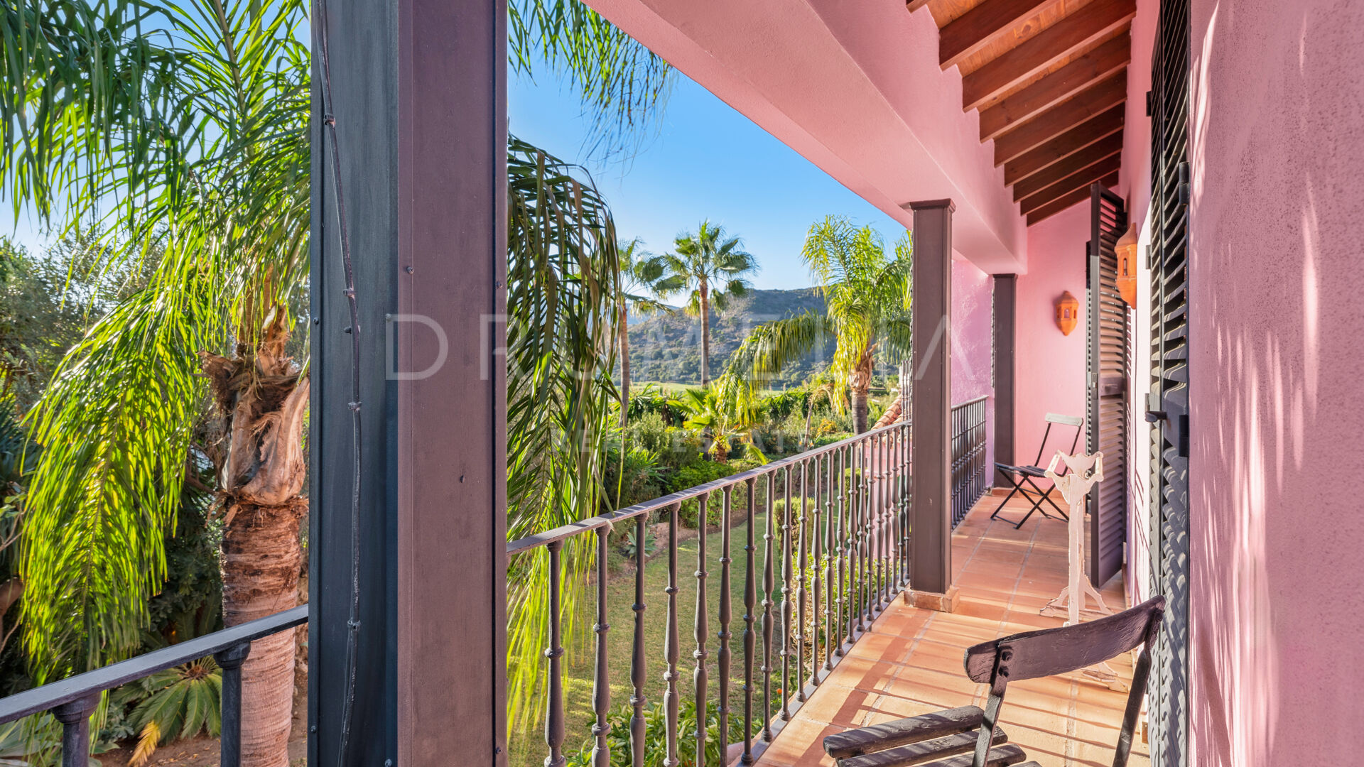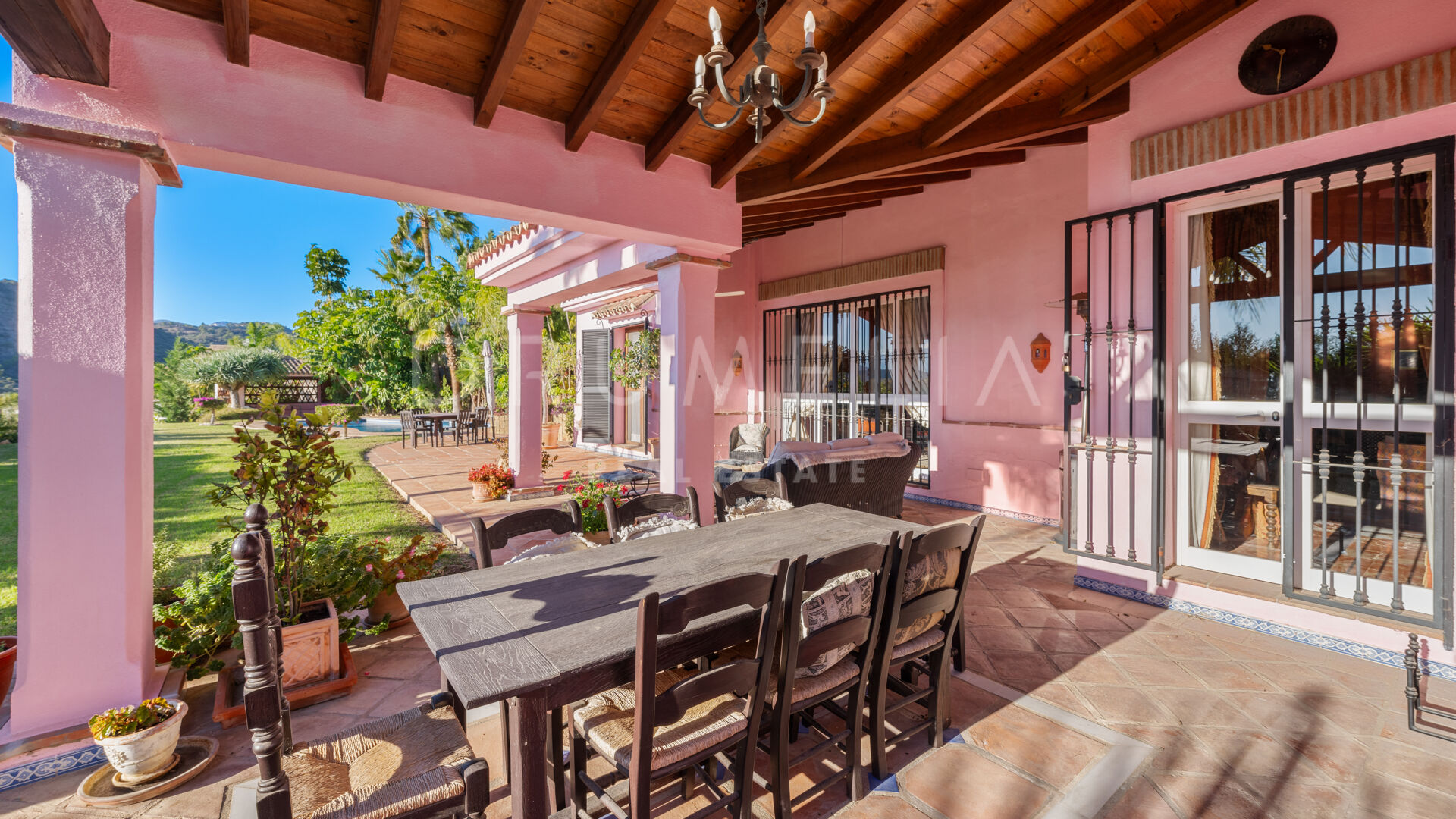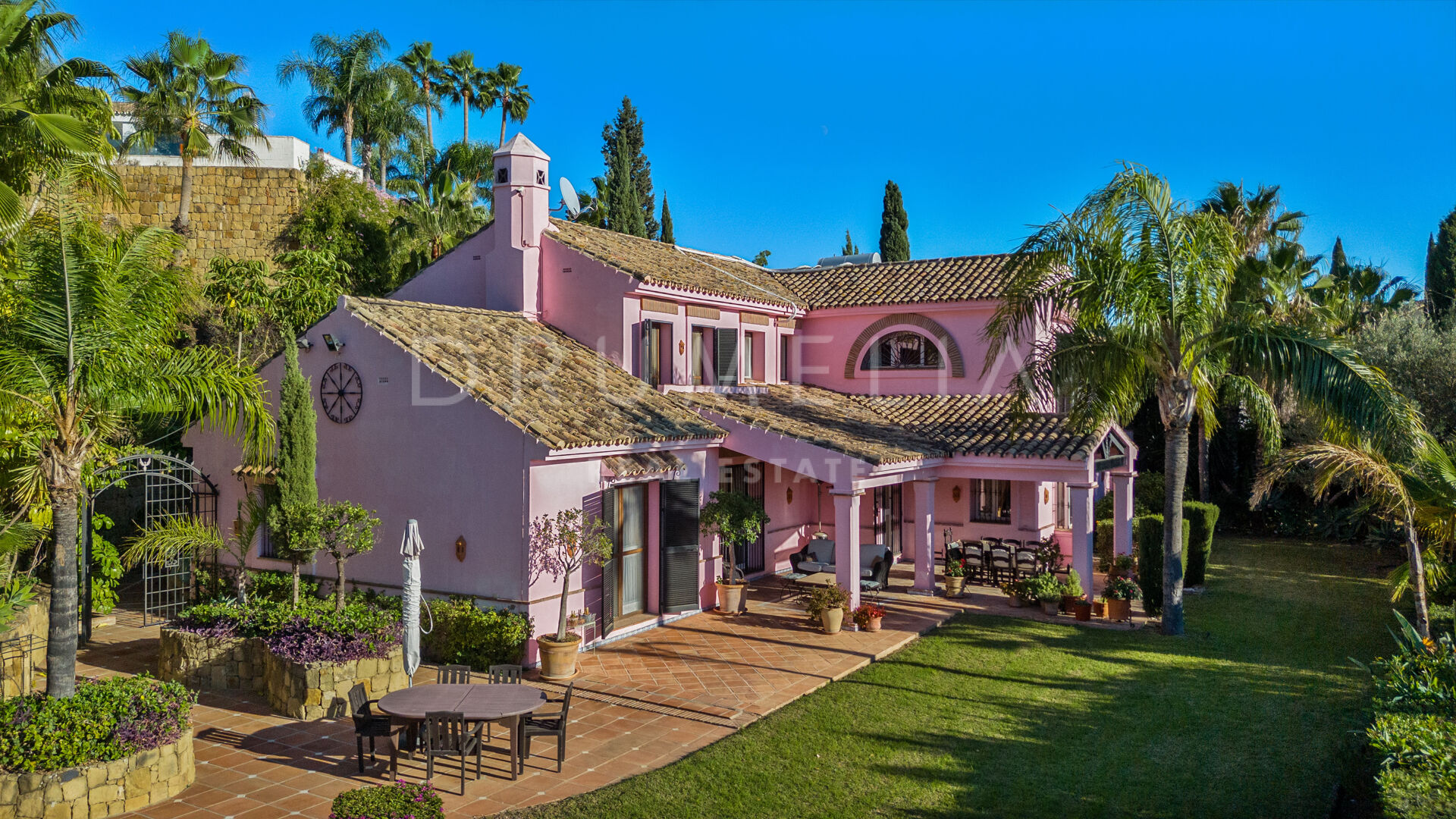 A charming, Andalusian-style 5-bedroom house is offered for sale in a well-established and much sought-after gated community situated in the heart of the municipal area Benahavís. It is located in a cul-de-sac within the Puerto del Almendro, a very private but also central Benahavis urbanisation made up of both apartments and villas. This is a truly enviable location for living, close to the coast but in the heart of the countryside, surrounded by wonderful nature and overlooking beautiful scenery and the sea. The lack of passing traffic ensures peace and tranquillity. Bordered by Los Arqueros Golf and Country Club, the development lies east of the picturesque Ronda road that has inspired poets and artists. 70% of the municipality has been declared ‘Environmentally Significant’. Another advantage of the area is its microclimate provided by the Serrania de Ronda and Sierra de las Nieves, a UNESCO Biosphere Reserve.