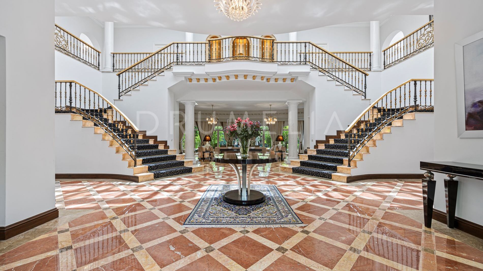 The entrance makes an unforgettable impression, framed by majestic Doric columns and ivy-draped façades that exude cinematic charm. Inside, a soaring double-height hall with sweeping staircases and marble floors sets a tone that is both majestic and inviting.