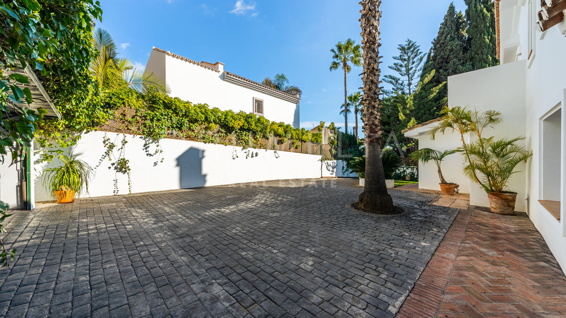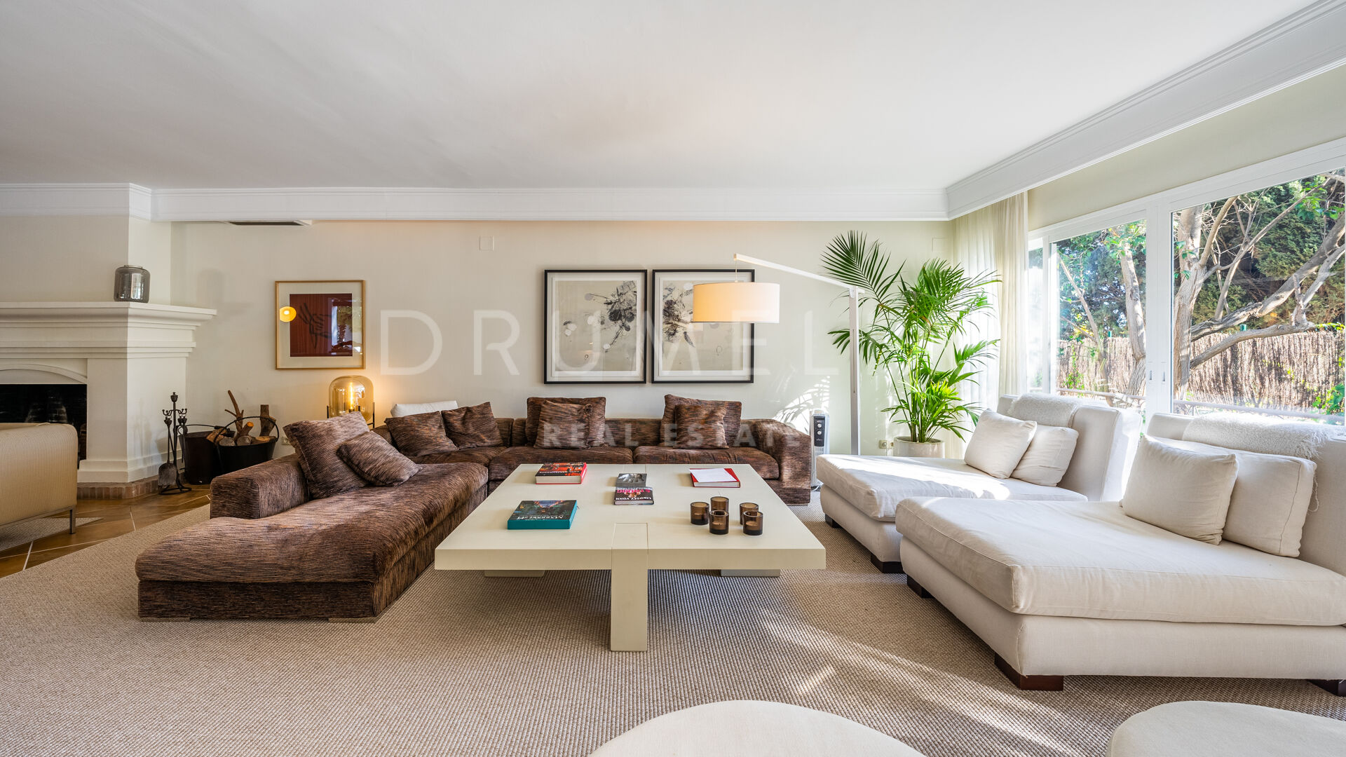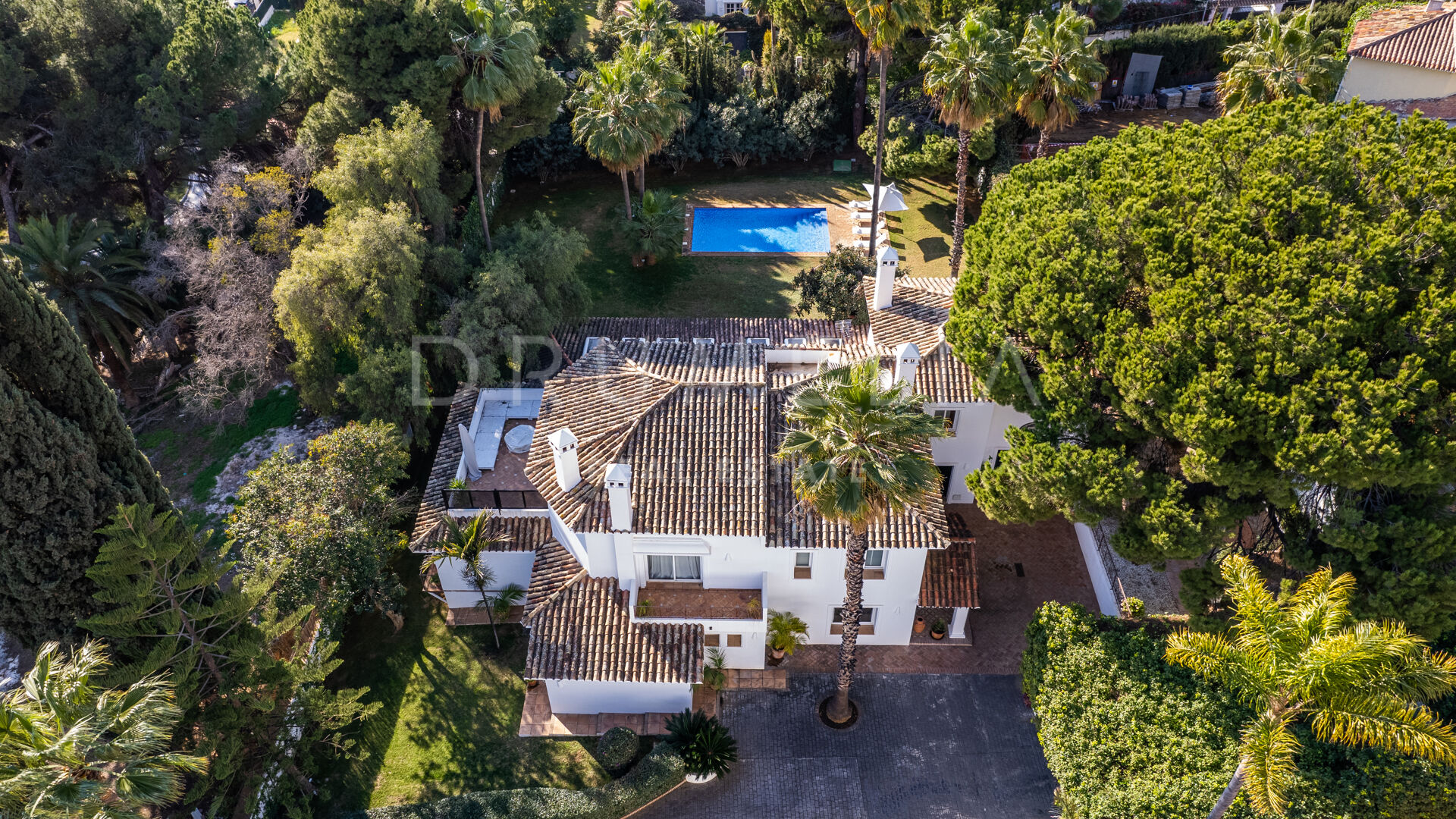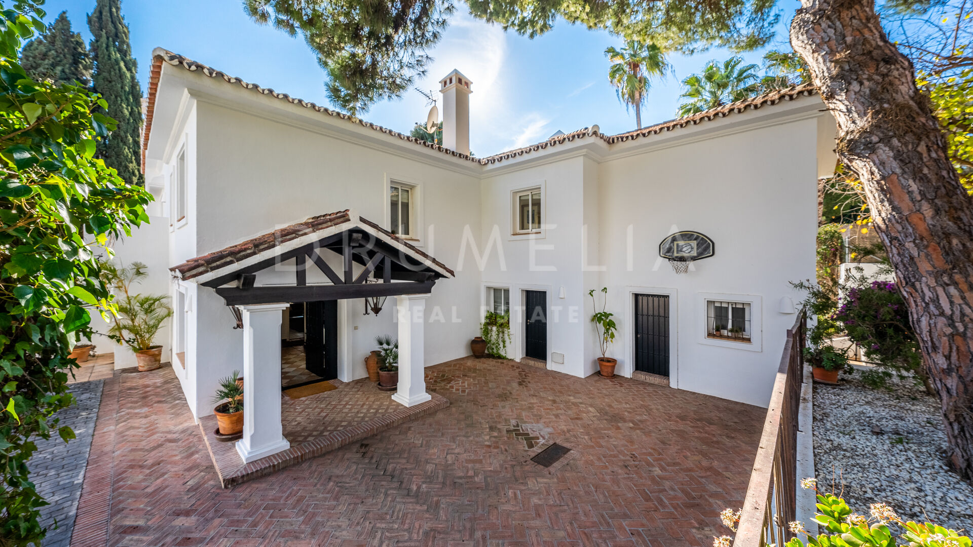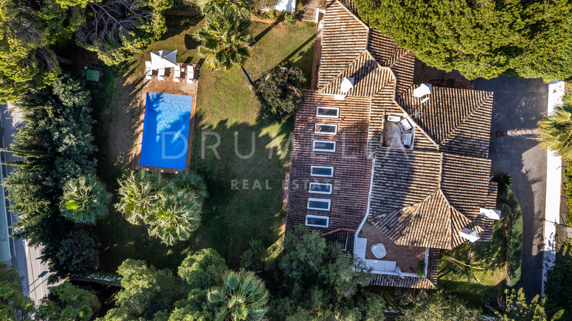 This beautiful and bright Mediterranean villa of 450m2 is set on the picturesque plot of 1900 m2 which is located in Nagüeles, one of the original luxury areas of Marbella, right in between two most prestigious parts of the town – the upper part called Sierra Blanca and the lower part of Golden Mile. Rocio de Nagueles is a very well- established residential area with stunning villas and lush subtropical vegetation. Its name is linked to Marbella’s glamorous past and remains a desirable place to live due to its prime location, the variety of great high- end properties, good infrastructure and proximity to the sea, mountains, world-famous Puerto Banus, all amenities of the 24-carat Golden Mile and the charming Old Center of the town.