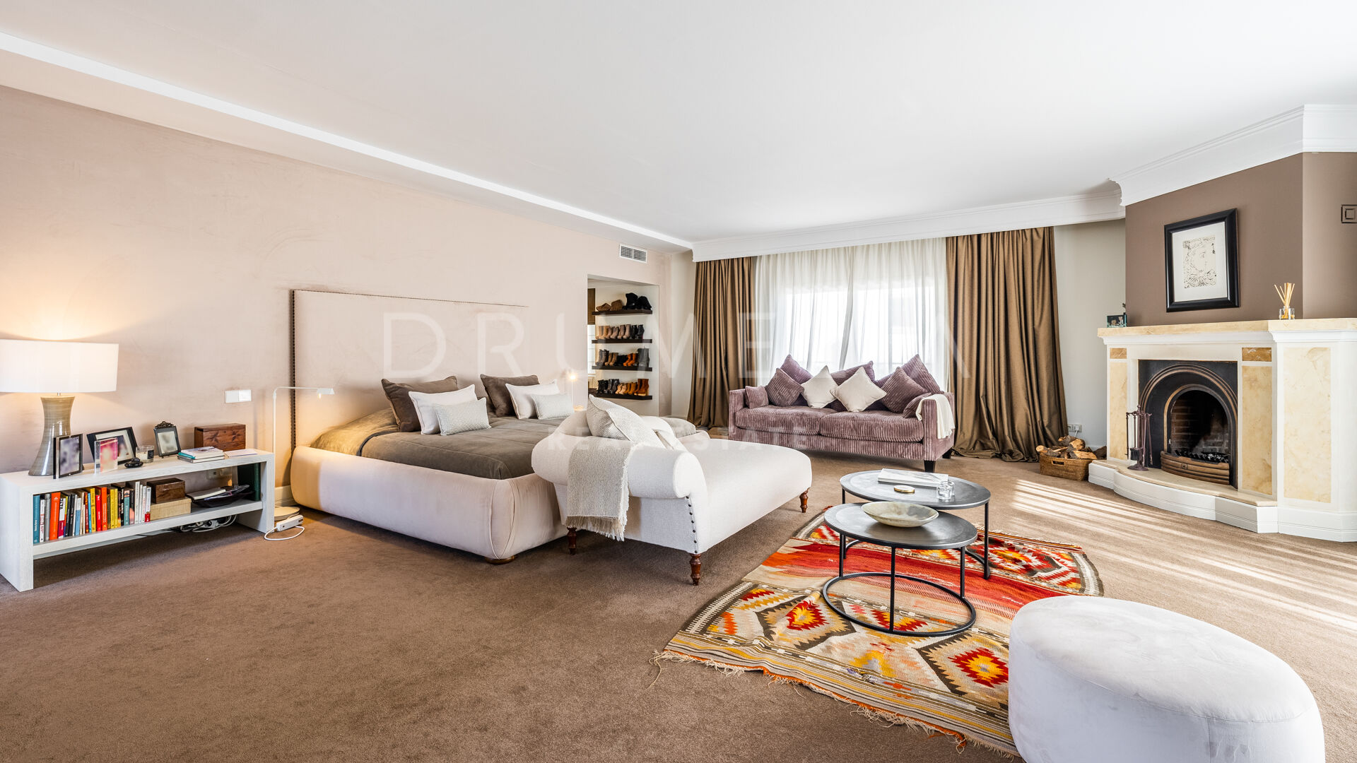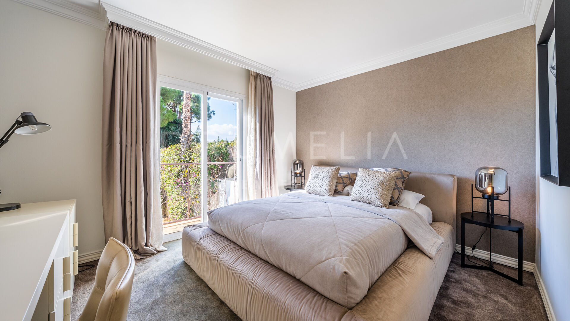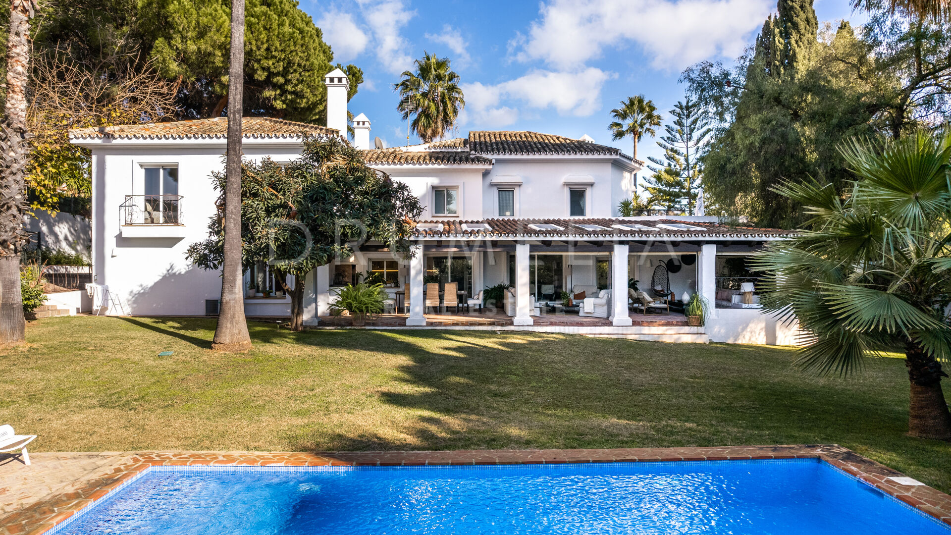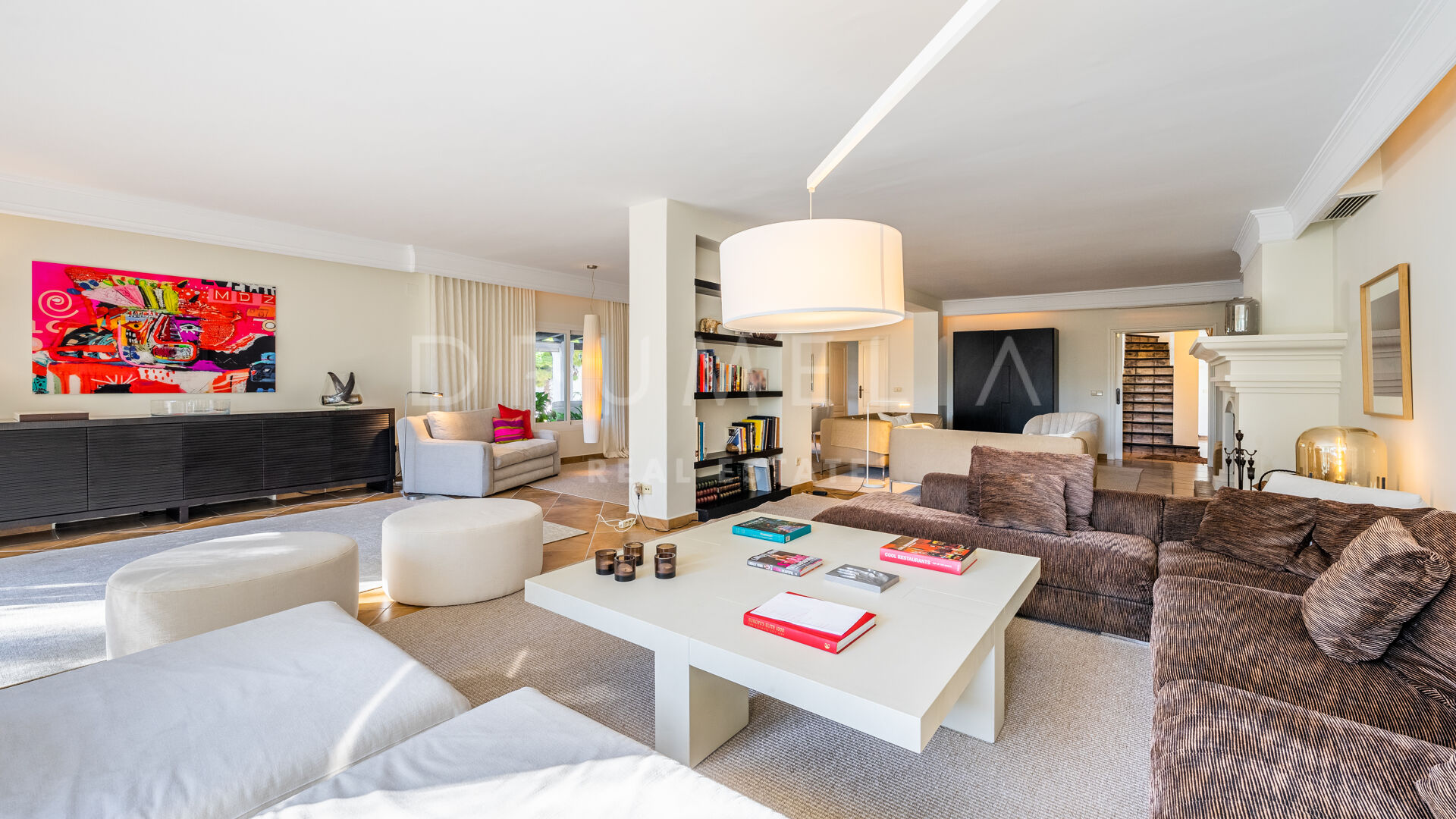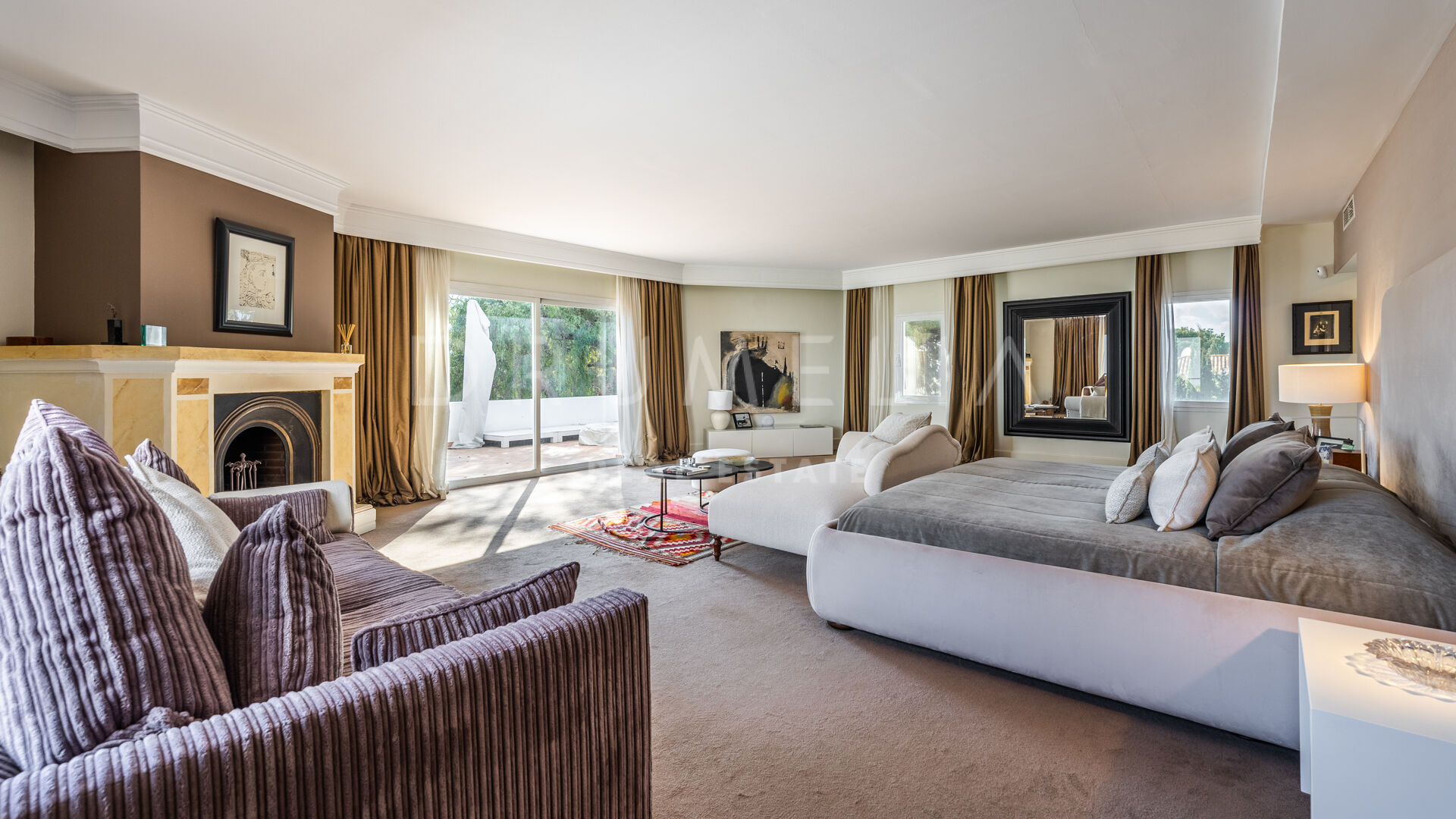 This beautiful and bright Mediterranean villa of 450m2 is set on the picturesque plot of 1900 m2 which is located in Nagüeles, one of the original luxury areas of Marbella, right in between two most prestigious parts of the town – the upper part called Sierra Blanca and the lower part of Golden Mile. Rocio de Nagueles is a very well- established residential area with stunning villas and lush subtropical vegetation. Its name is linked to Marbella’s glamorous past and remains a desirable place to live due to its prime location, the variety of great high- end properties, good infrastructure and proximity to the sea, mountains, world-famous Puerto Banus, all amenities of the 24-carat Golden Mile and the charming Old Center of the town.