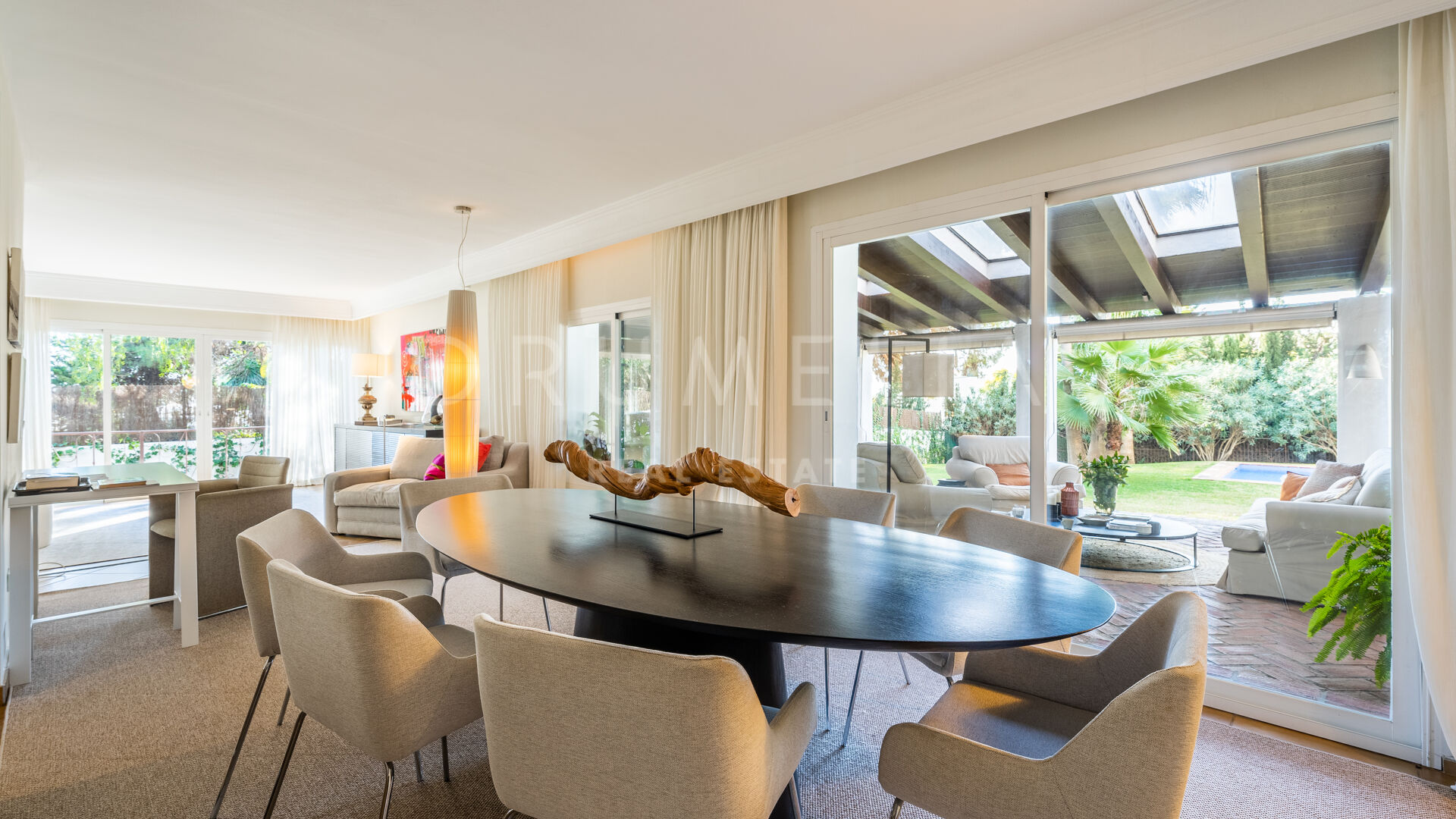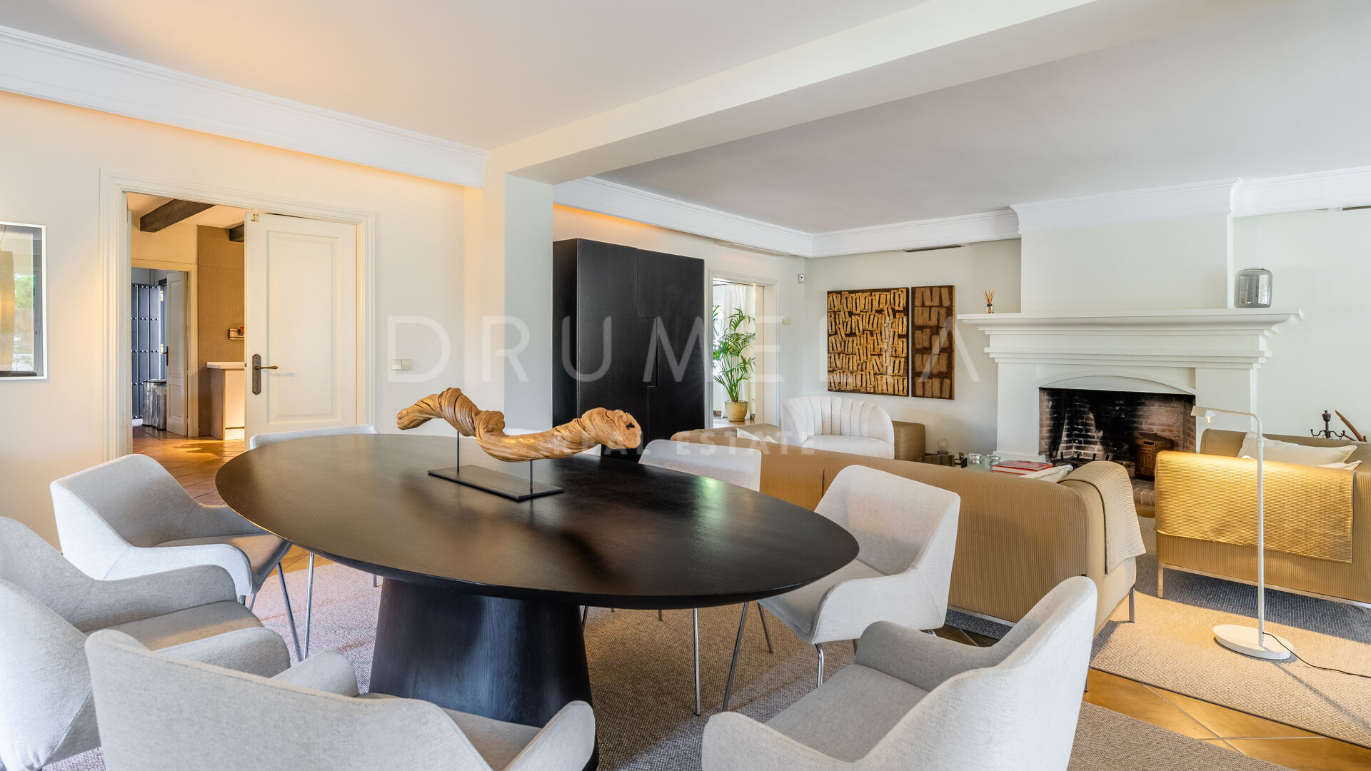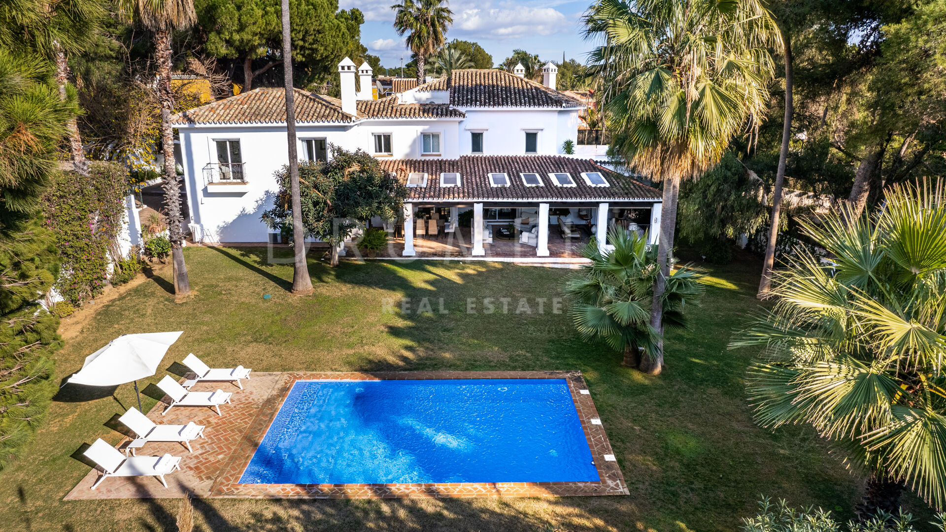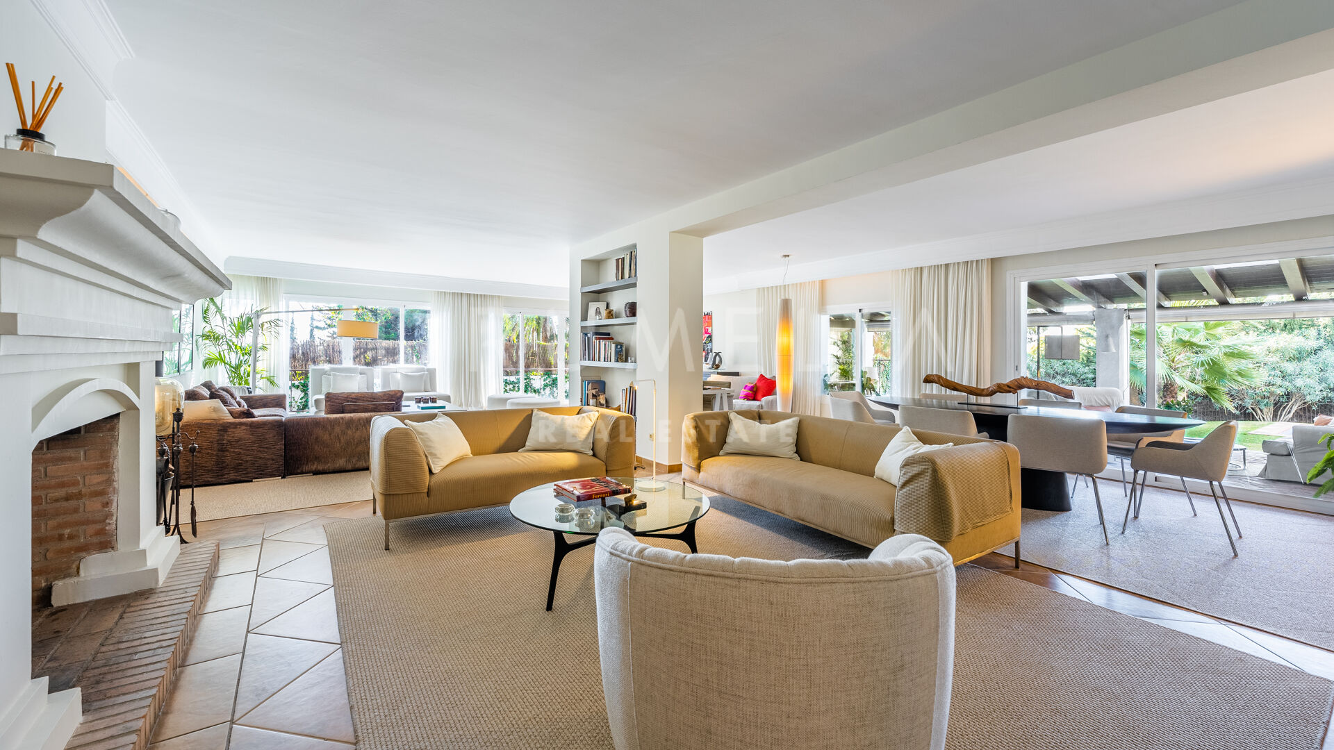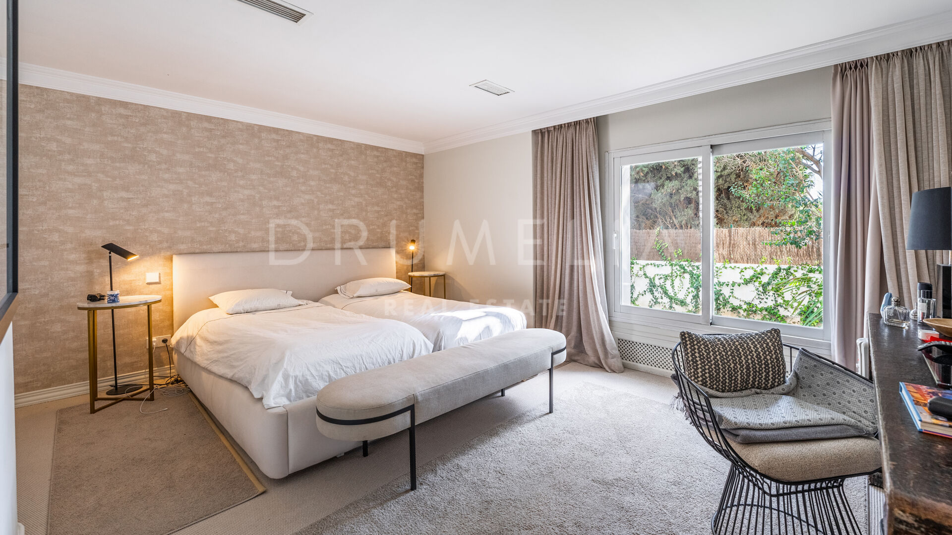 This beautiful and bright Mediterranean villa of 450m2 is set on the picturesque plot of 1900 m2 which is located in Nagüeles, one of the original luxury areas of Marbella, right in between two most prestigious parts of the town – the upper part called Sierra Blanca and the lower part of Golden Mile. Rocio de Nagueles is a very well- established residential area with stunning villas and lush subtropical vegetation. Its name is linked to Marbella’s glamorous past and remains a desirable place to live due to its prime location, the variety of great high- end properties, good infrastructure and proximity to the sea, mountains, world-famous Puerto Banus, all amenities of the 24-carat Golden Mile and the charming Old Center of the town.