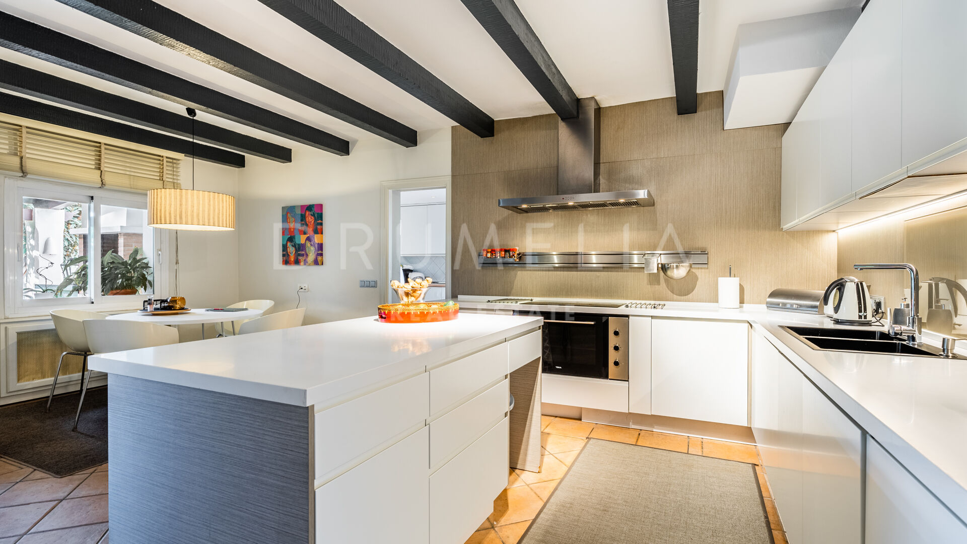 The luxury family villa has got a magnificent hall, 5 nice bedrooms, spacious living and dining rooms with access to a large stylish terrace and an outdoor dining area which is a practical and enjoyable place to relax, dine and socialise. Some lovely ethnic details in décor make the terrace look quite exotic. Luxury modern kitchen is cosy and elegant. It is linked to the laundry and storage room which has its own exit. The children’s room as well has its own exit to the lush subtropical garden.