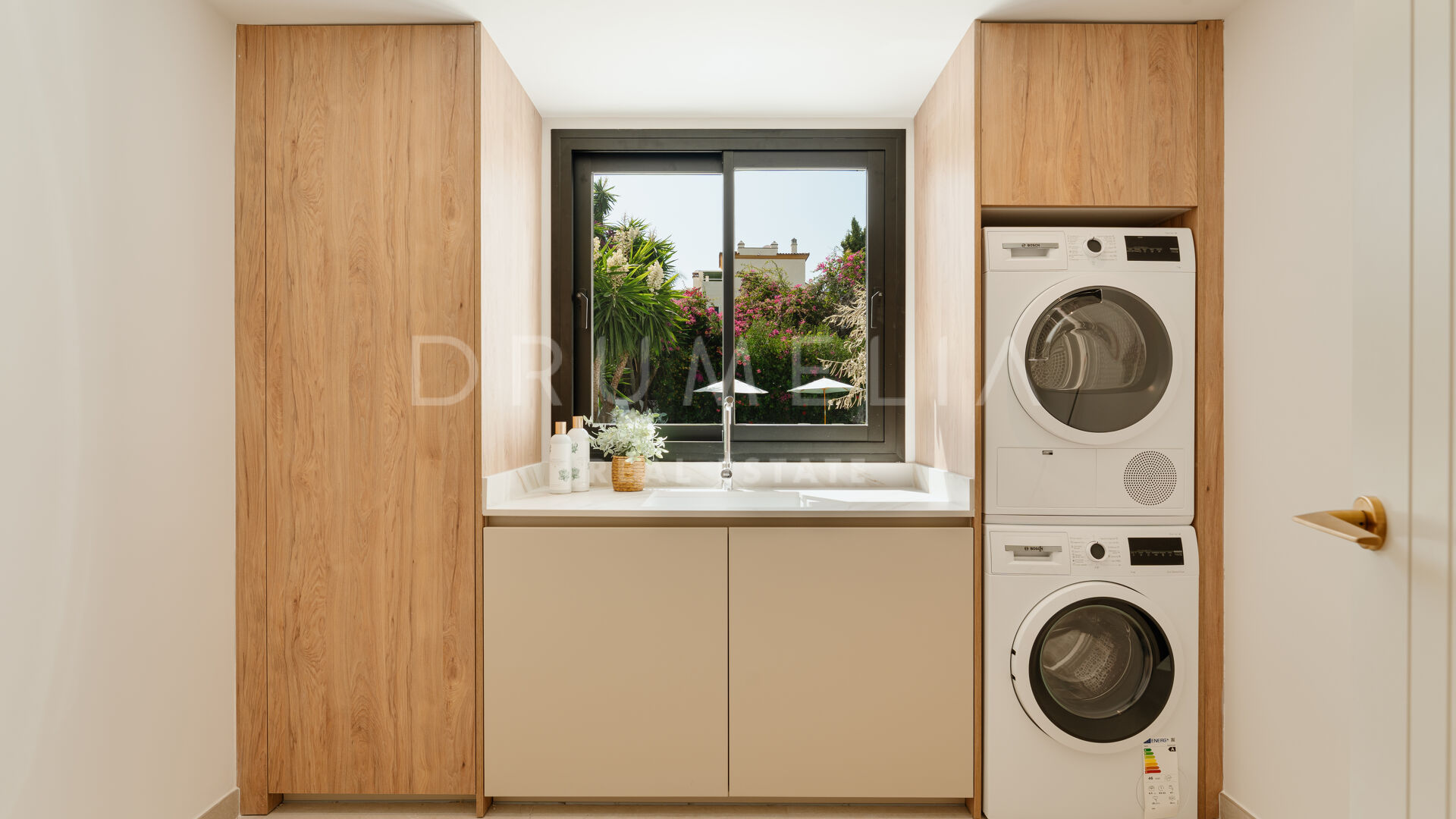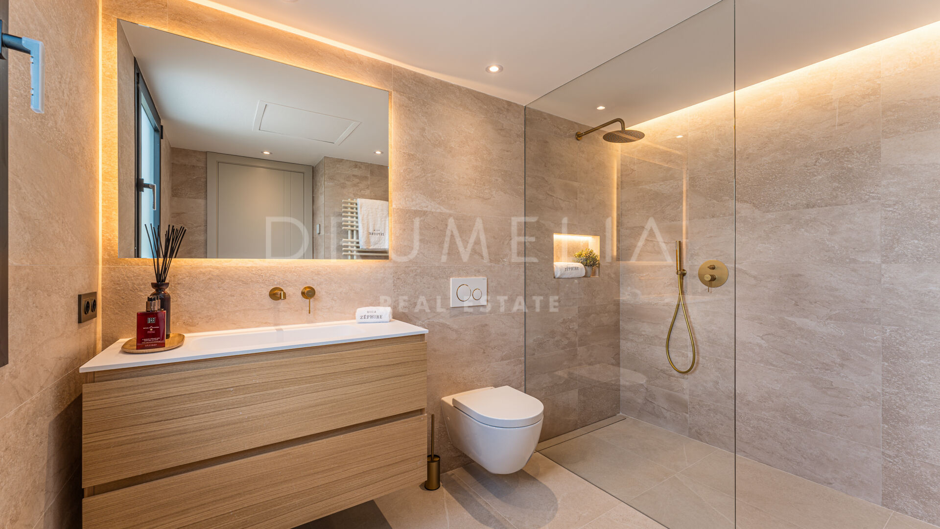 This elegant two-storey contemporary villa is located in one of the most exclusive residential areas next to Marbella’s Golden Mile. With four en-suite bedrooms, a guest toilet, and a layout designed for privacy and comfort, this property is ideal as both a family home and a high-end second residence. Its southwest orientation offers panoramic views of the Mediterranean Sea, while the sunny terraces and landscaped gardens with a heated pool invite relaxation year-round.