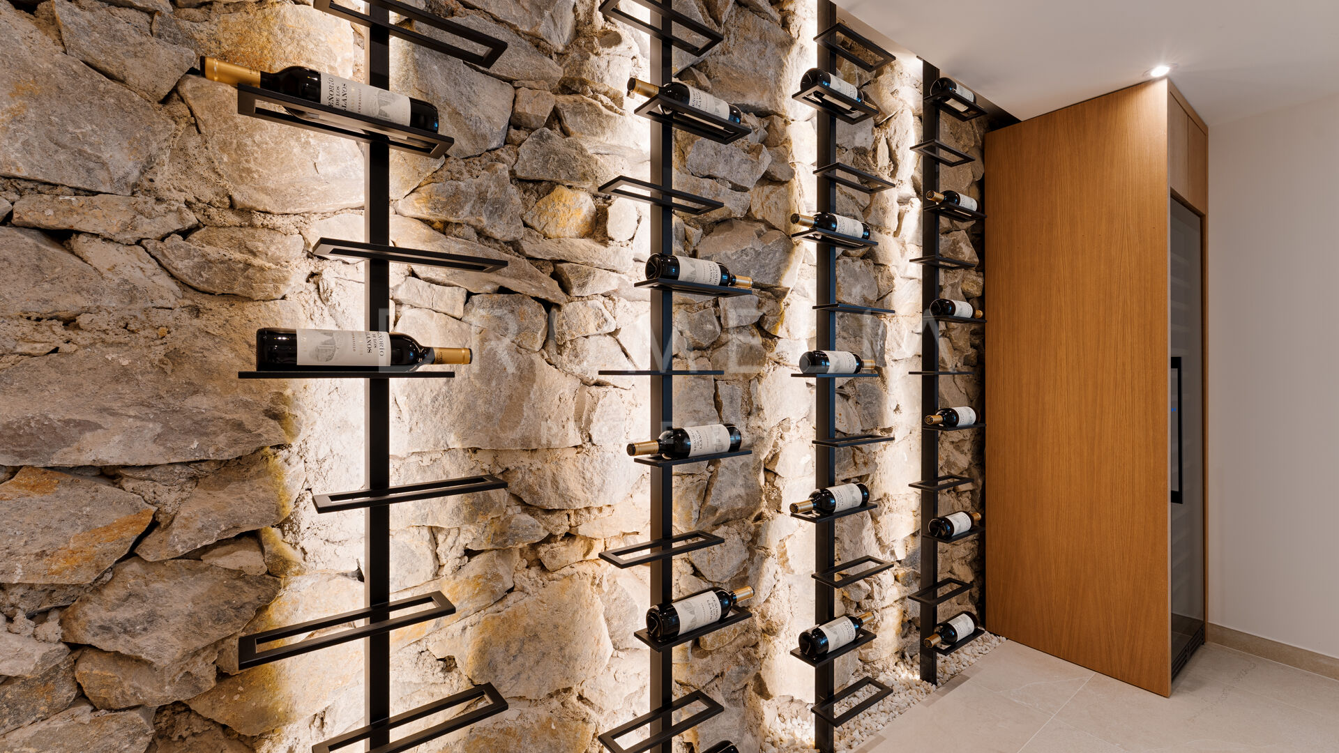The interior blends high-end materials with a modern design that flows naturally between the kitchen, dining, and living areas. It features a kitchen equipped with Bosch appliances, a wine cellar, electric shutters, outdoor kitchen, and smart home system. The minimalist-style furniture, included in the sale, allows for a move-in-ready experience with no need for renovations. An additional upgrade is planned for 2025, which will incorporate sustainable technologies and design improvements, further increasing its value and appeal.