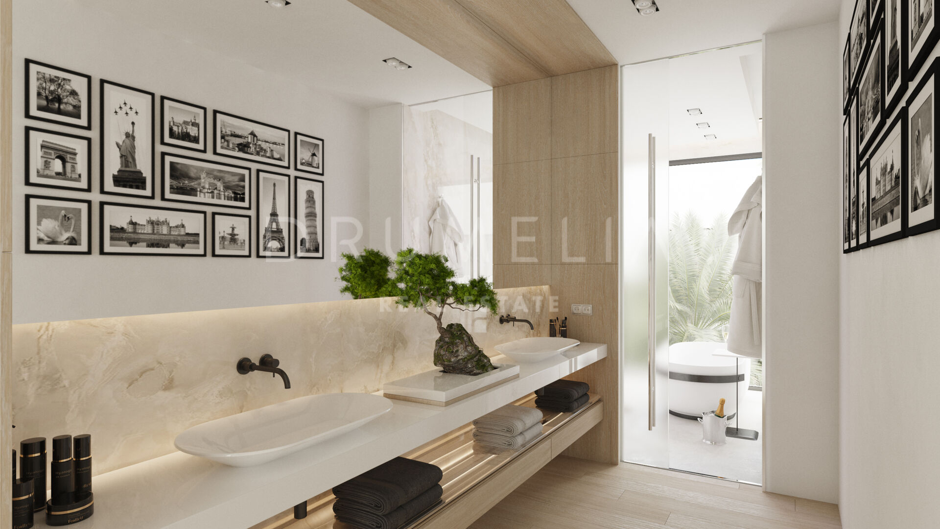 The basement includes guest accommodation, a spa with sauna and Turkish bath, gym, cinema room, lounge with indoor pool, wine cellar and a four-car garage. The main level features open living and dining areas, kitchen and two en-suite bedrooms. The upper level is dedicated to bedroom suites with private terraces, including the master suite. A rooftop solarium with panoramic sea views, jacuzzi and leisure areas completes the property.