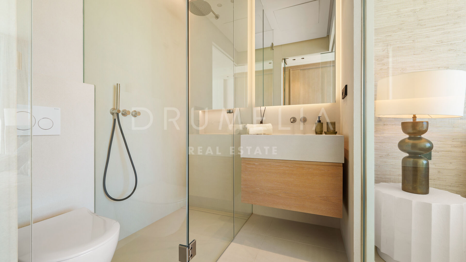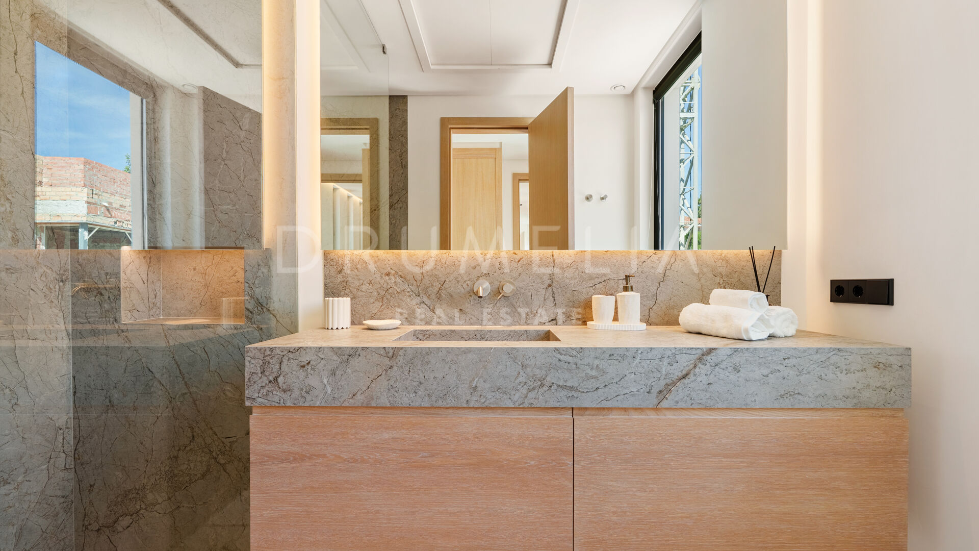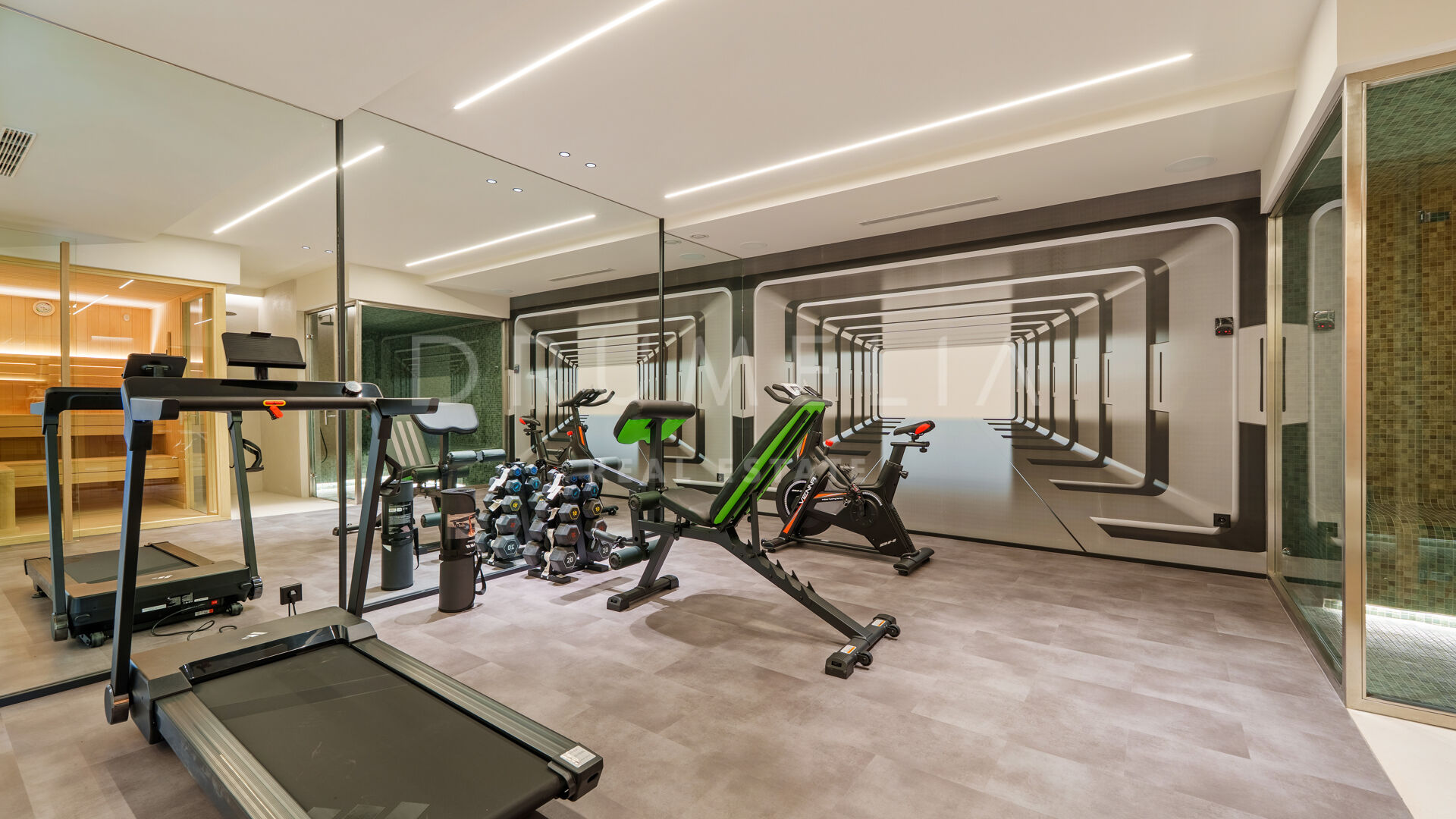 The private suites offer a serene retreat with glass doors opening onto terraces and en-suite bathrooms featuring floating vanities, marble accents and freestanding bathtubs. The main bedroom enjoys direct access to a sunlit terrace, while the lower level includes a complete wellness area with gym, sauna and steam room. A secure garage and landscaped entrance enhance privacy and comfort, making this home an ideal example of contemporary Mediterranean living in one of Marbella’s most sought-after coastal enclaves.