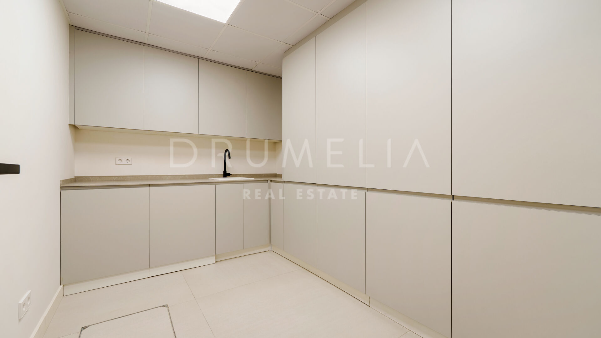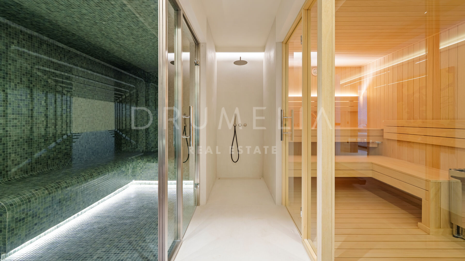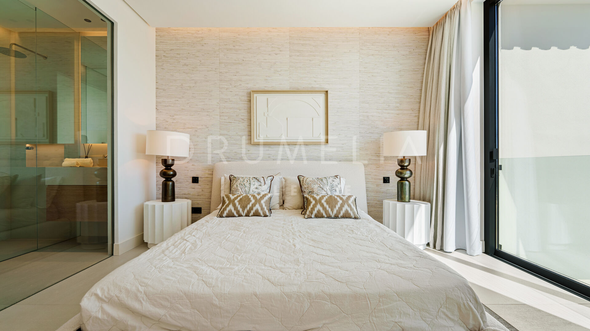 The private suites offer a serene retreat with glass doors opening onto terraces and en-suite bathrooms featuring floating vanities, marble accents and freestanding bathtubs. The main bedroom enjoys direct access to a sunlit terrace, while the lower level includes a complete wellness area with gym, sauna and steam room. A secure garage and landscaped entrance enhance privacy and comfort, making this home an ideal example of contemporary Mediterranean living in one of Marbella’s most sought-after coastal enclaves.