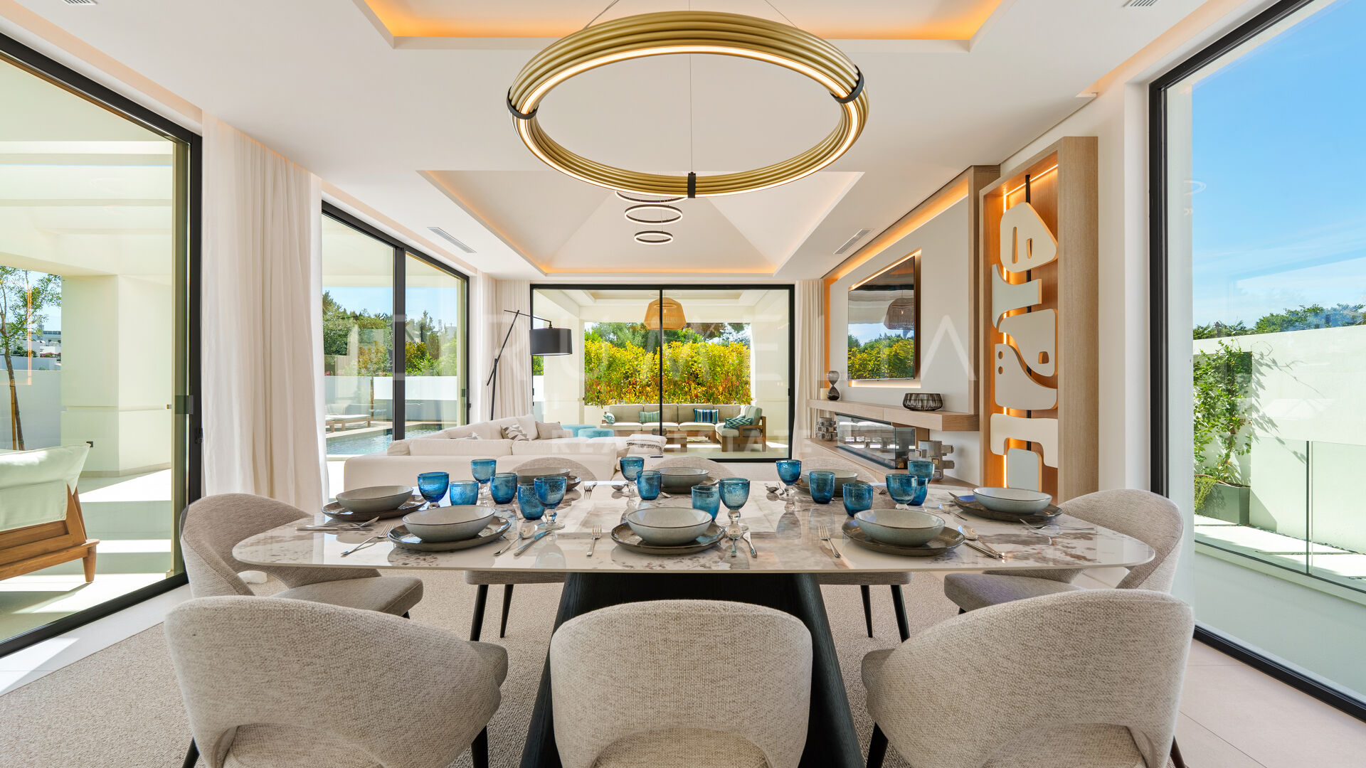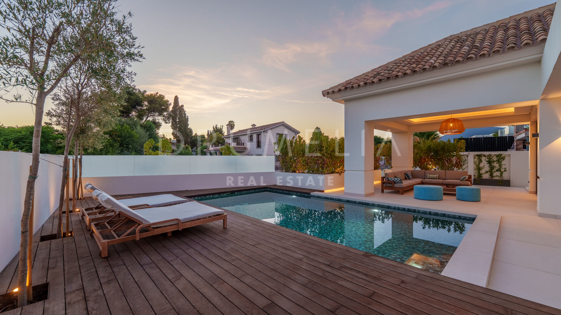 Located in the desirable Linda Vista Baja area of San Pedro de Alcántara, this contemporary residence combines modern architecture with refined coastal living. Behind its pristine white façade and landscaped gardens lies a private haven featuring a sparkling pool surrounded by wooden decking and generous terraces designed for outdoor dining and relaxation. A rooftop solarium offers additional space for entertaining while enjoying views of the Mediterranean sky.