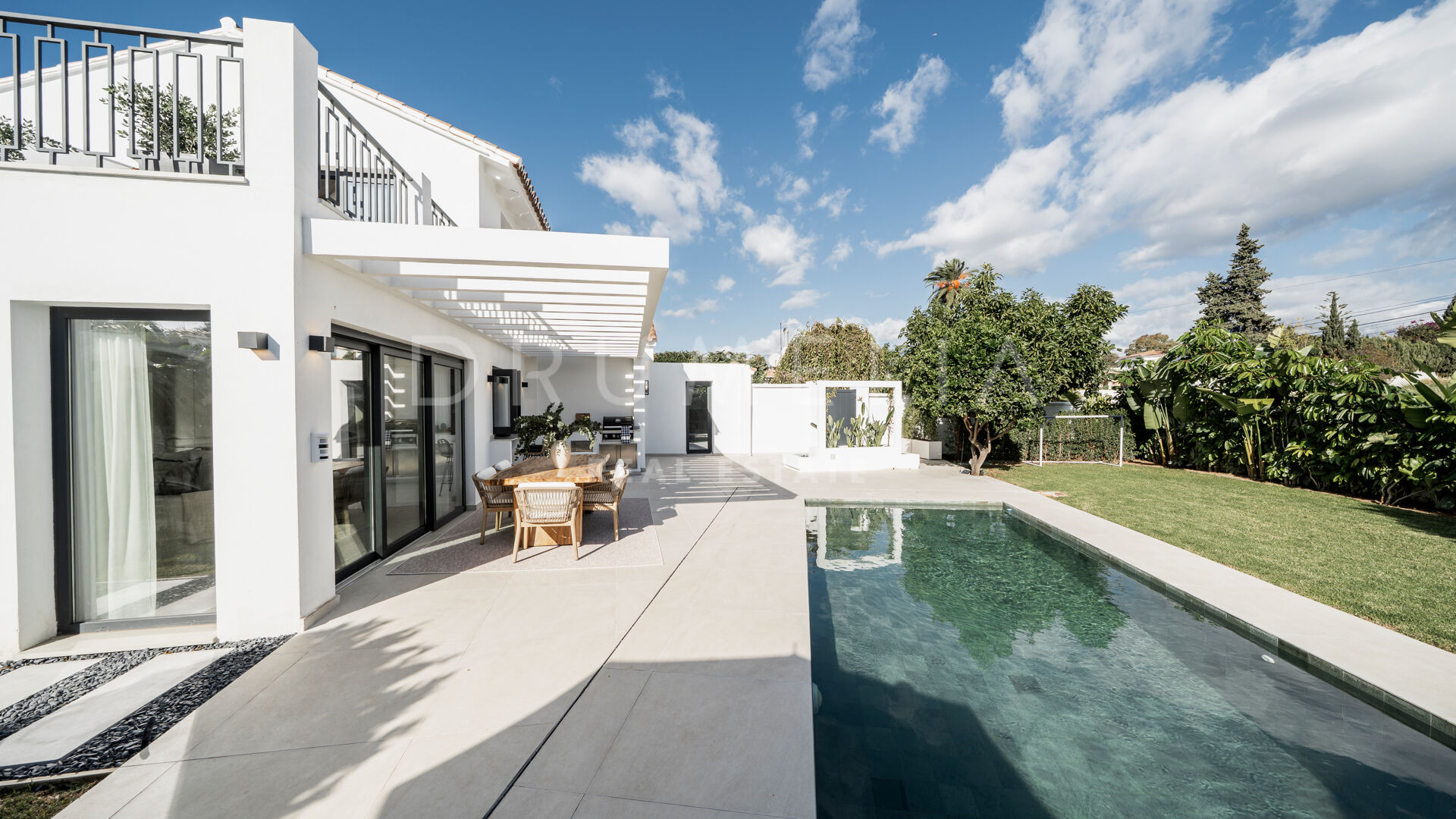 The exterior completes the home with covered and open terraces, a barbecue area, and landscaped gardens that enhance privacy and tranquillity. The heated swimming pool, together with open views of the natural surroundings, creates the perfect setting for relaxation or entertaining throughout the year. Its proximity to the beach, local amenities, and schools makes this property an excellent option for those seeking a modern, well-located villa in Marbella.